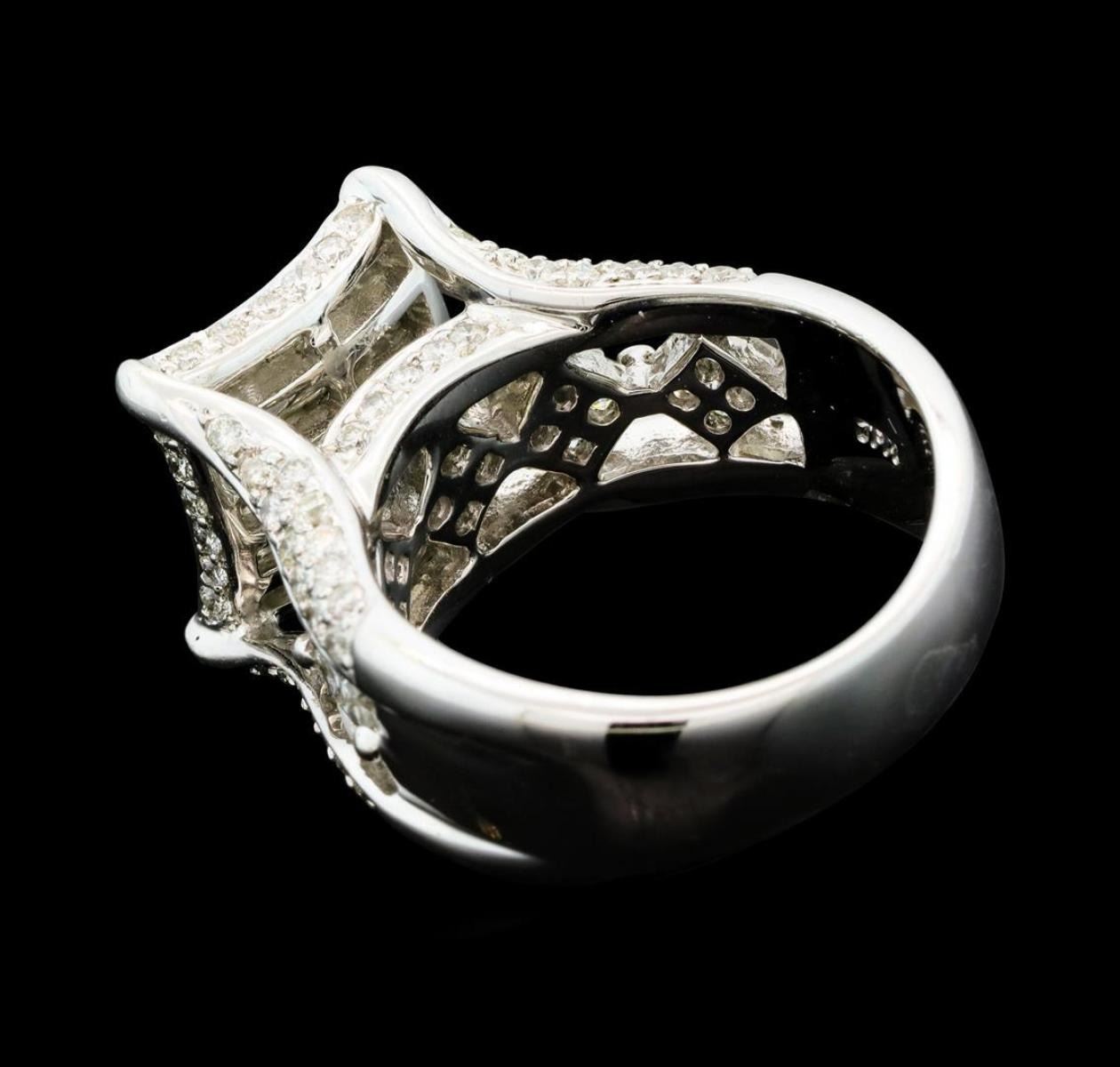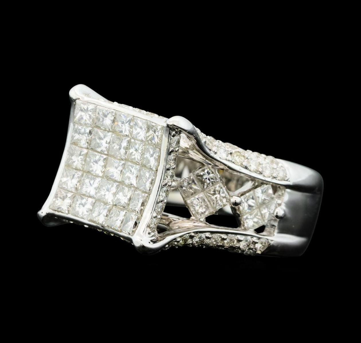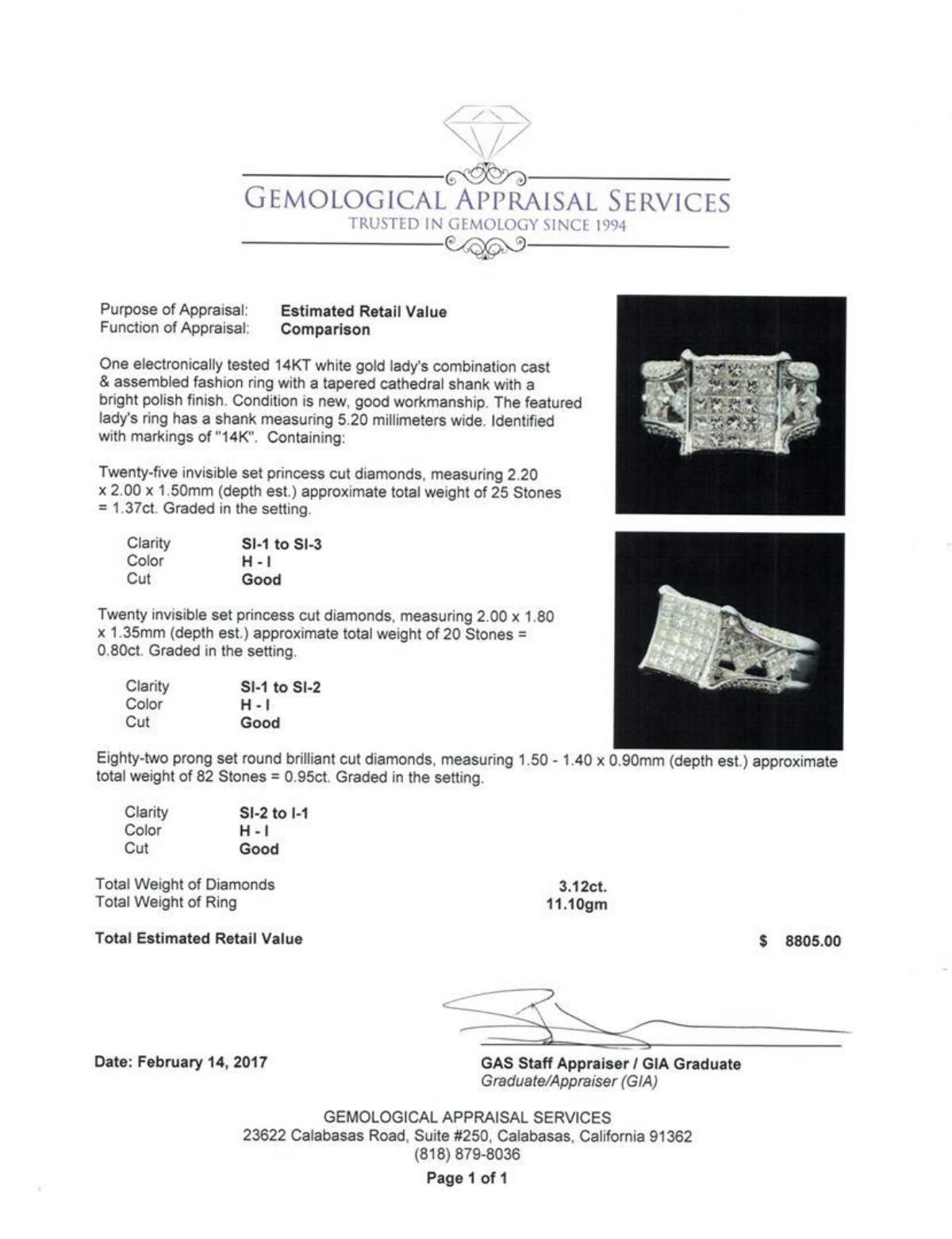 One electronically tested 14KT white gold lady's combination cast & assembled fashion ring with a tapered cathedral shank with a bright polish finish. The featured lady's ring has a shank measuring 5.20 millimeters wide. Identified with markings of '14K'. Condition is new, good workmanship. Containing: Twenty-Five invisible set princess cut diamonds, measuring 2.20 x 2.00 x 1.50mm (depth est.) approximate total weight of 25 Stones = 1.37ct. Graded in the setting. Clarity SI-1 to SI-3. Color: H - I Cut Good Twenty invisible set princess cut diamonds, measuring 2.00 x 1.80 x 1.35mm (depth est.) approximate total weight of 20 Stones = 0.80ct. Graded in the setting. Clarity SI-1 to SI-2. Color: H - I Cut Good Eighty-Two prong set round brilliant cut diamonds, measuring 1.50 - 1.40 x 0.90mm (depth est.) approximate total weight of 82 Stones = 0.95ct. Graded in the setting. Clarity SI-2 to I-1. Color: H - I Cut Good. Total Weight of Diamonds 3.12ct.. Total Weight of Ring 11.10gm. GAS Appraised.