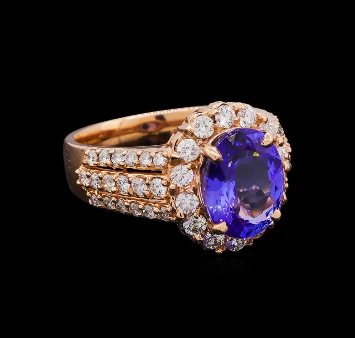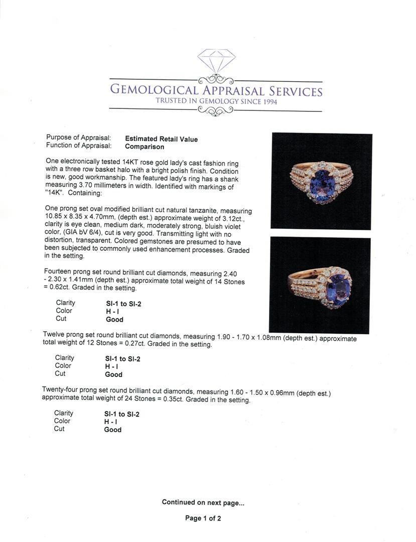 One electronically tested 14KT rose gold lady's cast fashion ring with a three row basket halo with a bright polish finish. The featured lady's ring has a shank measuring 3.70 millimeters in width. Identified with markings of "14K". Condition is new, good workmanship. Containing: One prong set oval modified brilliant cut natural tanzanite, measuring 10.85 x 8.35 x 4.70mm, (depth est.) approximate weight of 3.12ct., clarity is eye clean, medium dark, moderately strong, bluish violet color, (GIA bV 6/4), cut is very good. Transmitting light with no distortion, transparent. Colored gemstones are presumed to have been subjected to commonly used enhancement processes. Graded in the setting. Fourteen prong set round brilliant cut diamonds, measuring 2.40 - 2.30 x 1.41mm (depth est.) approximate total weight of 14 Stones = 0.62ct. Graded in the setting. Clarity: SI-1 to SI-2. Color: H - I. Cut Good Twelve prong set round brilliant cut diamonds, measuring 1.90 - 1.70 x 1.08mm (depth est.) approximate total weight of 12 Stones = 0.27ct. Graded in the setting. Clarity: SI-1 to SI-2. Color: H - I. Cut Good Twenty-Four prong set round brilliant cut diamonds, measuring 1.60 - 1.50 x 0.96mm (depth est.) approximate total weight of 24 Stones = 0.35ct. Graded in the setting. Clarity: SI-1 to SI-2. Color: H - I. Cut Good. Total Weight of Colored Stones 3.12ct. Total Weight of Diamonds 1.24ct. Total Weight of Ring 8.30gm. GAS Appraised.