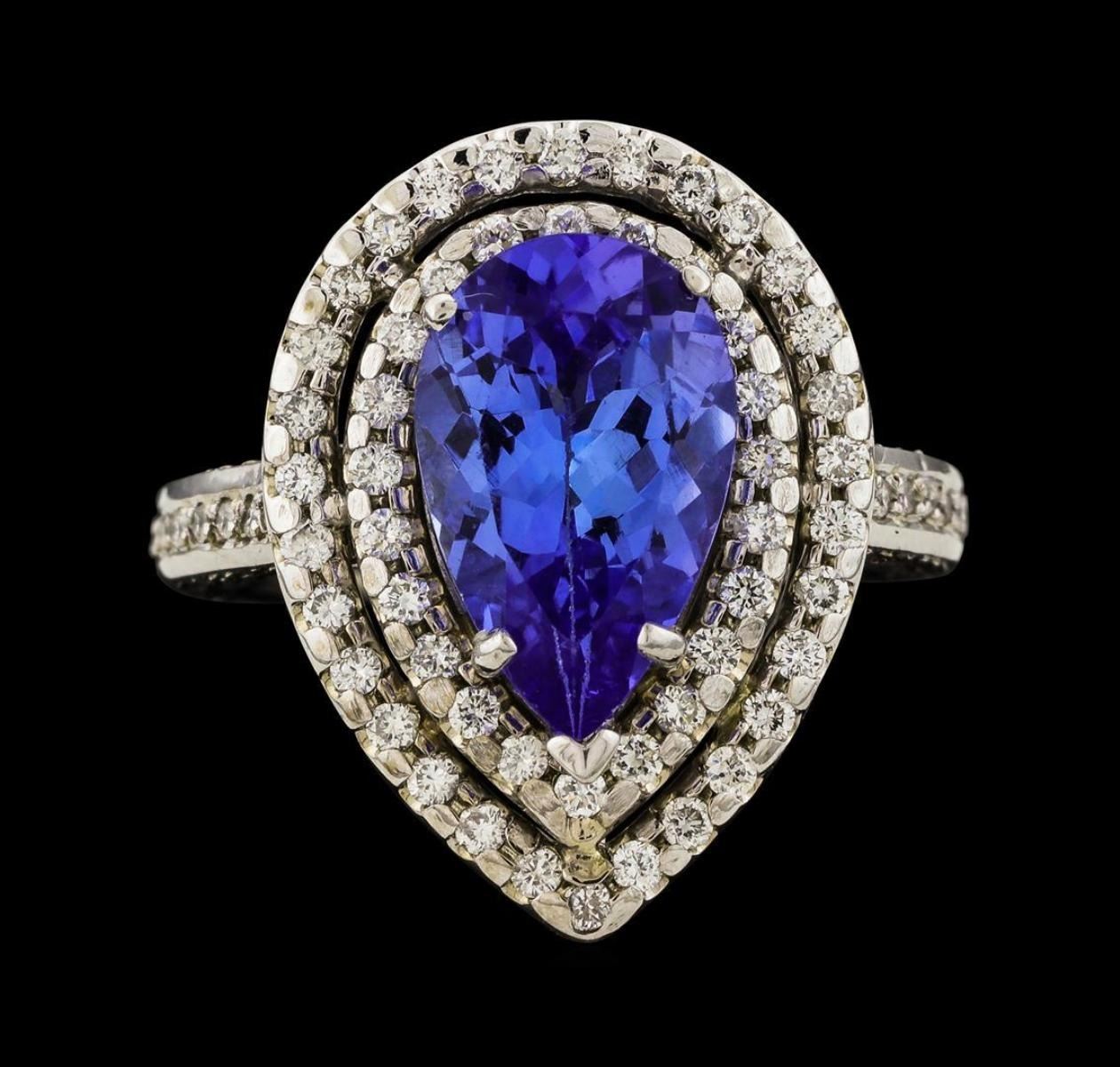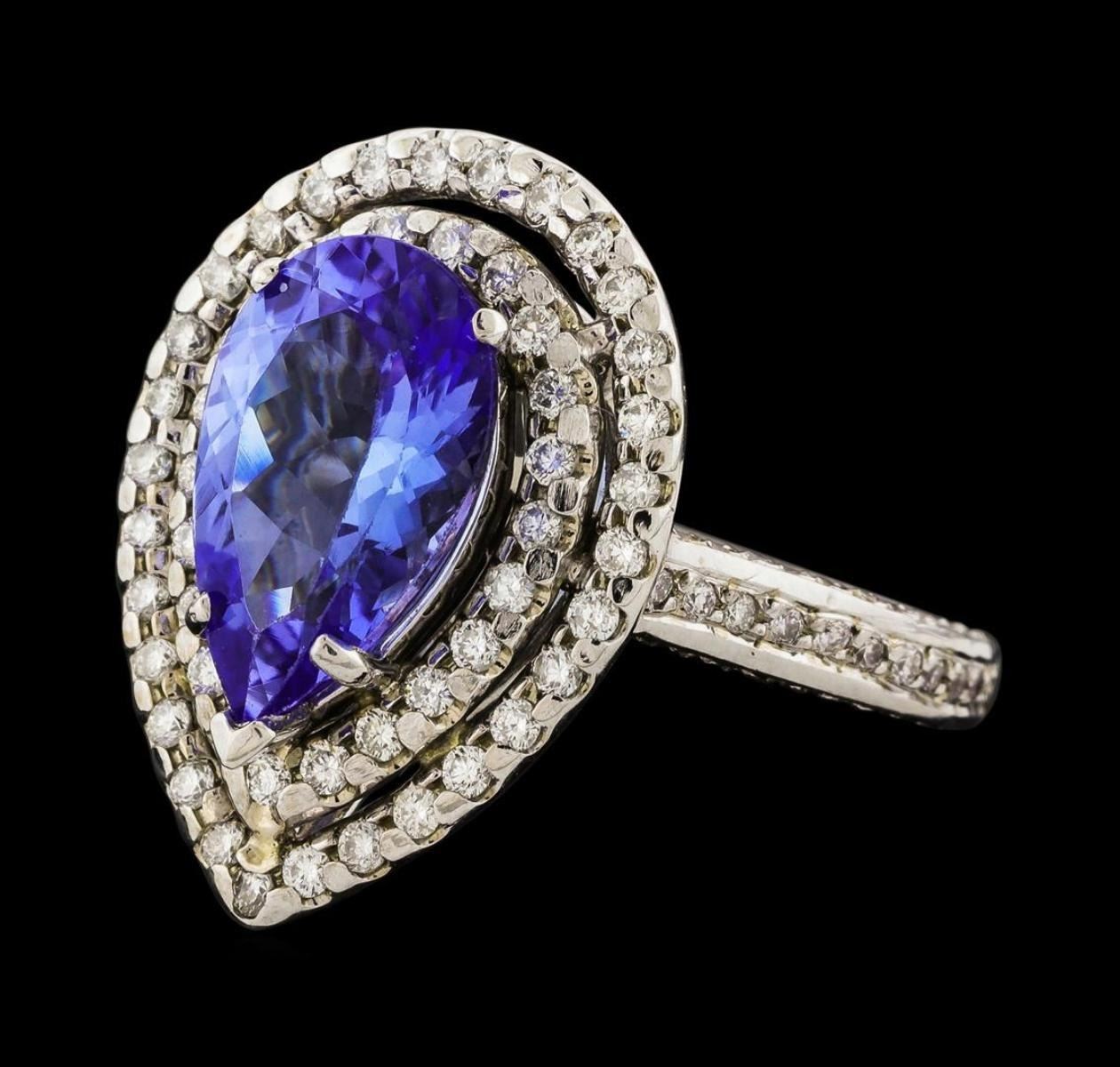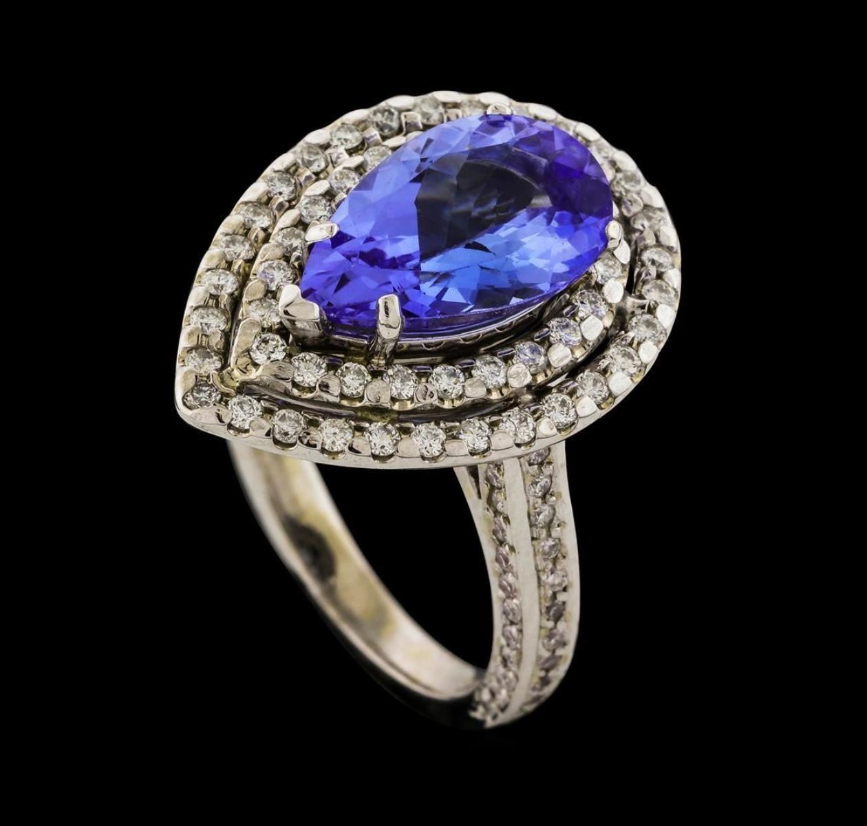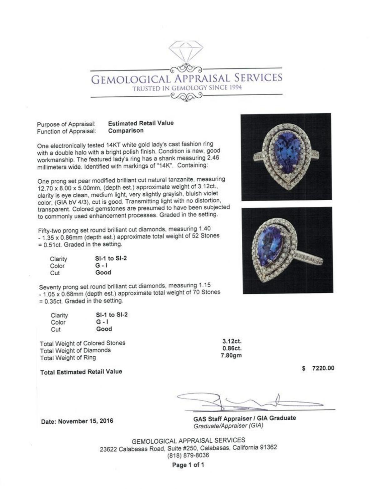 One electronically tested 14KT white gold lady's cast fashion ring with a double halo with a bright polish finish. The featured lady's ring has a shank measuring 2.46 millimeters wide. Identified with markings of '14K'. Condition is new, good workmanship. Containing: One prong set pear modified brilliant cut natural tanzanite, measuring 12.70 x 8.00 x 5.00mm, (depth est.) approximate weight of 3.12ct., clarity is eye clean, medium light, very slightly grayish, bluish violet color, (GIA bV 4/3), cut is good. Transmitting light with no distortion, transparent. Colored gemstones are presumed to have been subjected to commonly used enhancement processes. Graded in the setting. Fifty-Two prong set round brilliant cut diamonds, measuring 1.40 - 1.35 x 0.86mm (depth est.) approximate total weight of 52 Stones = 0.51ct. Graded in the setting. Clarity SI-1 to SI-2. Color: G - I Cut Good Seventy prong set round brilliant cut diamonds, measuring 1.15 - 1.05 x 0.68mm (depth est.) approximate total weight of 70 Stones = 0.35ct. Graded in the setting. Clarity SI-1 to SI-2. Color: G - I Cut Good. Total Weight of Colored Stones 3.12ct.. Total Weight of Diamonds 0.86ct.. Total Weight of Ring 7.80gm. GAS Appraised.