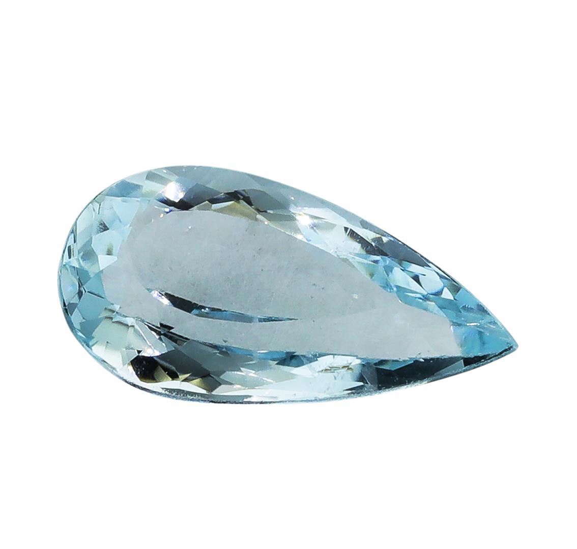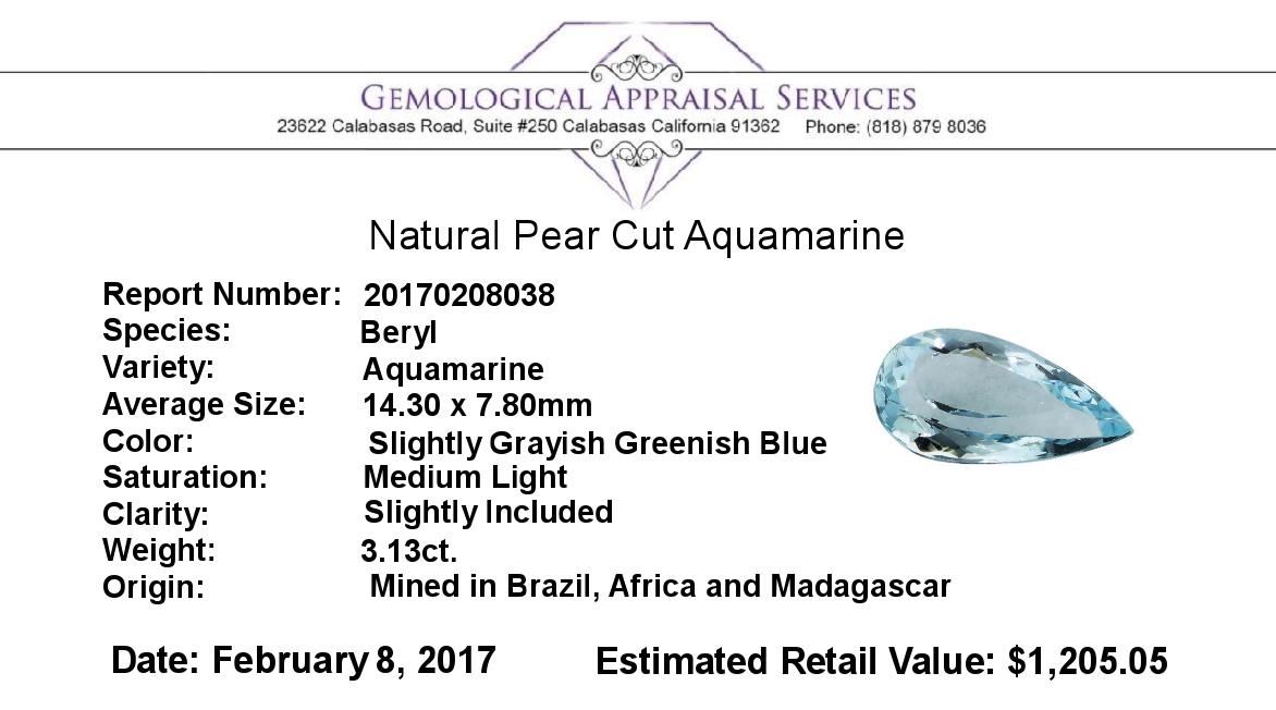 One natural pear cut aquamarine with an exact weight of 3.13ct., clarity is slightly included, slightly grayish greenish blue, medium light. Gemological Appraisals Services estimates the retail value at $1205.05 GAS Appraised.