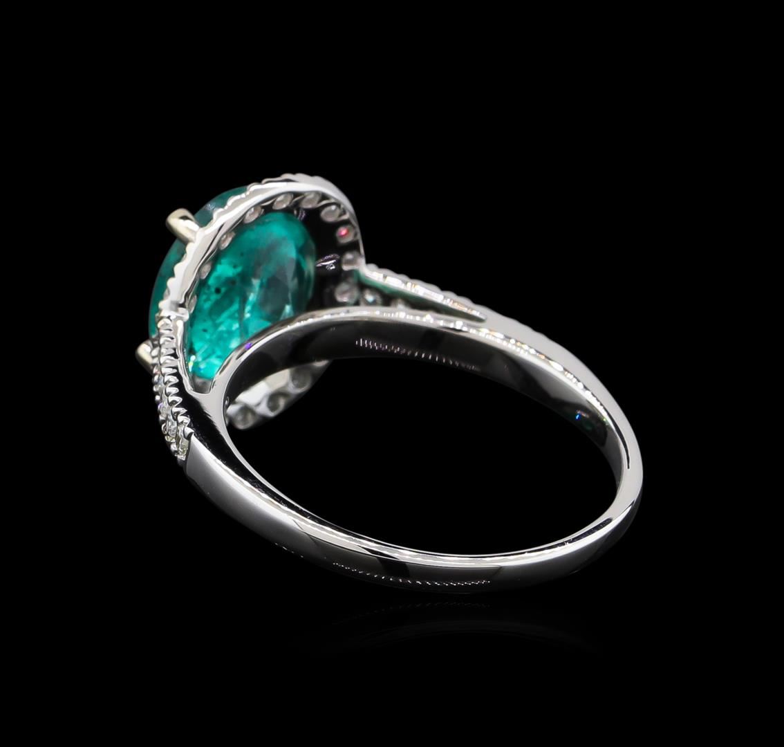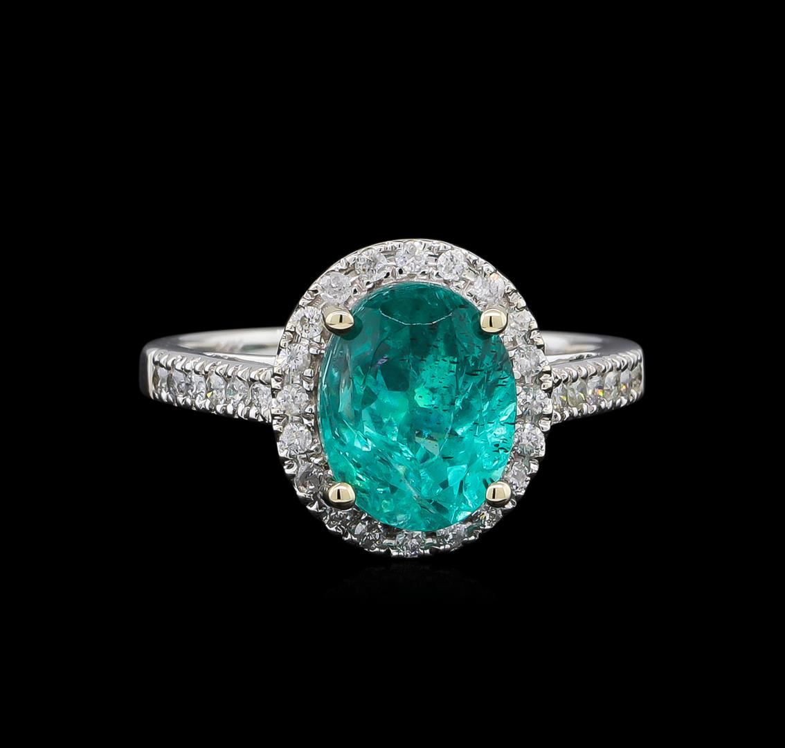 One electronically tested 14KT white gold lady's cast cathedral halo ring with a bright polish finish. The featured ladies ring has a shank measuring 1.71 millimeters in width. Trademark is Orianne. Identified with markings of "14K". Condition is new, good workmanship. Containing: One prong set oval modified brilliant cut natural apatite, measuring 10.00 x 7.96 x 5.75mm, 3%. bulge factor, approximate weight of 3.14ct., clarity is moderately included, medium, moderately strong, bluish green color, (GIA bG 5/4), cut is good. Transmitting light somewhat diffusely, semi-transparent to translucent. Colored gemstones are presumed to have been subjected to commonly used enhancement processes. Graded in the setting. Twelve prong set round brilliant cut diamonds, measuring 1.45 - 1.40 x 0.90mm (depth est.) approximate total weight of 12 Stones = 0.14ct. Graded in the setting. Clarity: SI-2 to I-1. Color: H - I. Cut Very Good Twenty prong set round brilliant cut diamonds, measuring 1.40 - 1.30 x 0.81mm (depth est.) approximate total weight of 20 Stones = 0.19ct. Graded in the setting. Clarity: SI-2 to I-1. Color: H - I. Cut Good. Total Weight of Colored Stones 3.14ct. Total Weight of Diamonds 0.33ct. Total Weight of Ring 3.50gm. GAS Appraised at $3,275.00.