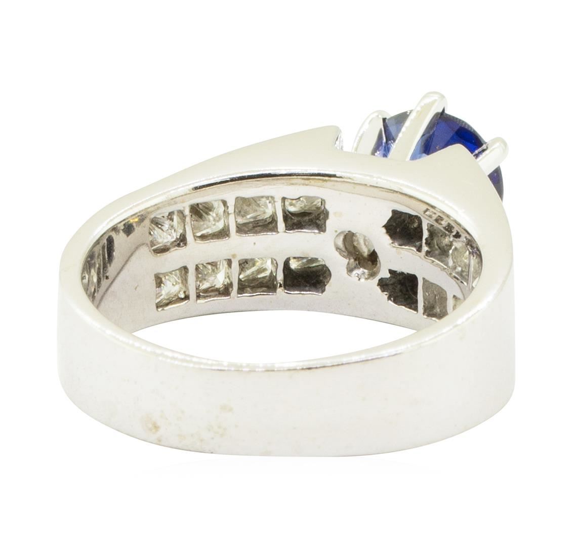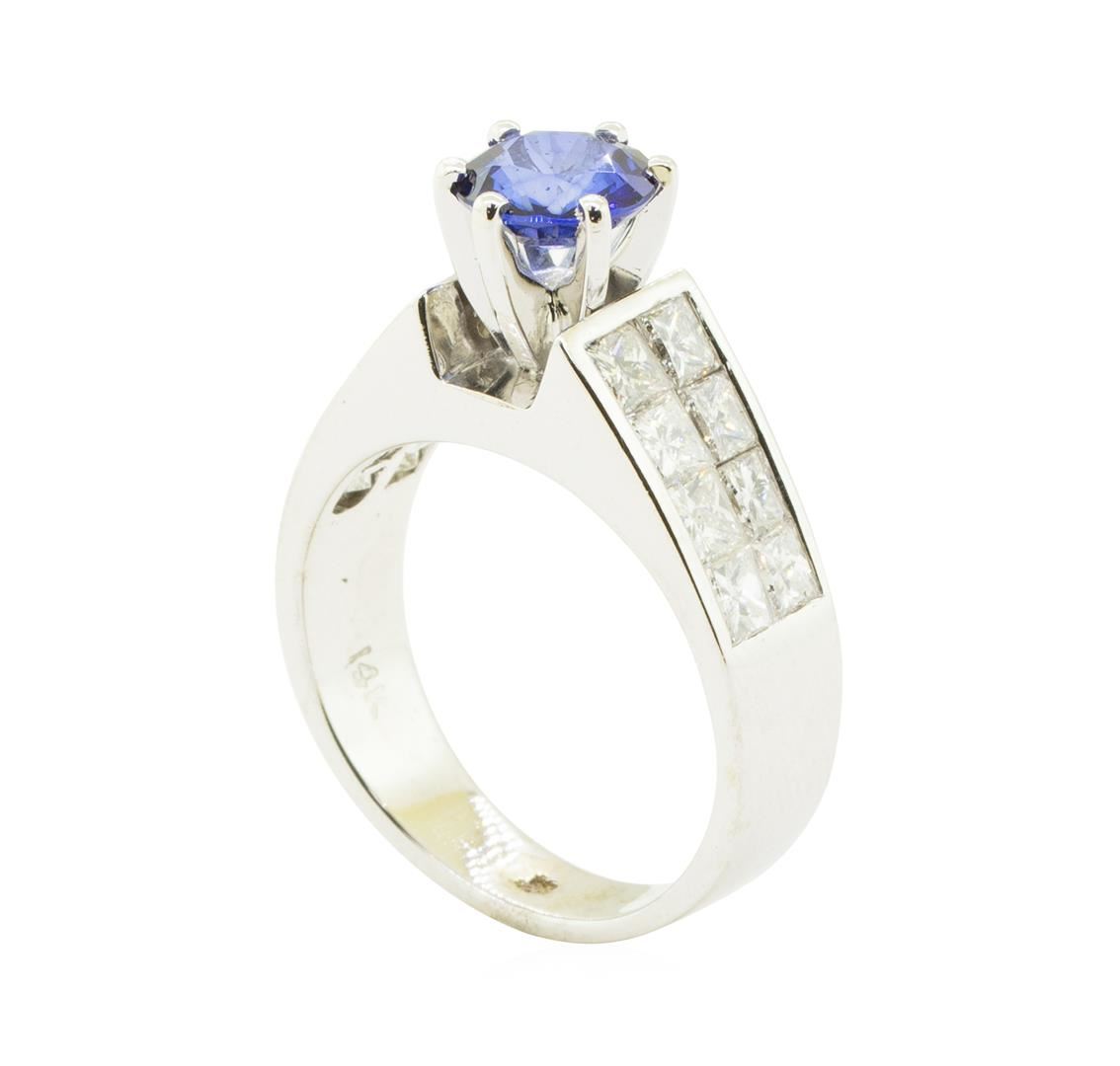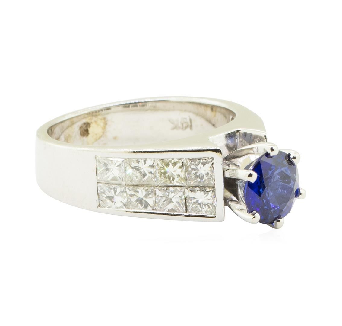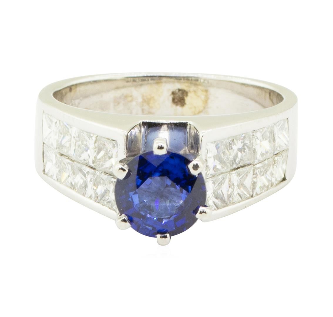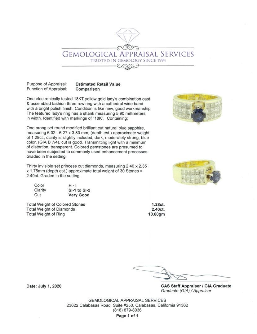 One electronically tested 14KT white gold lady's combination cast & assembled fashion double row ring with a wide band cathedral motif with a bright polish finish. The featured lady's ring has a shank measuring 4.20 millimeters in width. Identified with markings of '14K'. Condition is like new, good workmanship. Containing: One prong set round modified brilliant cut natural blue sapphire, measuring 6.80 - 6.76 x 3.40 mm, (depth est.) approximate weight of 1.30ct., clarity is eye clean, medium dark, strong, blue color, (GIA B 6/5), cut is very good. Transmitting light with a minimum of distortion, transparent. Colored gemstones are presumed to have been subjected to commonly used enhancement processes. Graded in the setting. Sixteen invisible set princess cut diamonds, measuring 3.00 x 2.50 x 1.88mm (depth est.) approximate total weight of 16 Stones = 1.85ct. Graded in the setting. Color H - I Clarity VS-1 to VS-2 Cut Very Good. Total Weight of Colored Stones 1.30ct.. Total Weight of Diamonds 1.85ct.. Total Weight of Ring 7.30gm GAS Appraised at $5720.00. GAS Appraised.