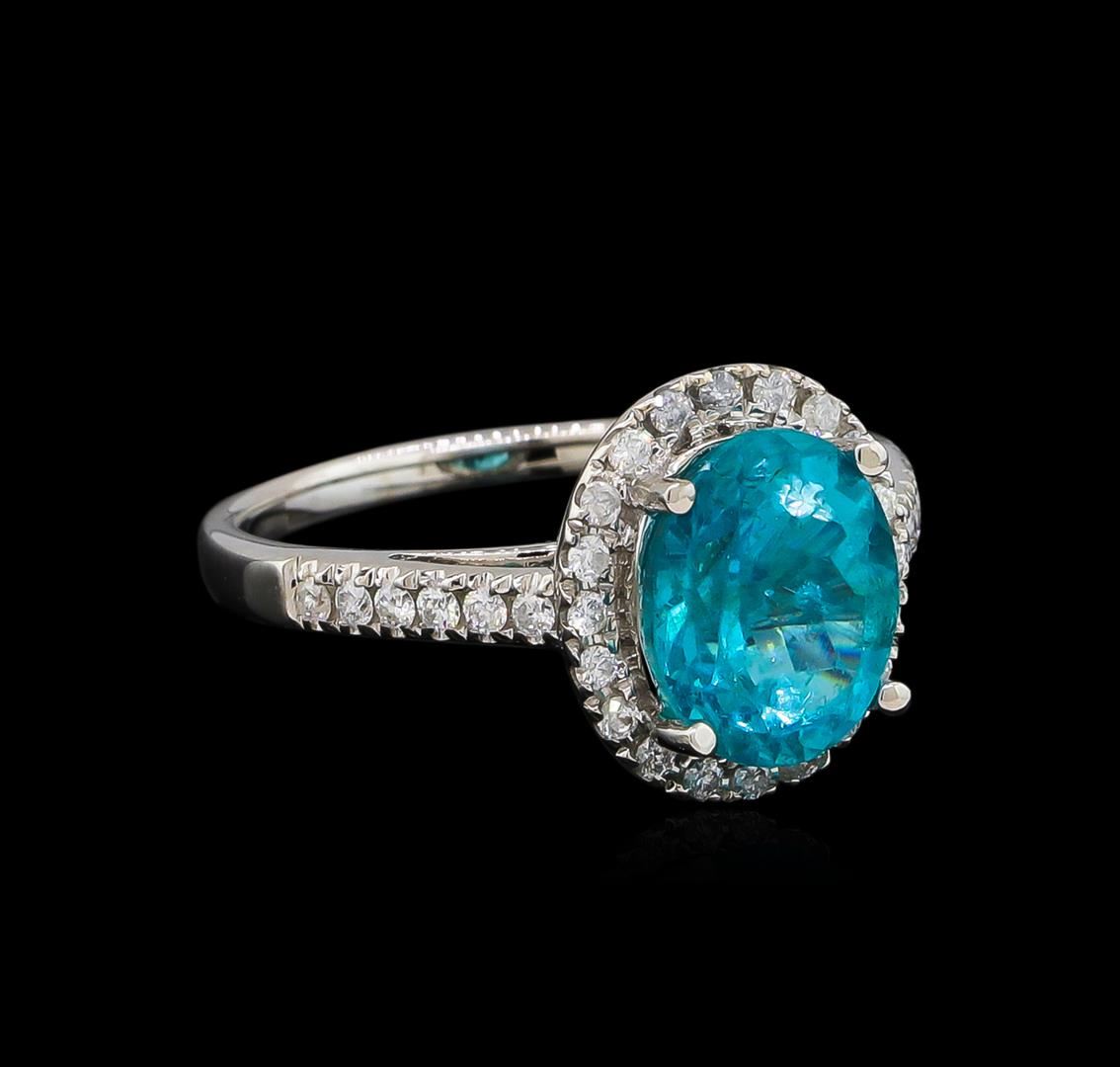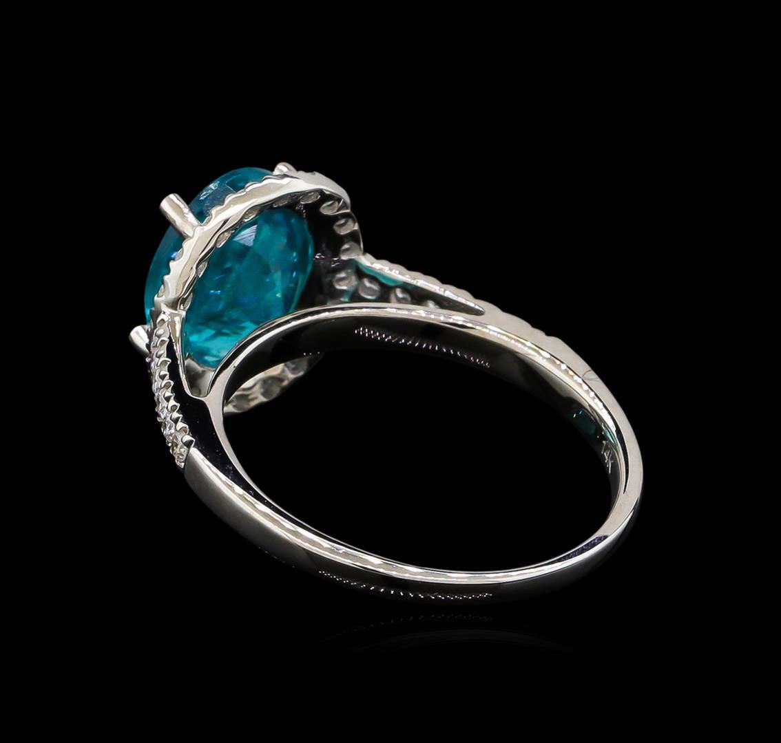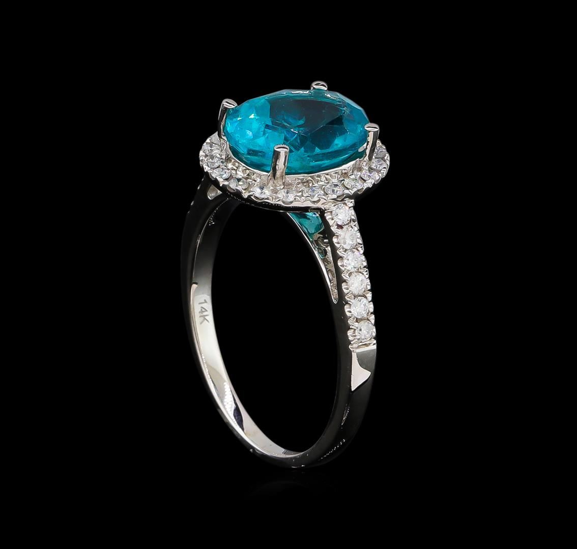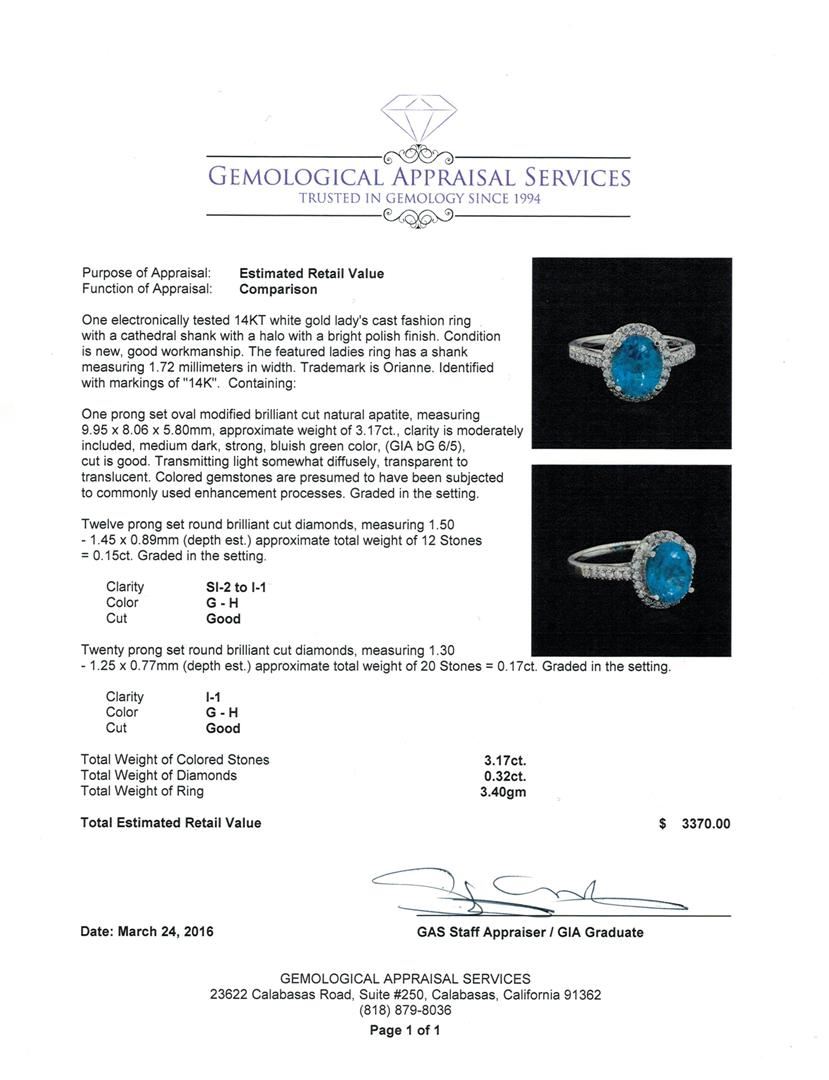 One electronically tested 14KT white gold lady's cast fashion ring with a cathedral shank with a halo with a bright polish finish. The featured ladies ring has a shank measuring 1.72 millimeters in width. Trademark is Orianne. Identified with markings of "14K". Condition is new, good workmanship. Containing: One prong set oval modified brilliant cut natural apatite, measuring 9.95 x 8.06 x 5.80mm, approximate weight of 3.17ct., clarity is moderately included, medium dark, strong, bluish green color, (GIA bG 6/5), cut is good. Transmitting light somewhat diffusely, transparent to translucent. Colored gemstones are presumed to have been subjected to commonly used enhancement processes. Graded in the setting. Twelve prong set round brilliant cut diamonds, measuring 1.50 - 1.45 x 0.89mm (depth est.) approximate total weight of 12 Stones = 0.15ct. Graded in the setting. Clarity: SI-2 to I-1. Color: G - Good Twenty prong set round brilliant cut diamonds, measuring 1.30 - 1.25 x 0.77mm (depth est.) approximate total weight of 20 Stones = 0.17ct. Graded in the setting. Clarity: I-1. Color: G - Good. Total Weight of Colored Stones 3.17ct. Total Weight of Diamonds 0.32ct. Total Weight of Ring 3.40gm. GAS Appraised at $3,370.00.