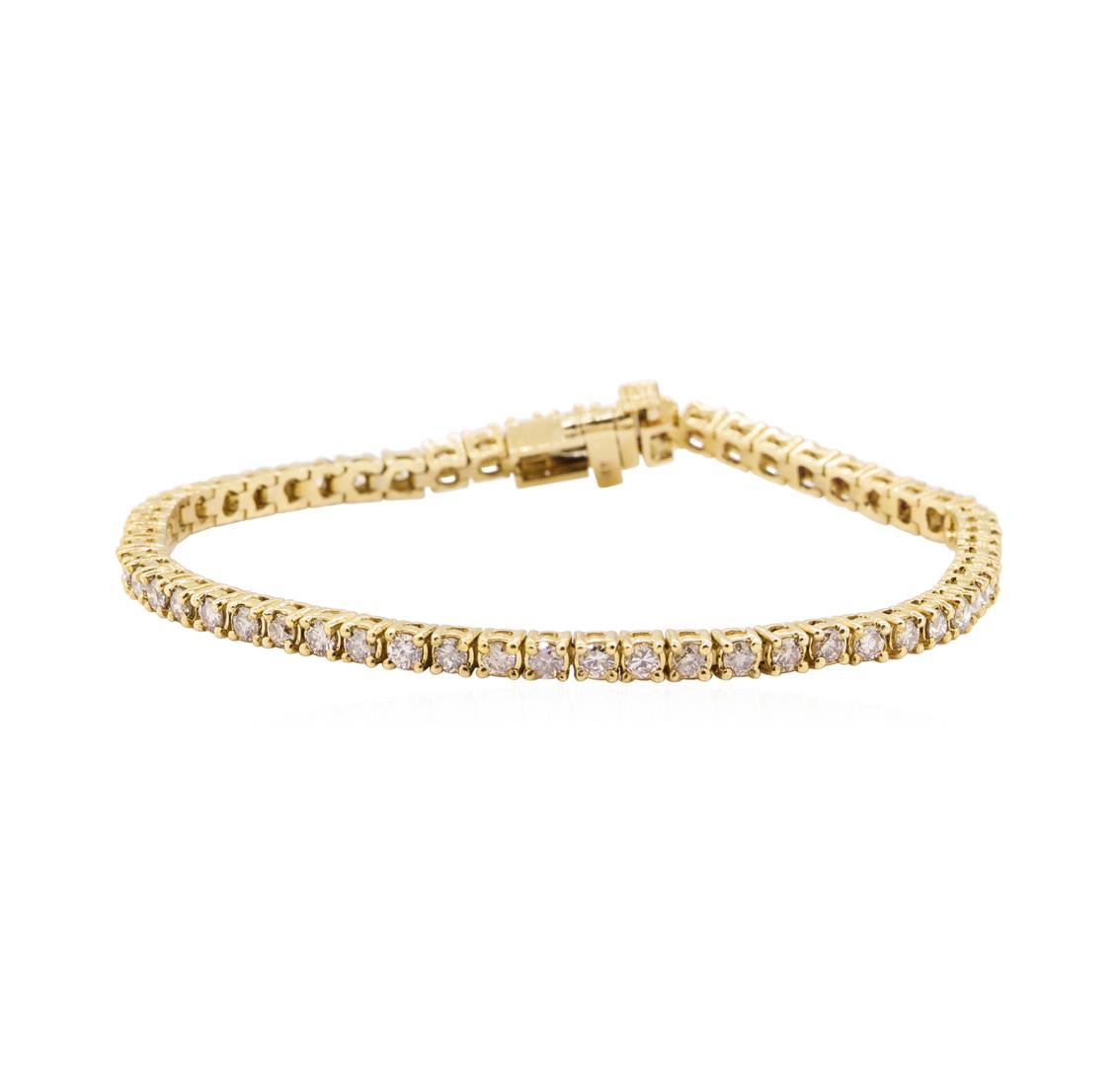 One electronically tested 14KT yellow gold lady's combination cast & assembled fashion tennis bracelet with a tongue clasp with foldover safety with a bright polish finish. The featured lady's bracelet measures approximately seven inches in length. Identified with markings of '14K'. Condition is new, good workmanship. Containing: Fifty-Seven prong set round brilliant cut diamonds, measuring 2.50 - 2.40 x 1.52mm (depth est.) approximate total weight of 57 Stones = 3.17ct. Graded in the setting. Color J - K Clarity SI-1 to I-1 Cut Good. Total Weight of Diamonds 3.17ct.. Total Weight of Tennis Bracelet 12.00gm GAS Appraised at $6565.00. GAS Appraised.