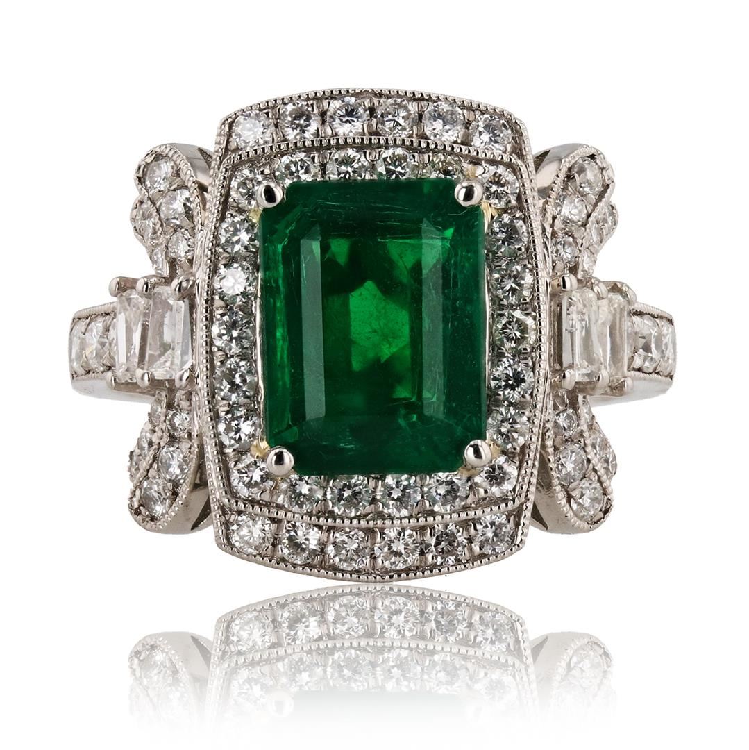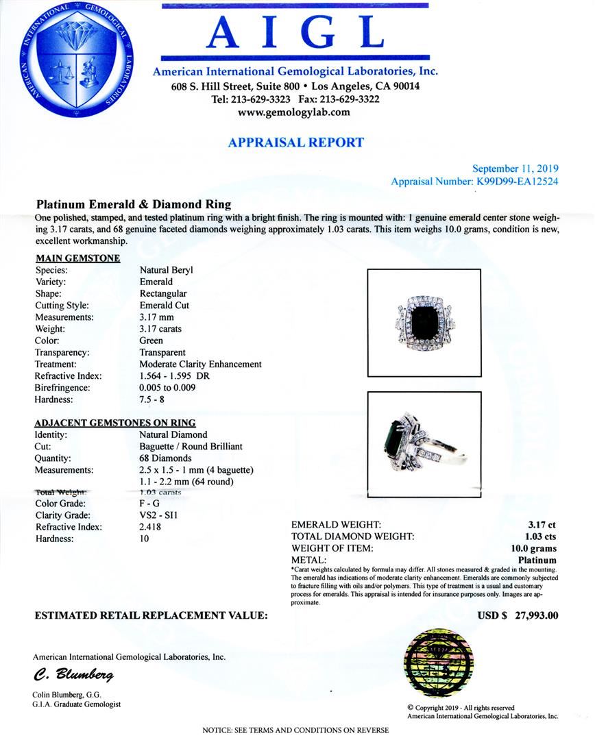 Platinum Emerald & Diamond Ring One polished, stamped, and tested platinum ring with a bright finish. The ring is mounted with: I genuine emerald center stone weigh-ing 3.17 carats, and 68 genuine faceted diamonds weighing approximately 1.03 carats. This item weighs 10.0 grams, condition is new, excellent workmanship. MAIN GEMSTONE Species: Natural Beryl Variety: Emerald Shape: Rectangular Cutting Style: Emerald Cut Measurements: 3.17 mm Weight: 3.17 carats Color: Green Transparency: Transparent Treatment: Moderate Clarity Enhancement Refractive Index: 1.564 - 1.595 DR Birefringence: 0.005 to 0.009 Hardness: 7.5 - 8 ADJACENT GEMSTONES ON RING Identity: Natural Diamond Cut: Baguette / Round Brilliant Quantity: 68 Diamonds Measurements: 2.5 x 1.5 - 1 mm (4 baguette) 1.1 - 2.2 mm (64 round) Total Weight : 1.03 carats Color Grade: F - G Clarity Grade: VS2 - SI1 Refractive Index: 2.418 Hardness: 10 EMERALD WEIGHT: 3.17ct TOTAL DIAMOND WEIGHT: 1.03ctw WEIGHT OF ITEM: 10.0 grams METAL: Platinum