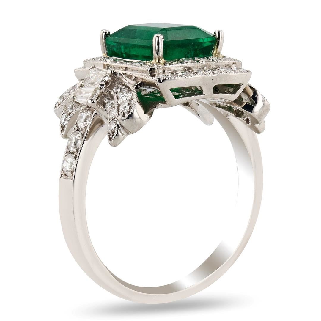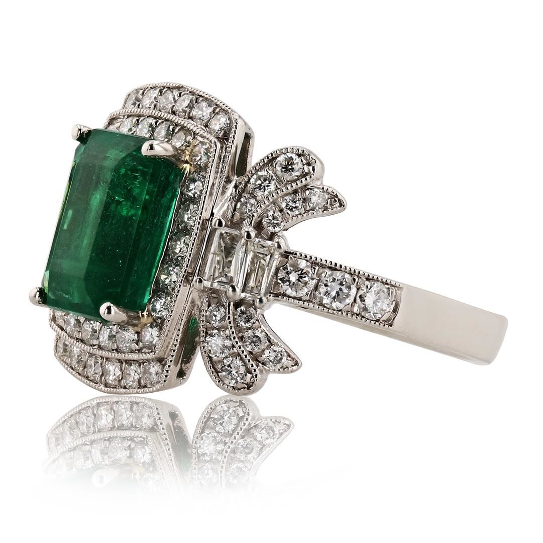 Platinum Emerald & Diamond Ring One polished, stamped, and tested platinum ring with a bright finish. The ring is mounted with: I genuine emerald center stone weigh-ing 3.17 carats, and 68 genuine faceted diamonds weighing approximately 1.03 carats. This item weighs 10.0 grams, condition is new, excellent workmanship. MAIN GEMSTONE Species: Natural Beryl Variety: Emerald Shape: Rectangular Cutting Style: Emerald Cut Measurements: 3.17 mm Weight: 3.17 carats Color: Green Transparency: Transparent Treatment: Moderate Clarity Enhancement Refractive Index: 1.564 - 1.595 DR Birefringence: 0.005 to 0.009 Hardness: 7.5 - 8 ADJACENT GEMSTONES ON RING Identity: Natural Diamond Cut: Baguette / Round Brilliant Quantity: 68 Diamonds Measurements: 2.5 x 1.5 - 1 mm (4 baguette) 1.1 - 2.2 mm (64 round) Total Weight : 1.03 carats Color Grade: F - G Clarity Grade: VS2 - SI1 Refractive Index: 2.418 Hardness: 10 EMERALD WEIGHT: 3.17ct TOTAL DIAMOND WEIGHT: 1.03ctw WEIGHT OF ITEM: 10.0 grams METAL: Platinum