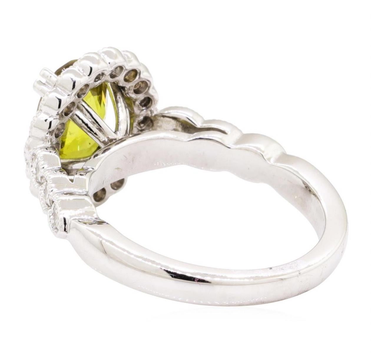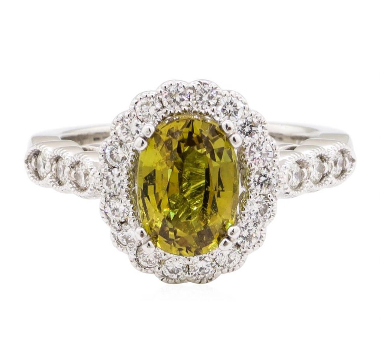 One electronically tested 14KT white gold lady's cast fashion ring with a cathedral basket halo with a bright polish with milgrain detailing finish. The featured lady's ring has a shank measuring 2.45 millimeters wide. Identified with markings of '14K'. Condition is new, good workmanship. Containing: One prong set oval modified mixed cut natural yellow sapphire, measuring 9.43 x 6.72 x 4.41mm, (depth est.) 9%. bulge factor, approximate weight of 2.54ct., clarity is eye clean, medium dark, brownish, yellow color, (GIA Y 6/3), cut is very good. Transmitting light with no distortion, transparent. No indications of heat treatment. Graded loose prior to setting in the GIA Laboratory, Report #6177774340. Twenty-Four prong set round brilliant cut diamonds, measuring 1.90 - 1.85 x 1.17mm (depth est.) approximate total weight of 24 Stones = 0.63ct. Graded in the setting. Color G - I Clarity SI-1 to SI-2 Cut Good. Total Weight of Colored Stones 2.54ct.. Total Weight of Diamonds 0.63ct.. Total Weight of Ring 6.40gm GAS Appraised at $7255.00. GAS Appraised.