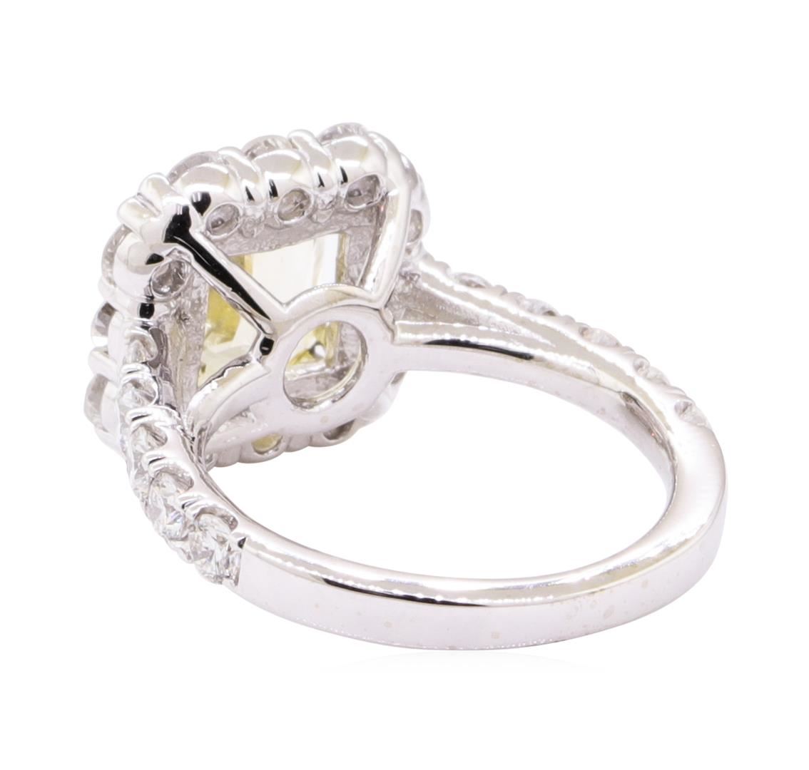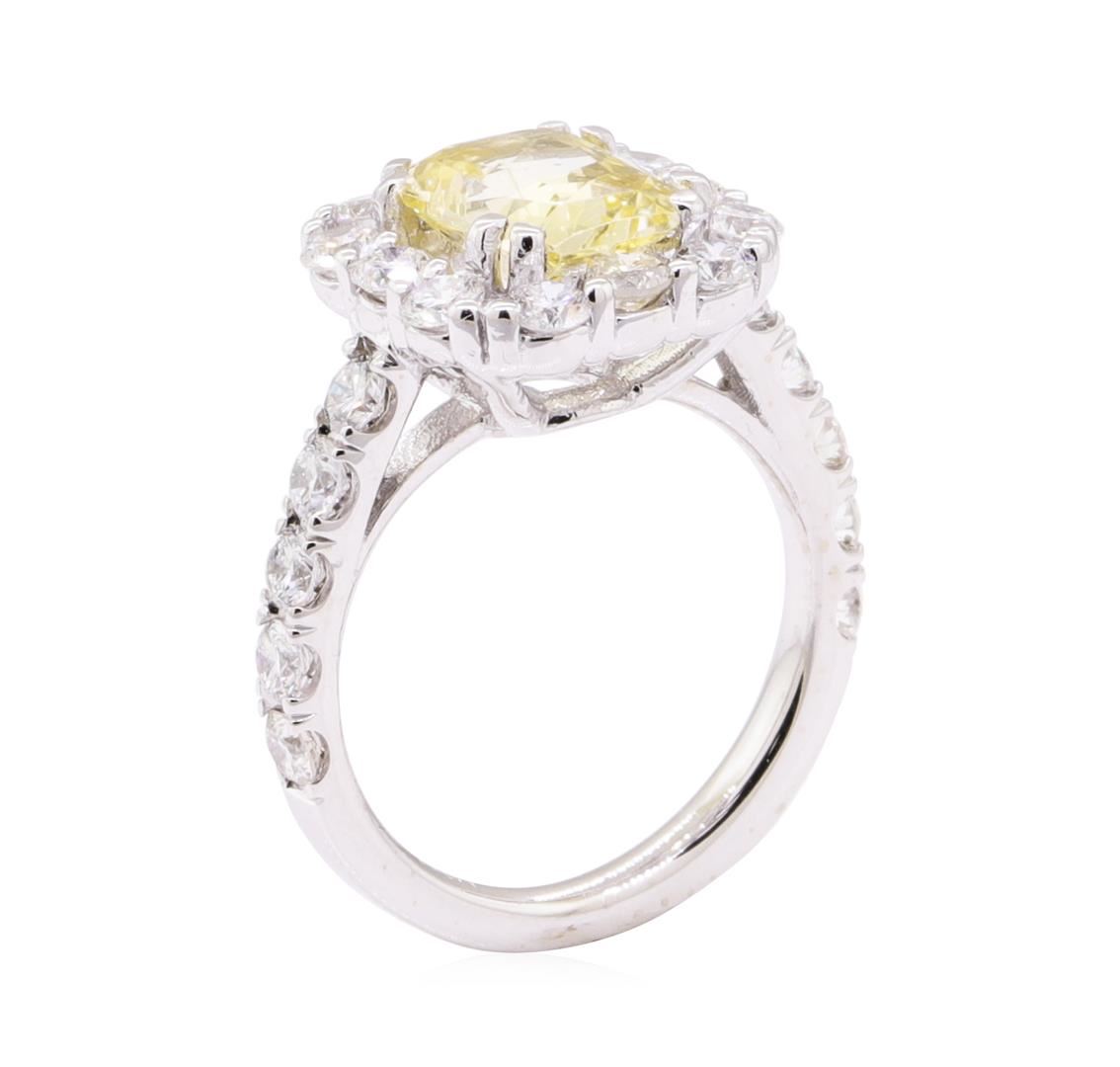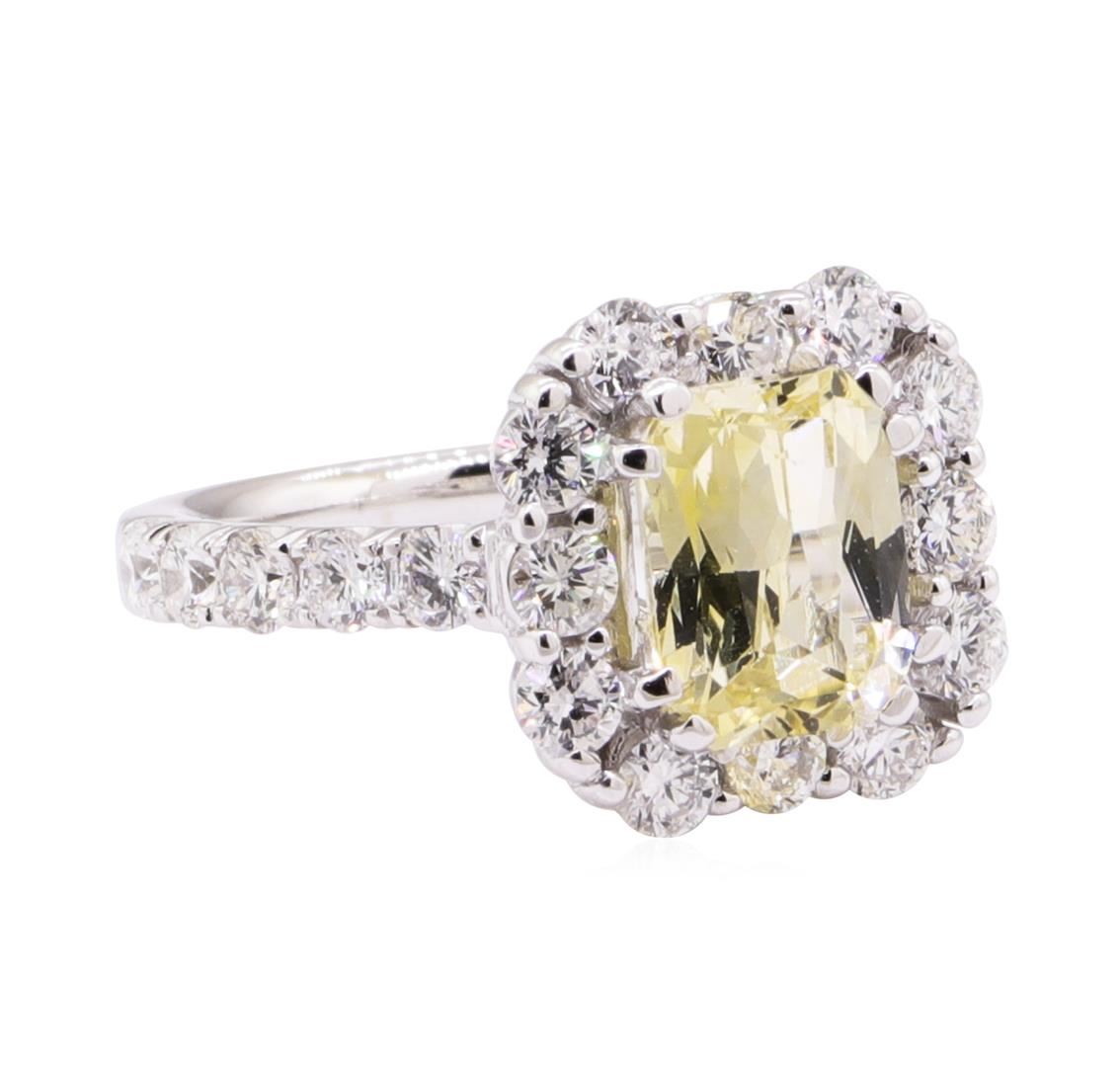 One electronically tested 18KT white gold lady's cast fashion ring with a octagonal halo with a bright polish finish. The featured lady's ring has a shank measuring 2.20 millimeters wide. Identified with markings of '18K'. Condition is like new, good workmanship. Containing: One prong set rectangular modified mixed cut natural yellow topaz, measuring 8.25 x 6.45 x 3.68mm, (depth est.) approximate weight of 1.99ct., clarity is slightly included, light, moderately strong, yellow color, (GIA Y 3/4), cut is fair. Transmitting light with a minimum of distortion, transparent. Colored gemstones are presumed to have been subjected to commonly used enhancement processes. Graded in the setting. Twenty-Two prong set round brilliant cut diamonds, measuring 2.50 - 2.40 x 1.52mm (depth est.) approximate total weight of 22 Stones = 1.20ct. Graded in the setting. Color H - I Clarity VS-2 to SI-1 Cut Very Good. Total Weight of Colored Stones 1.99ct.. Total Weight of Diamonds 1.20ct.. Total Weight of Ring 5.00gm GAS Appraised at $4490.00. GAS Appraised.