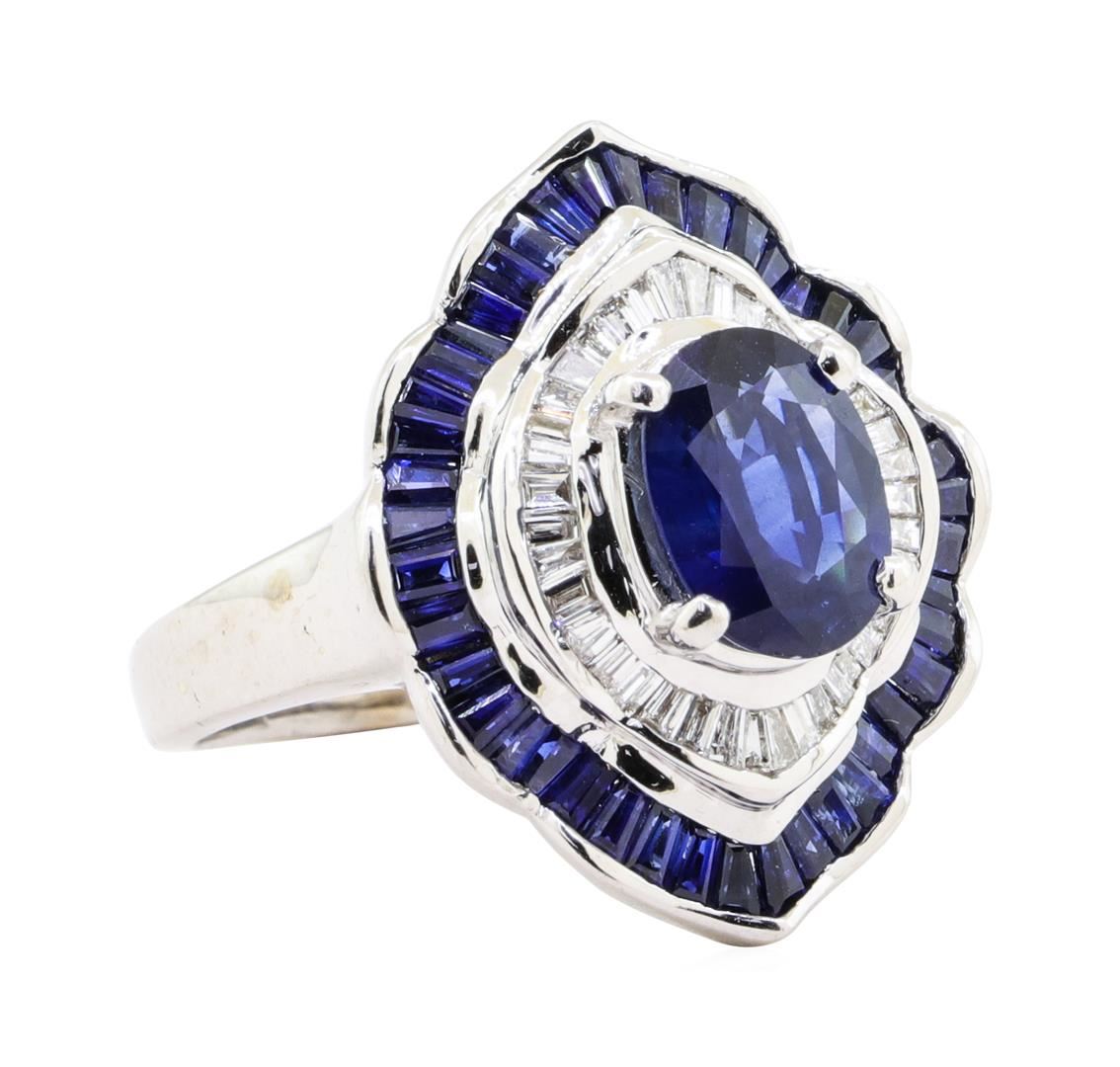 One electronically tested 14KT white gold lady's cast fashion ring with a scalloped double halo with a bright polish finish. The featured lady's ring has a shank measuring 2.20 millimeters wide. Identified with markings of '14K'. Condition is Good. Containing: One prong set oval modified mixed cut natural blue sapphire, measuring 9.01 x 6.80 x 3.57mm, (depth est.) approximate weight of 1.84ct., clarity is moderately included, medium dark, very slightly grayish, blue color, (GIA B 6/3), cut is very good. Transmitting light somewhat diffusely, transparent to translucent. Colored gemstones are presumed to have been subjected to commonly used enhancement processes. Graded in the setting. Forty-four channel set tapered baguette standard step cut natural blue sapphires, measuring 2.00 x 1.10 x 0.72mm, (depth est.) approximate total weight of 0.88ct., clarity is slightly included, medium dark, moderately strong, blue color, (GIA B 6/4), cut is very good. Transmitting light with a minimum of distortion, transparent. Colored gemstones are presumed to have been subjected to commonly used enhancement processes. Graded in the setting. Thirty-Eight channel set baguette cut diamonds, measuring from 1.40 x 0.90 x 0.77mm (depth est.) to 1.70 x 1.10 x 0.94mm (depth est.) approximate total weight of 38 Stones = 0.48ct. Graded in the setting. Color G - I Clarity VS-2 to SI-1 Cut Very Good. Total Weight of Colored Stones 2.72ct.. Total Weight of Diamonds 0.48ct.. Total Weight of Ring 10.40gm GAS Appraised at $5515.00. GAS Appraised.