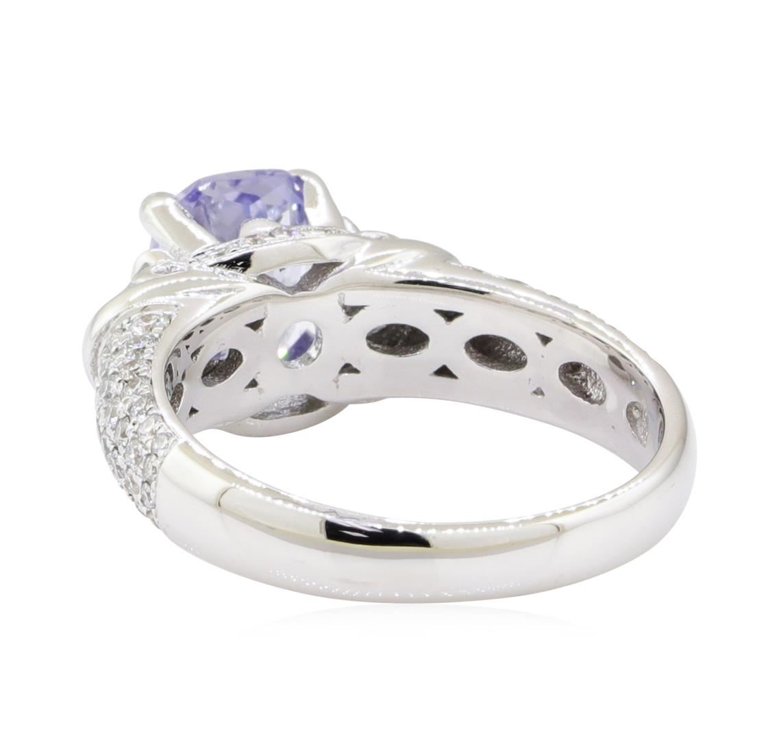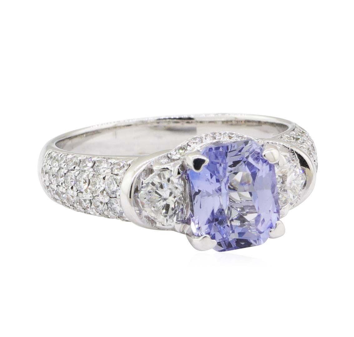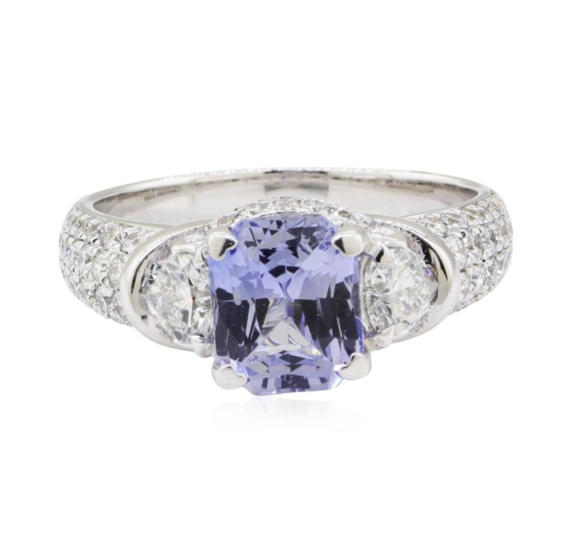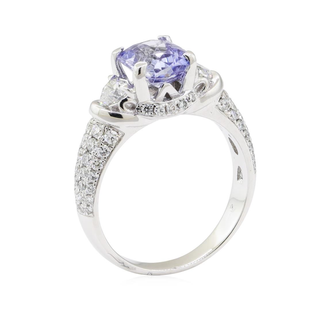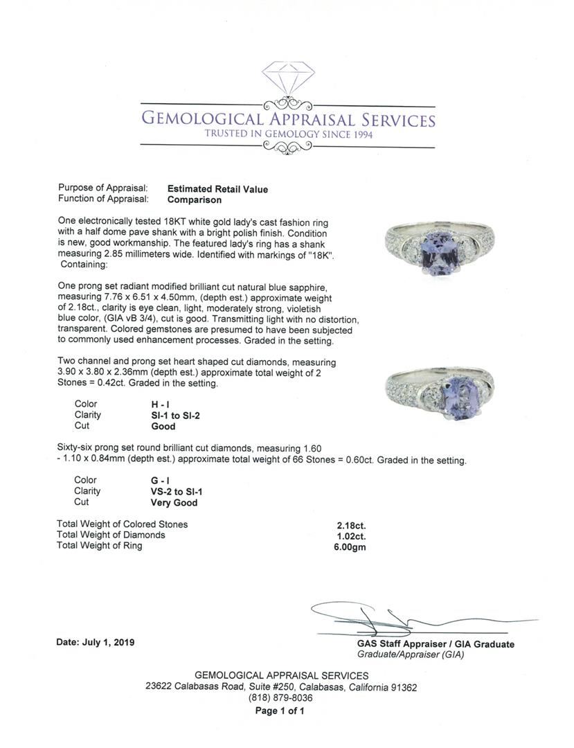 One electronically tested 18KT white gold lady's cast fashion ring with a half dome pave shank with a bright polish finish. The featured lady's ring has a shank measuring 2.85 millimeters wide. Identified with markings of '18K'. Condition is new, good workmanship. Containing: One prong set radiant modified brilliant cut natural blue sapphire, measuring 7.76 x 6.51 x 4.50mm, (depth est.) approximate weight of 2.18ct., clarity is eye clean, light, moderately strong, violetish blue color, (GIA vB 3/4), cut is good. Transmitting light with no distortion, transparent. Colored gemstones are presumed to have been subjected to commonly used enhancement processes. Graded in the setting. Two channel and prong set heart shaped cut diamonds, measuring 3.90 x 3.80 x 2.36mm (depth est.) approximate total weight of 2 Stones = 0.42ct. Graded in the setting. Color H - I Clarity SI-1 to SI-2 Cut Good Sixty-Six prong set round brilliant cut diamonds, measuring 1.60 - 1.10 x 0.84mm (depth est.) approximate total weight of 66 Stones = 0.60ct. Graded in the setting. Color G - I Clarity VS-2 to SI-1 Cut Very Good. Total Weight of Colored Stones 2.18ct.. Total Weight of Diamonds 1.02ct.. Total Weight of Ring 6.00gm GAS Appraised at $6100.00. GAS Appraised.