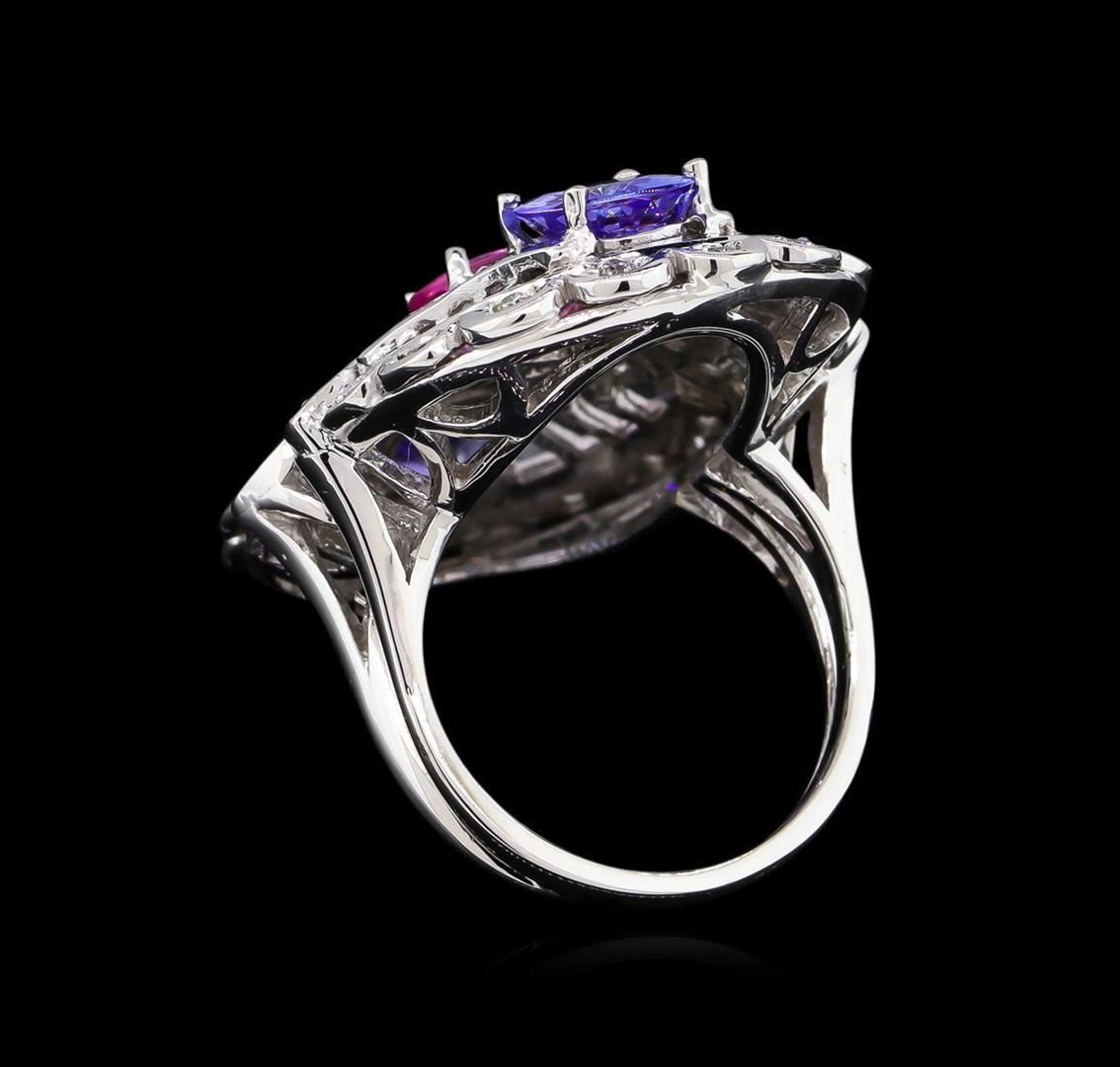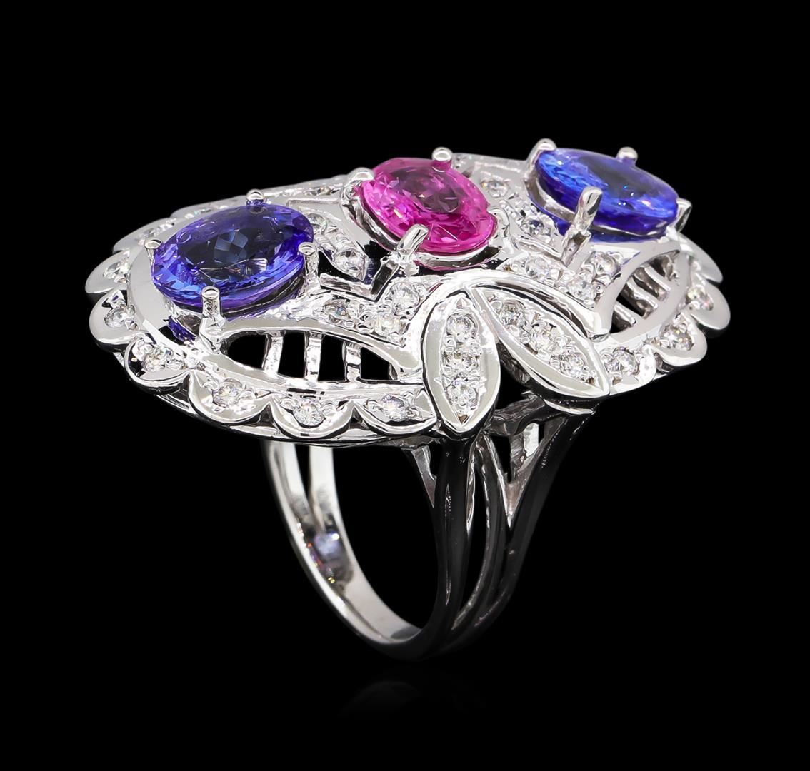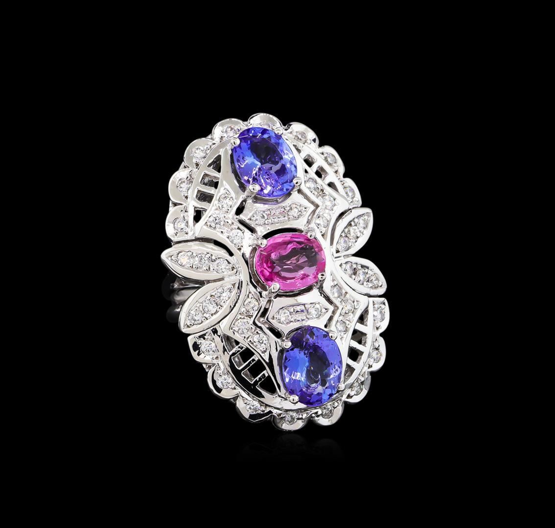 One electronically tested 14KT white gold lady's combination cast & assembled fashion ring with a split shank with a bright polish finish. The featured lady's ring has a shank measuring 2.61 millimeters wide. Identified with markings of "K14". Condition is new, good workmanship. Containing: Two prong set oval modified brilliant cut natural tanzanites, measuring 8.91 x 6.85 x 3.70mm, approximate total weight of 3.20ct., clarity is eye clean, type I, medium light, moderately strong, bluish violet color, (GIA bV 4/4), cut is good. Transmitting light with no distortion, transparent. Colored gemstones are presumed to have been subjected to commonly used enhancement processes. Graded in the setting. One prong set oval modified brilliant cut natural pink sapphire, measuring 8.25 x 6.35 x 2.80mm, approximate weight of 1.36ct., clarity is slightly included, type II, medium light, moderately strong, slightly purplish red color, (GIA slpR 4/4), cut is good. Colored gemstones are presumed to have been subjected to commonly used enhancement processes. Graded in the setting. Forty-Four prong set round brilliant cut diamonds, measuring 1.70 - 1.60 x 1.02mm (depth est.) approximate total weight of 44 Stones = 0.75ct. Graded in the setting. Clarity: SI-1 to SI-2. Color: H - I. Cut Good. Total Weight of Colored Stones 4.56ct. Total Weight of Diamonds 0.75ct. Total Weight of Ring 14.10gm. GAS Appraised.