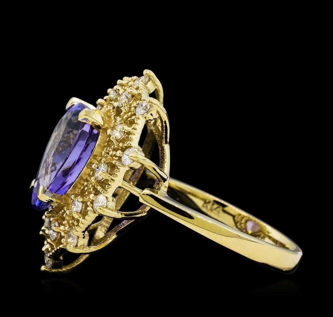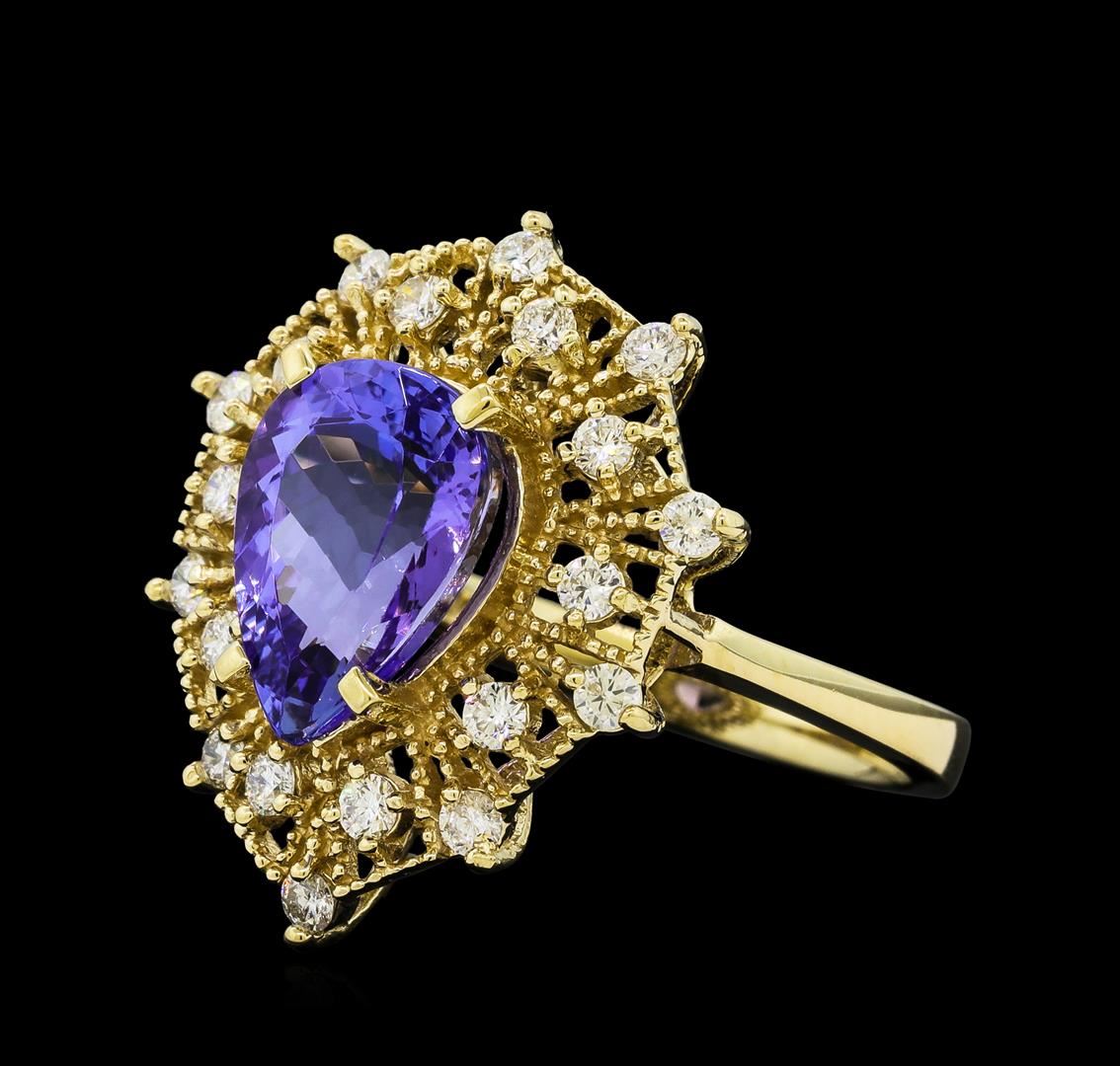 One Tanzanite and Diamond Ring including: 14KT Yellow Gold weighing a total of 5.42 grams, Tanzanite weighing a total of 3.85ct, and 20 Diamonds weighing a total of 0.55ctw.