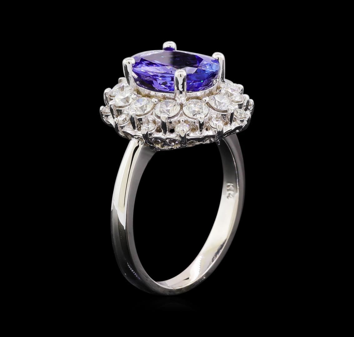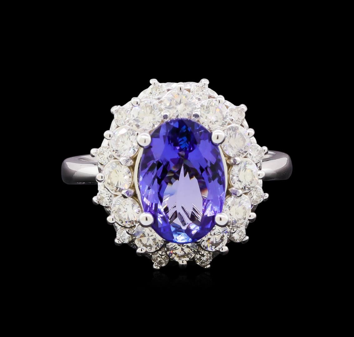 One electronically tested 14KT white gold lady's cast fashion ring with a double basket halo with a bright polish finish. The featured lady's ring has a shank measuring 2.69 millimeters in width. Identified with markings of "K14". Condition is new, good workmanship. Containing: One prong set oval modified brilliant cut natural tanzanite, measuring 11.15 x 7.91 x 4.58mm, (depth est.) 8%. bulge factor, approximate weight of 3.23ct., clarity is eye clean, medium, moderately strong, bluish violet color, (GIA bV 5/4), cut is good. Transmitting light with no distortion, transparent. Colored gemstones are presumed to have been subjected to commonly used enhancement processes. Graded in the setting. Twelve prong set round brilliant cut diamonds, measuring 2.95 - 2.90 x 1.76mm (depth est.) approximate total weight of 12 Stones = 1.00ct. Graded in the setting. Graded in the setting. Clarity: VS-2 to SI-1. Color: H - I. Cut Very Good Twelve prong set round brilliant cut diamonds, measuring 1.60 - 1.50 x 0.93mm (depth est.) approximate total weight of 12 Stones = 0.18ct. Graded in the setting. Clarity: SI-1 to SI-2. Color: H - I. Cut Good. Total Weight of Colored Stones 3.23ct. Total Weight of Diamonds 1.18ct. Total Weight of Ring 6.90gm. GAS Appraised.