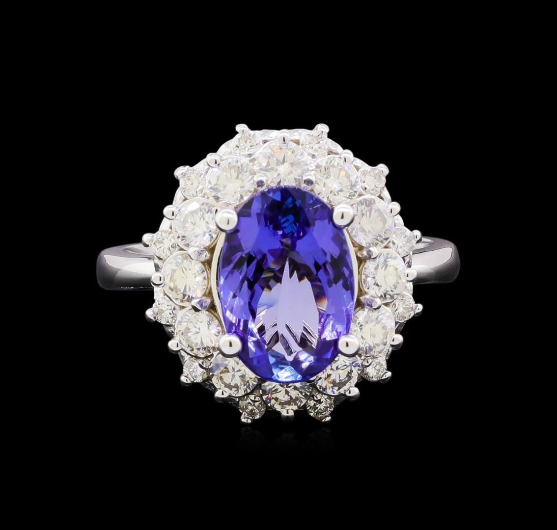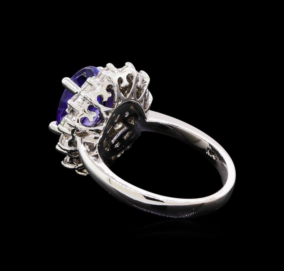 One electronically tested 14KT white gold lady's cast fashion ring with a double basket halo with a bright polish finish. The featured lady's ring has a shank measuring 2.69 millimeters in width. Identified with markings of "K14". Condition is new, good workmanship. Containing: One prong set oval modified brilliant cut natural tanzanite, measuring 11.15 x 7.91 x 4.58mm, (depth est.) 8%. bulge factor, approximate weight of 3.23ct., clarity is eye clean, medium, moderately strong, bluish violet color, (GIA bV 5/4), cut is good. Transmitting light with no distortion, transparent. Colored gemstones are presumed to have been subjected to commonly used enhancement processes. Graded in the setting. Twelve prong set round brilliant cut diamonds, measuring 2.95 - 2.90 x 1.76mm (depth est.) approximate total weight of 12 Stones = 1.00 ct. Graded in the setting. Graded in the setting. Clarity: VS-2 to SI-1. Color: H - I. Cut Very Good Twelve prong set round brilliant cut diamonds, measuring 1.60 - 1.50 x 0.93mm (depth est.) approximate total weight of 12 Stones = 0.18ct. Graded in the setting. Clarity: SI-1 to SI-2. Color: H - I. Cut Good. Total Weight of Colored Stones 3.23ct. Total Weight of Diamonds 1.18ct. Total Weight of Ring 6.90gm. GAS Appraised.