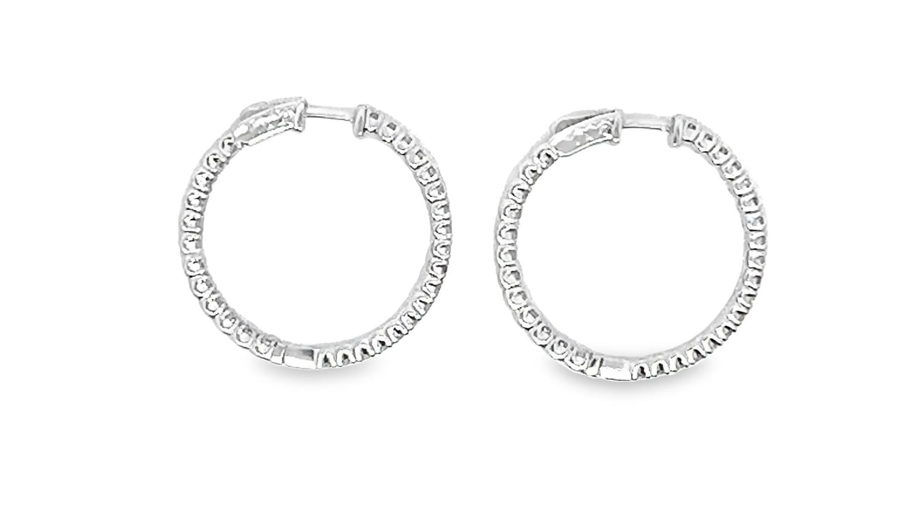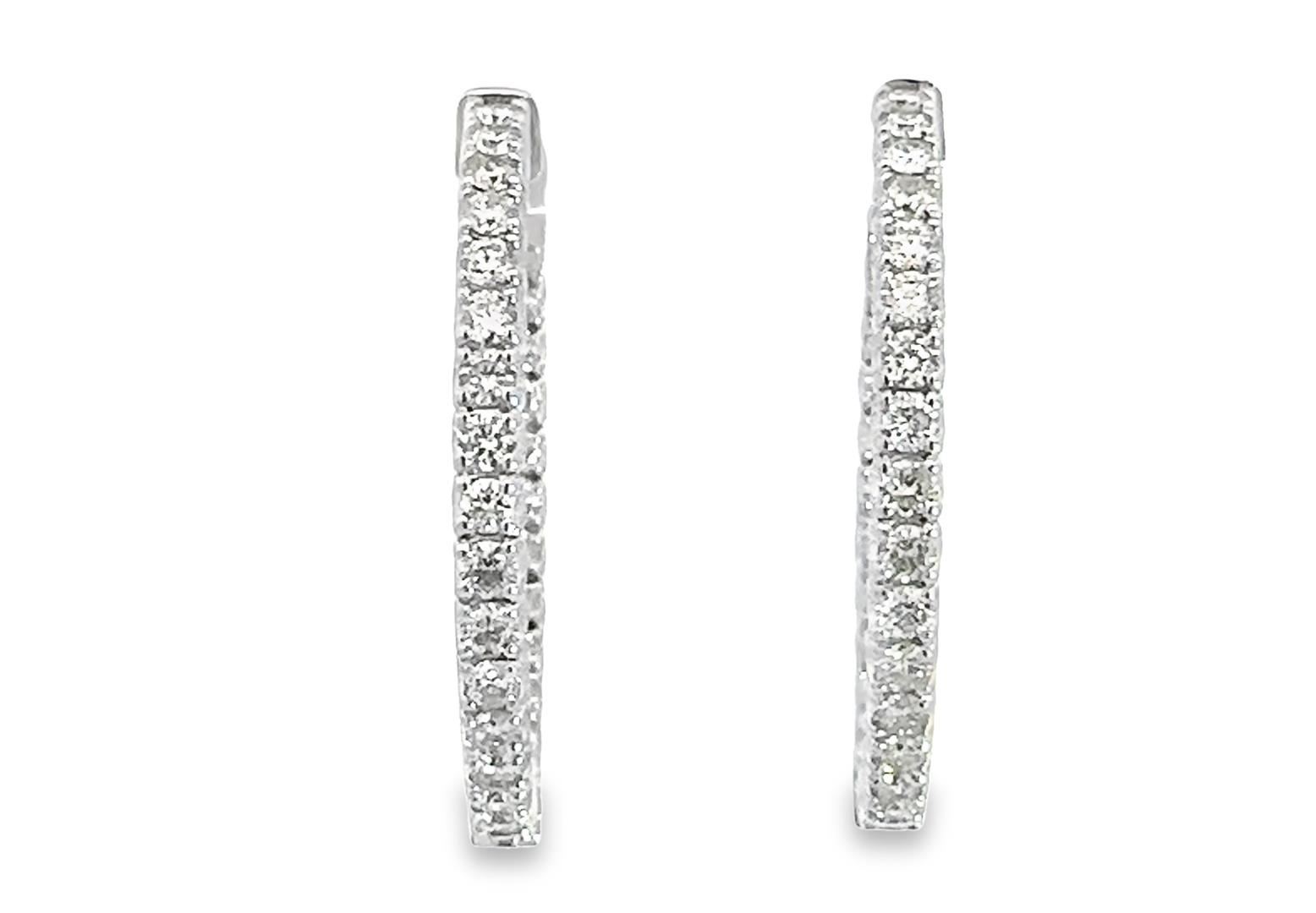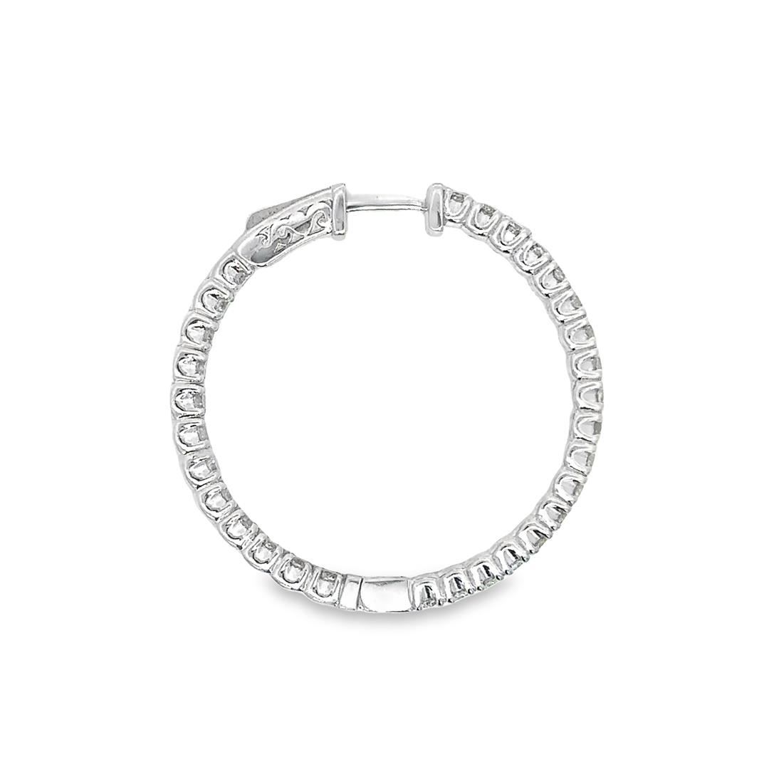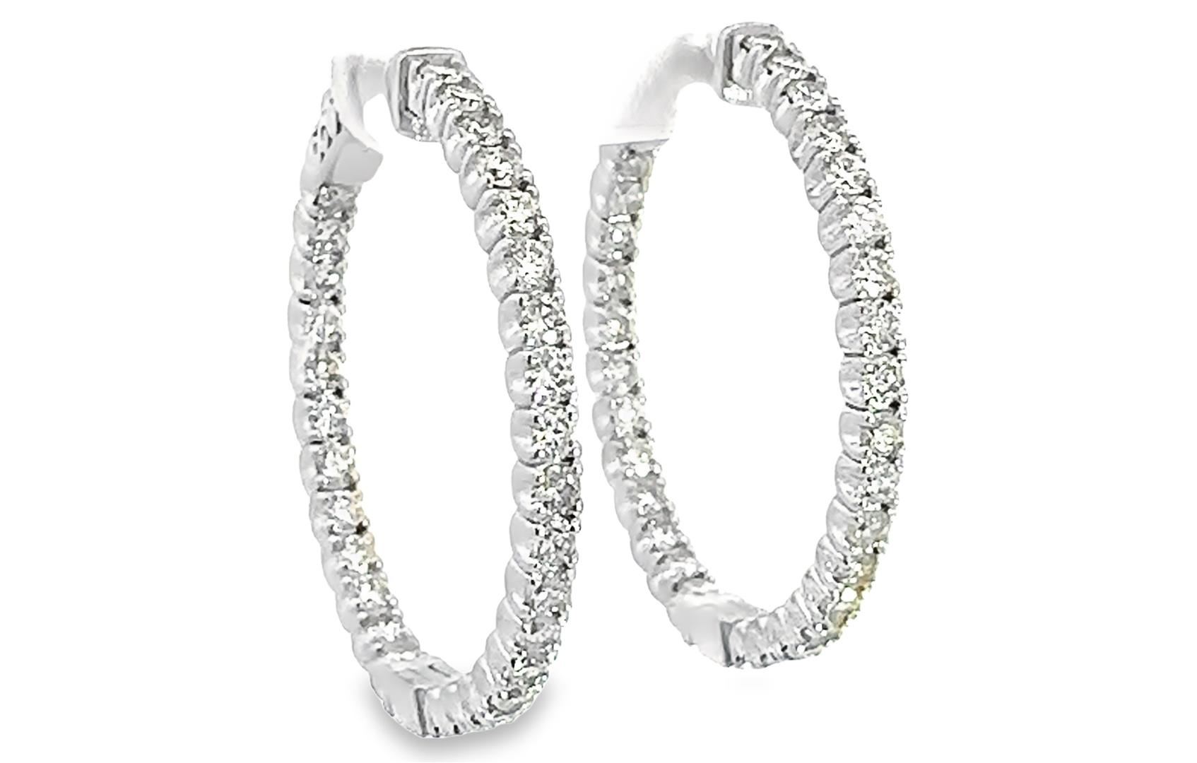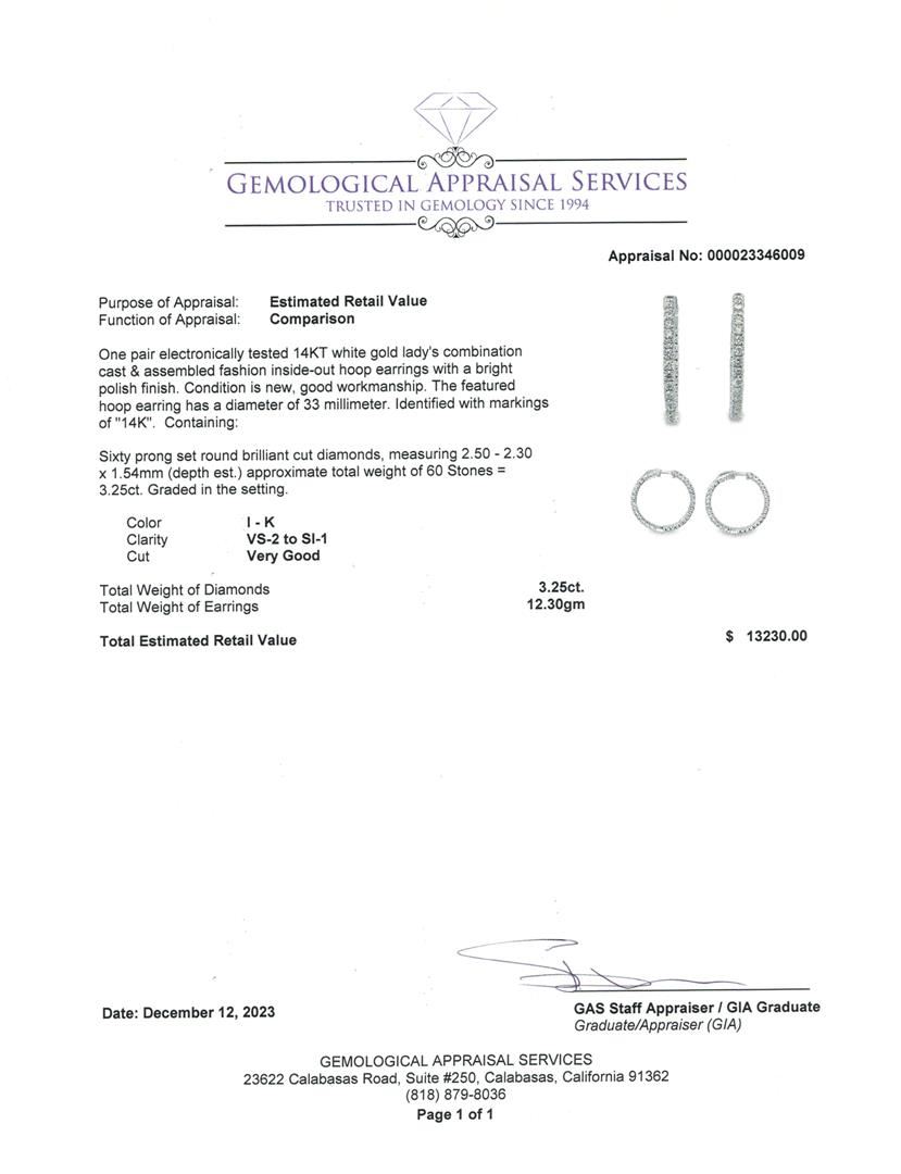 One pair electronically tested 14KT white gold lady's combination cast & assembled fashion inside-out hoop earrings with a bright polish finish. The featured hoop earring has a diameter of 33 millimeter. Identified with markings of "14K". Condition is new, good workmanship. Containing: Sixty prong set round brilliant cut diamonds, measuring 2.50 - 2.30 x 1.54mm (depth est.) approximate total weight of 60 Stones = 3.25ct. Graded in the setting. Color I - K Clarity VS-2 to SI-1 Cut Very Good Total Weight of Diamonds 3.25ct. Total Weight of Earrings 12.30gm Estimated Retail Value $ 13230.00