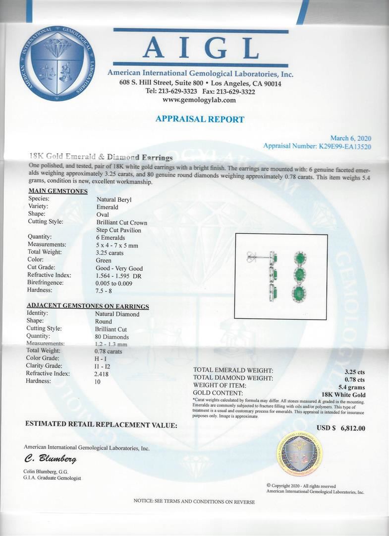 One 3.25ctw Emerald and Diamond Earrings - 18KT White Gold. AIG certified. See Appraisal for more details. AIG Appraised.