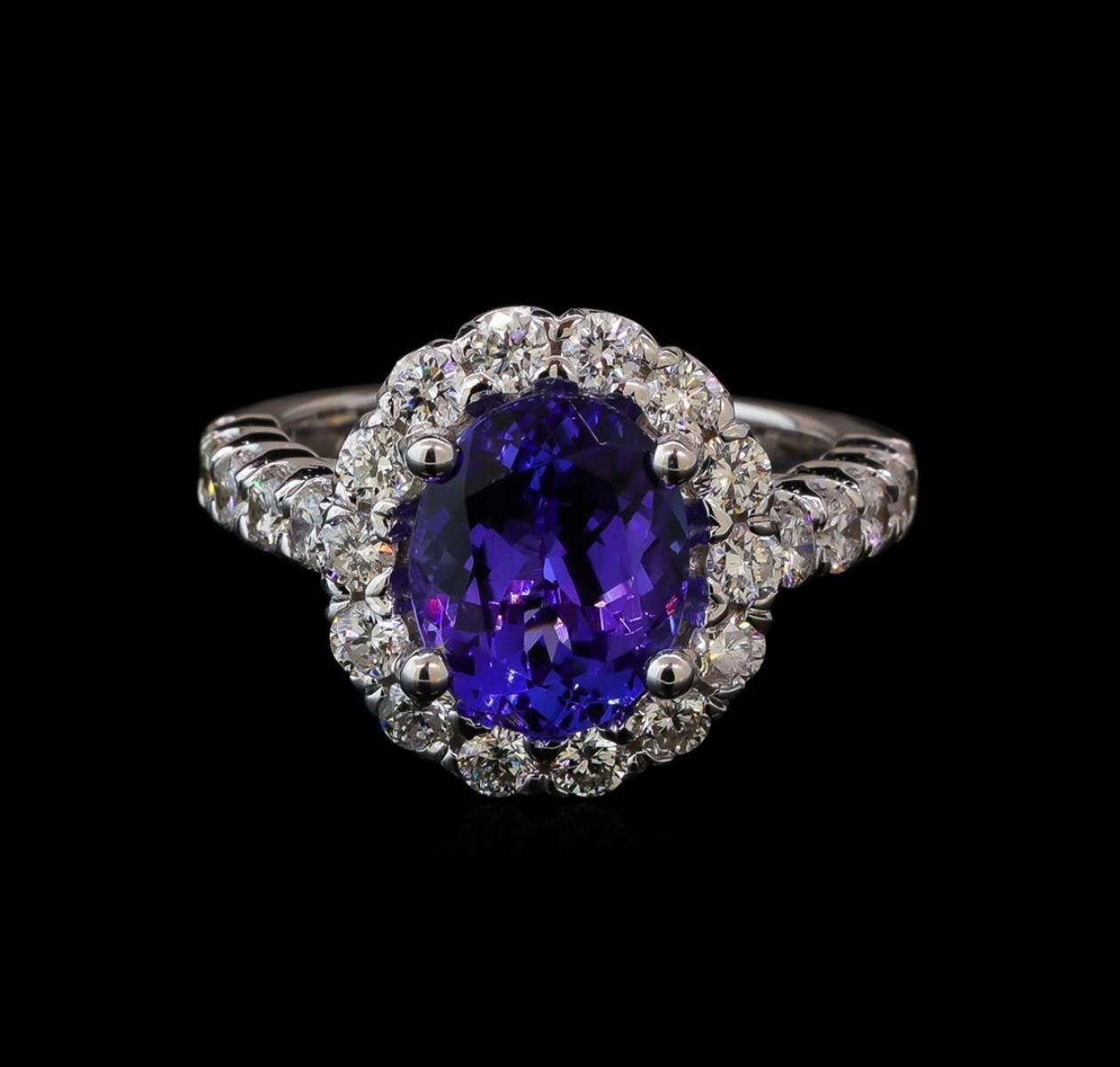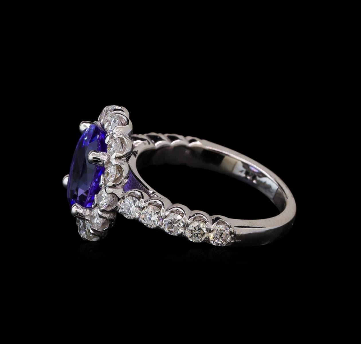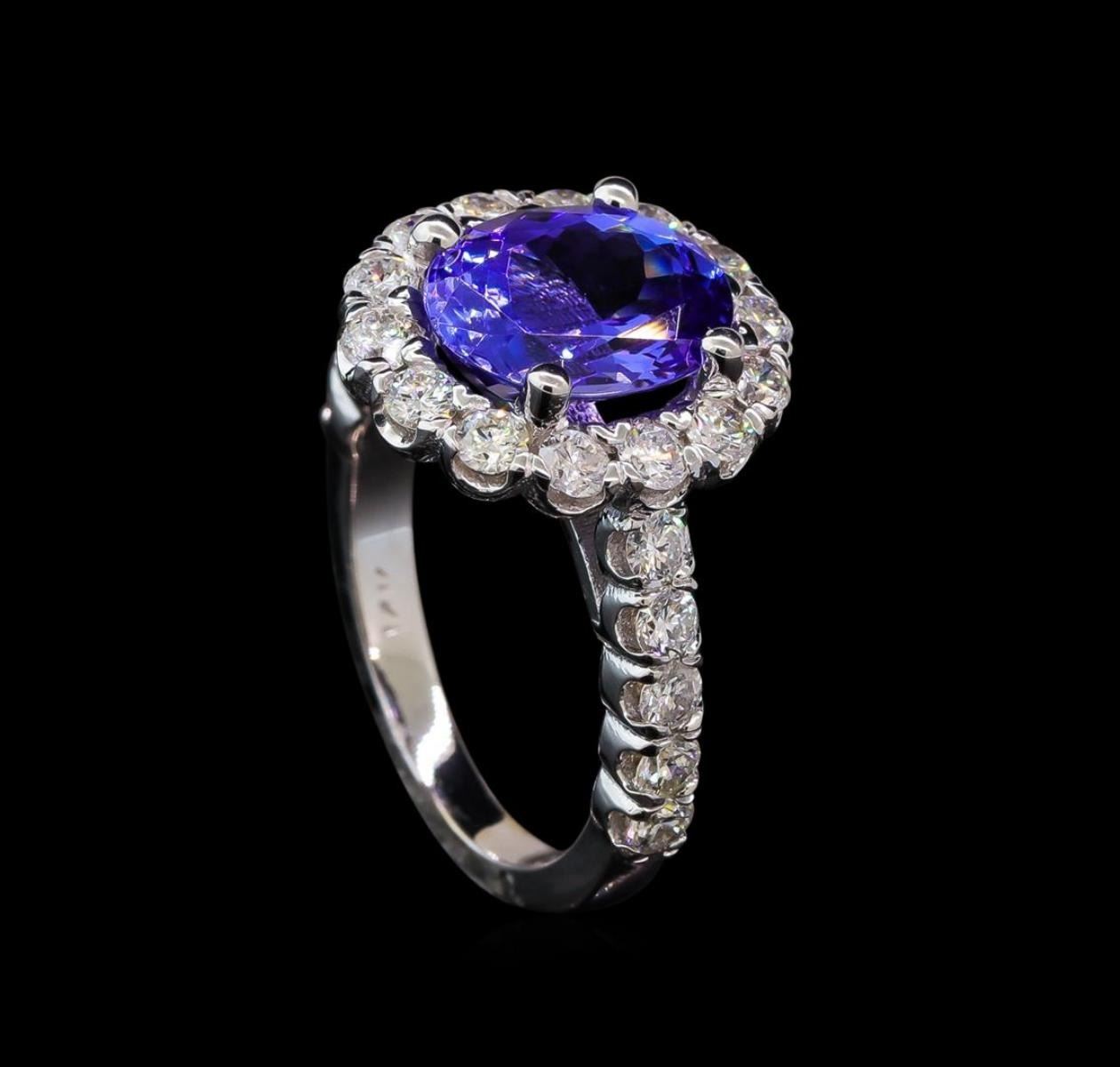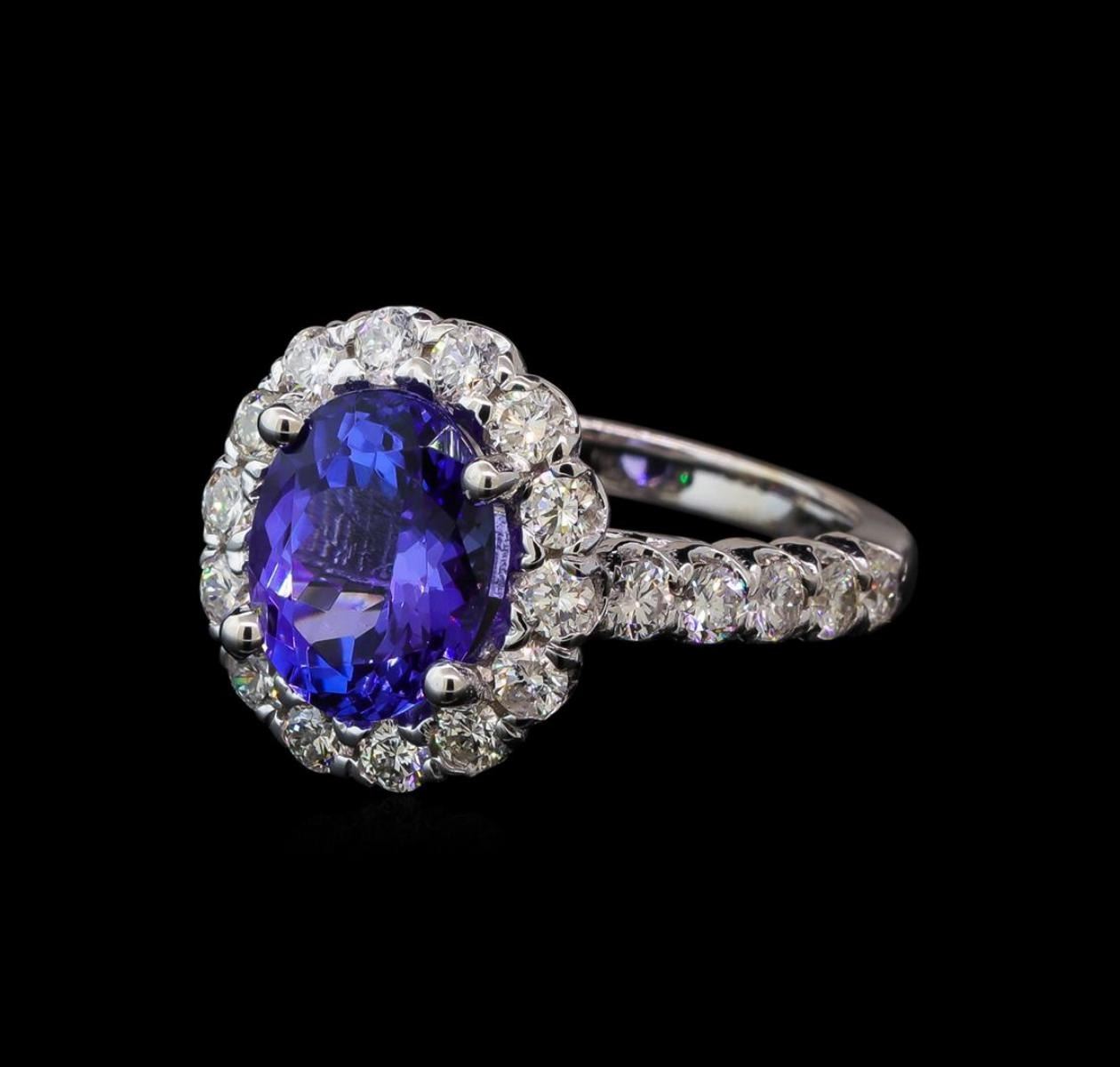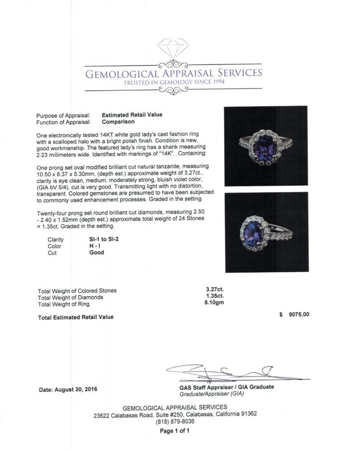 One electronically tested 14KT white gold lady's cast fashion ring with a scalloped halo with a bright polish finish. The featured lady's ring has a shank measuring 2.23 millimeters wide. Identified with markings of '14K'. Condition is new, good workmanship. Containing: One prong set oval modified brilliant cut natural tanzanite, measuring 10.50 x 8.37 x 5.30mm, (depth est.) approximate weight of 3.27ct., clarity is eye clean, medium, moderately strong, bluish violet color, (GIA bV 5/4), cut is very good. Transmitting light with no distortion, transparent. Colored gemstones are presumed to have been subjected to commonly used enhancement processes. Graded in the setting. Twenty-Four prong set round brilliant cut diamonds, measuring 2.50 - 2.40 x 1.52mm (depth est.) approximate total weight of 24 Stones = 1.35ct. Graded in the setting. Clarity SI-1 to SI-2. Color: H - I Cut Good. Total Weight of Colored Stones 3.27ct. Total Weight of Diamonds 1.35ct. Total Weight of Ring 6.10gm. GAS Appraised at $9,075.00.