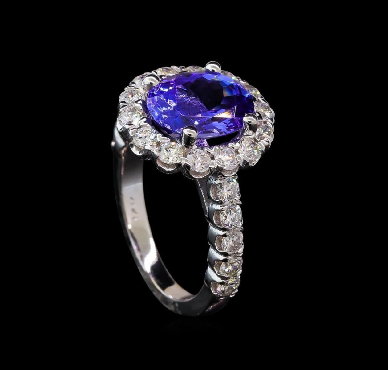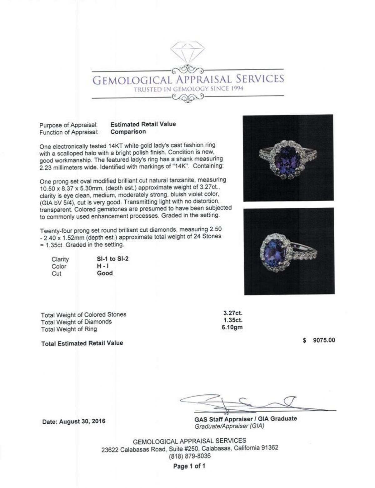 One electronically tested 14KT white gold lady's cast fashion ring with a scalloped halo with a bright polish finish. The featured lady's ring has a shank measuring 2.23 millimeters wide. Identified with markings of '14K'. Condition is new, good workmanship. Containing: One prong set oval modified brilliant cut natural tanzanite, measuring 10.50 x 8.37 x 5.30mm, (depth est.) approximate weight of 3.27ct., clarity is eye clean, medium, moderately strong, bluish violet color, (GIA bV 5/4), cut is very good. Transmitting light with no distortion, transparent. Colored gemstones are presumed to have been subjected to commonly used enhancement processes. Graded in the setting. Twenty-Four prong set round brilliant cut diamonds, measuring 2.50 - 2.40 x 1.52mm (depth est.) approximate total weight of 24 Stones = 1.35ct. Graded in the setting. Clarity SI-1 to SI-2. Color: H - I Cut Good. Total Weight of Colored Stones 3.27ct. Total Weight of Diamonds 1.35ct. Total Weight of Ring 6.10gm. GAS Appraised.