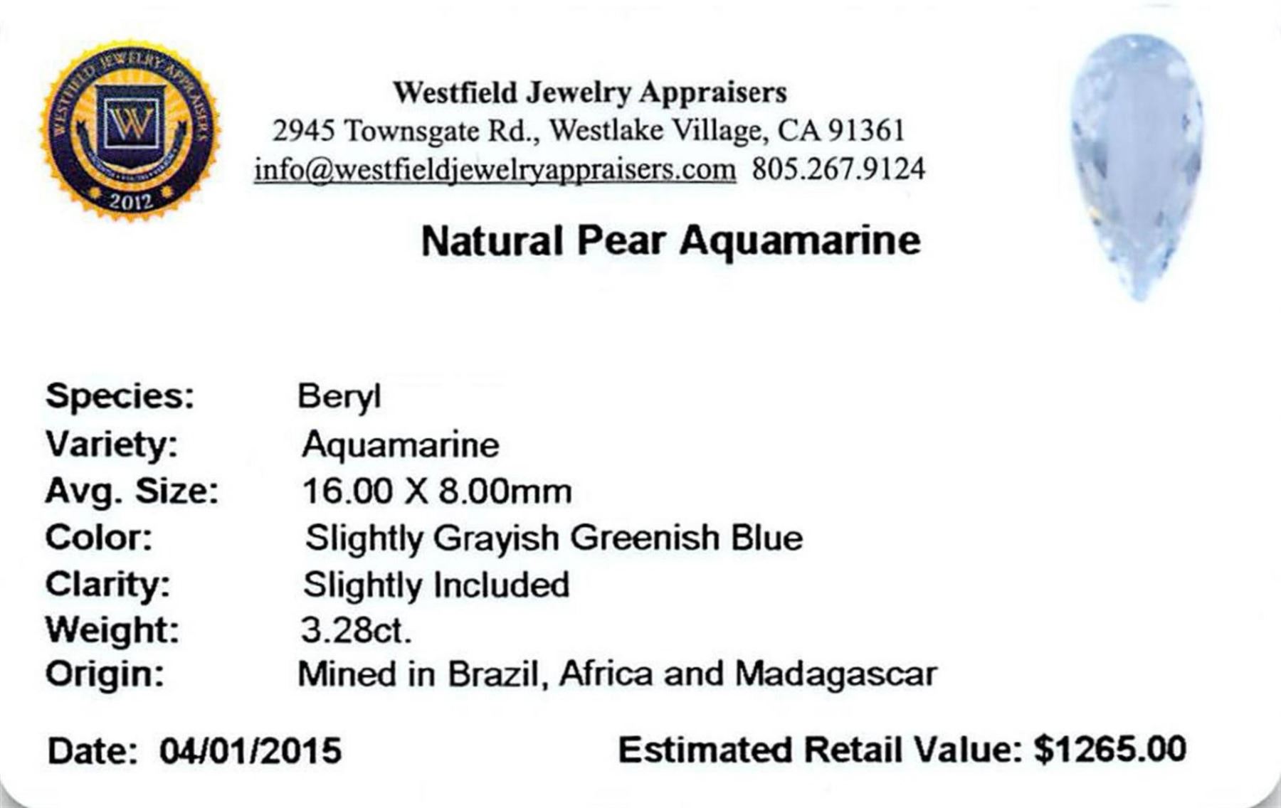 One pear cut natural aquamarine exact weight 3.28ct., clarity is slightly included, type I, medium, slightly grayish, very slightly greenish blue color, (GIA vslgB 5/2), cut is good. Westfield Appraised at $1,265.00.