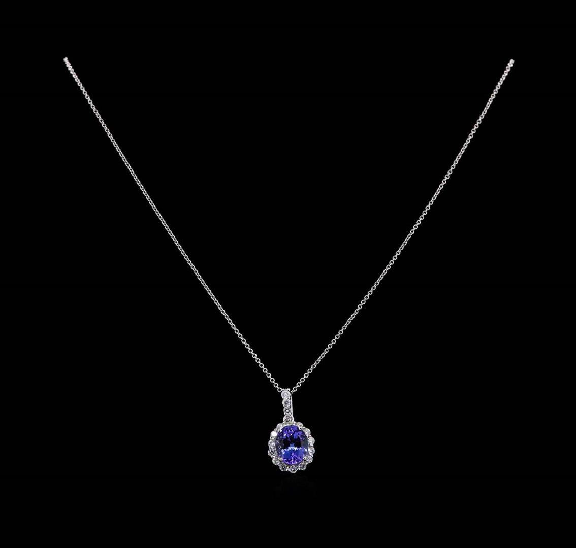 One electronically tested 14KT white gold lady's combination cast & assembled solitaire drop pendant & chain 18.0' long, 1.3mm oval cable link with a lobster claw clasp with a oval halo with a bright polish finish. Identified with markings of '14K 585'. Condition is new, good workmanship. Containing: One prong set oval modified brilliant cut natural tanzanite, measuring 10.45 x 8.52 x 5.68mm, (depth est.) approximate weight of 3.28ct., clarity is eye clean, medium, very slightly grayish, bluish violet color, (GIA bV 5/3), cut is very good. Transmitting light with no distortion, transparent. Colored gemstones are presumed to have been subjected to commonly used enhancement processes. Graded in the setting. Fifteen prong set round brilliant cut diamonds, measuring 2.10 - 2.05 x 1.29mm (depth est.) approximate total weight of 15 Stones = 0.52ct. Graded in the setting. Clarity VS-2 to SI-2. Color: H - I Cut Good Three prong set round brilliant cut diamonds, measuring 2.00 - 1.60 x 1.12mm (depth est.) approximate total weight of 3 Stones = 0.08ct. Graded in the setting. Clarity SI-1 to SI-2. Color: H - I Cut Good. Total Weight of Colored Stones 3.28ct.. Total Weight of Diamonds 0.60ct.. Total Weight of Pendant & Chain 5.00gm. GAS Appraised.