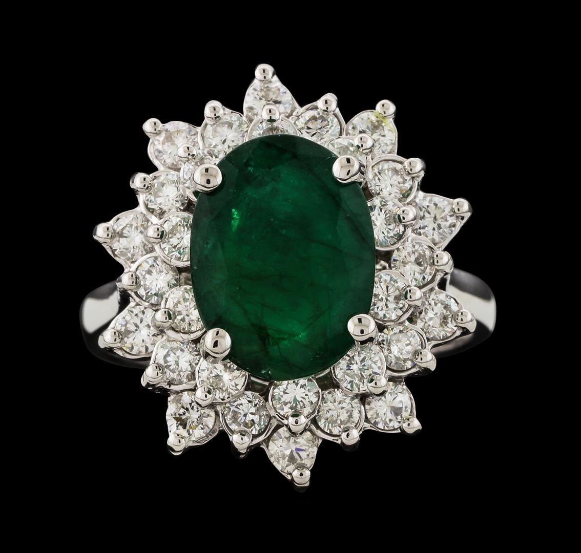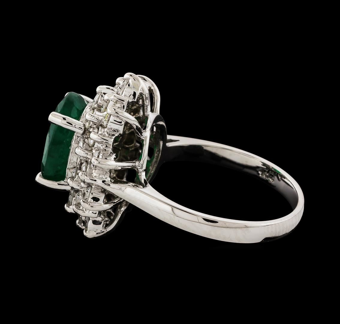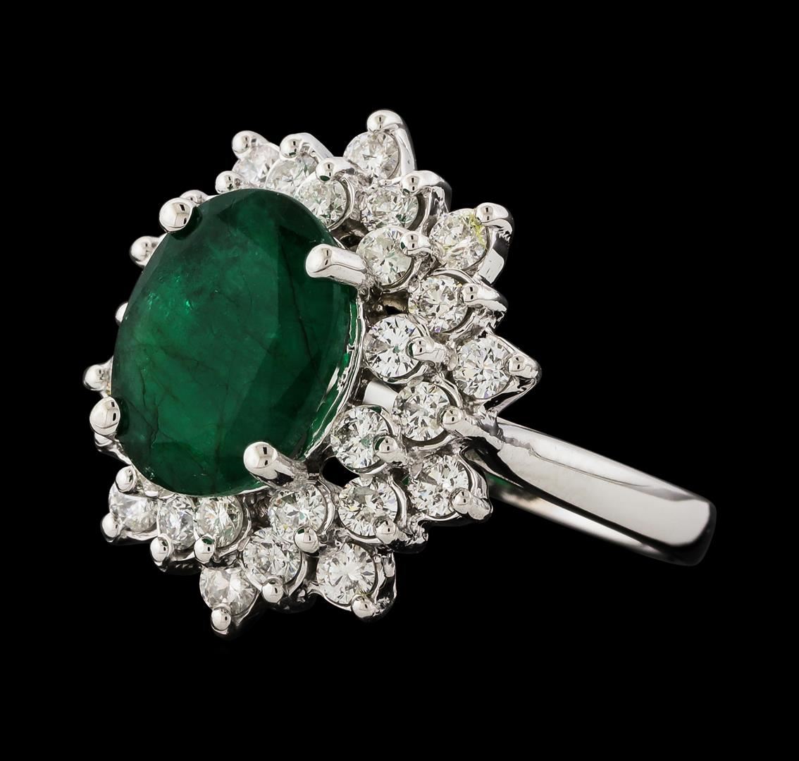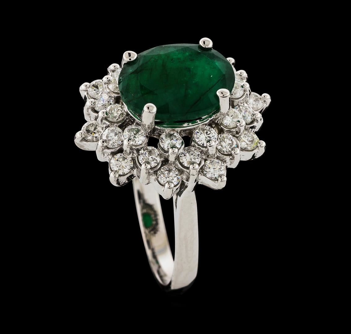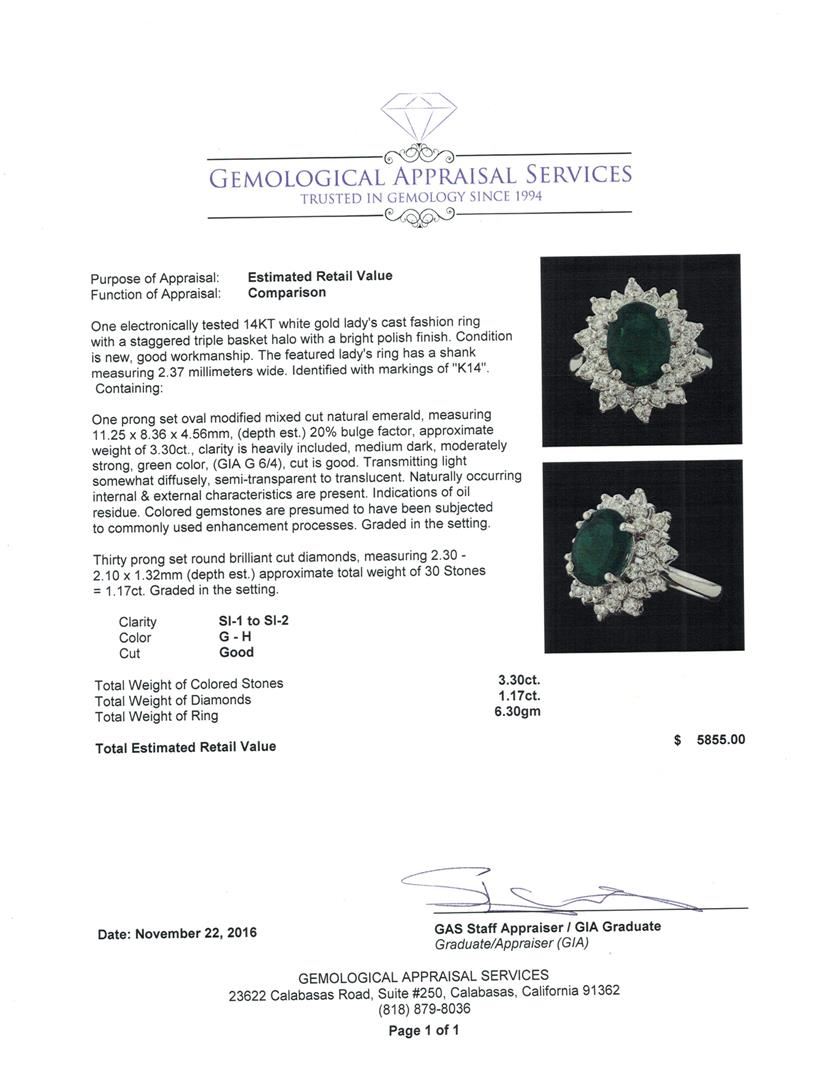 One electronically tested 14KT white gold lady's cast fashion ring with a staggered triple basket halo with a bright polish finish. The featured lady's ring has a shank measuring 2.37 millimeters wide. Identified with markings of 'K14'. Condition is new, good workmanship. Containing: One prong set oval modified mixed cut natural emerald, measuring 11.25 x 8.36 x 4.56mm, (depth est.) 20%. bulge factor, approximate weight of 3.30 ct., clarity is heavily included, medium dark, moderately strong, green color, (GIA G 6/4), cut is good. Transmitting light somewhat diffusely, semi-transparent to translucent. Naturally occurring internal & external characteristics are present. Indications of oil residue. Colored gemstones are presumed to have been subjected to commonly used enhancement processes. Graded in the setting. Thirty prong set round brilliant cut diamonds, measuring 2.30 - 2.10 x 1.32mm (depth est.) approximate total weight of 30 Stones = 1.17ct. Graded in the setting. Clarity SI-1 to SI-2. Color: G - H Cut Good. Total Weight of Colored Stones 3.30 ct.. Total Weight of Diamonds 1.17ct.. Total Weight of Ring 6.30gm. GAS Appraised.