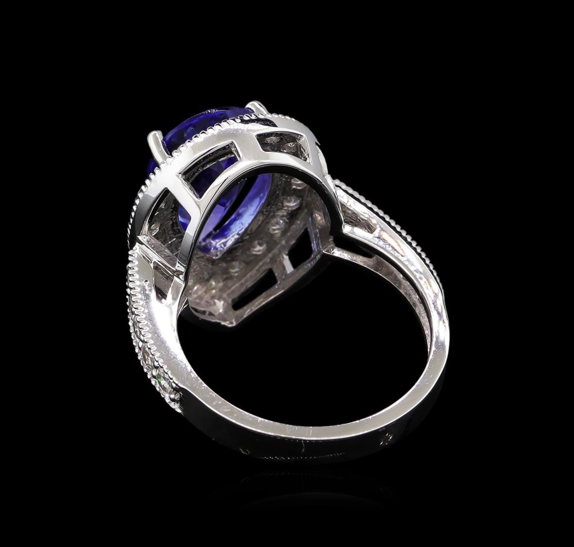 One electronically tested 14KT white gold lady's cast fashion ring with a cathedral shank with a halo with a bright polish with milgrain detailing finish. The featured lady's ring has a shank measuring 3.27 millimeters wide. Identified with markings of "K14". Condition is new, good workmanship. Containing: One prong set pear modified brilliant cut natural tanzanite, measuring 13.45 x 8.81 x 4.51mm, approximate weight of 3.30ct., clarity is eye clean, type I, medium dark, moderately strong, violetish blue color, (GIA vB 6/4), cut is very good. Transmitting light with no distortion, transparent. Colored gemstones are presumed to have been subjected to commonly used enhancement processes. Graded in the setting. Ten prong set round brilliant cut diamonds, measuring 2.30 - 2.20 x 1.35mm (depth est.) approximate total weight of 10 Stones = 0.42ct. Graded in the setting. Clarity: SI-1 to SI-2. Color: G - I. Cut Good Nineteen prong set round brilliant cut diamonds, measuring 2.10 - 2.00 x 1.23mm (depth est.) approximate total weight of 19 Stones = 0.60ct. Graded in the setting. Clarity: SI-1 to SI-2. Color: G - I. Cut Good. Total Weight of Colored Stones 3.30ct. Total Weight of Diamonds 1.02ct. Total Weight of Ring 7.10gm. GAS Appraised at $9,085.00.
