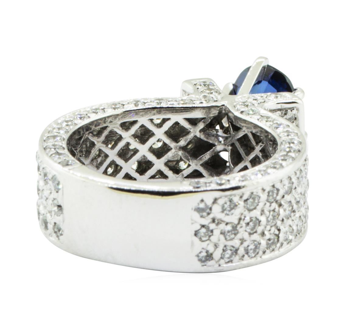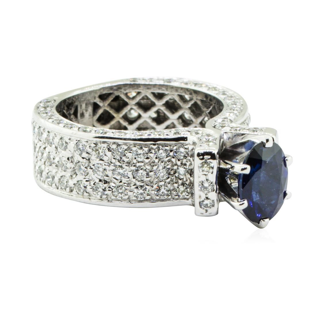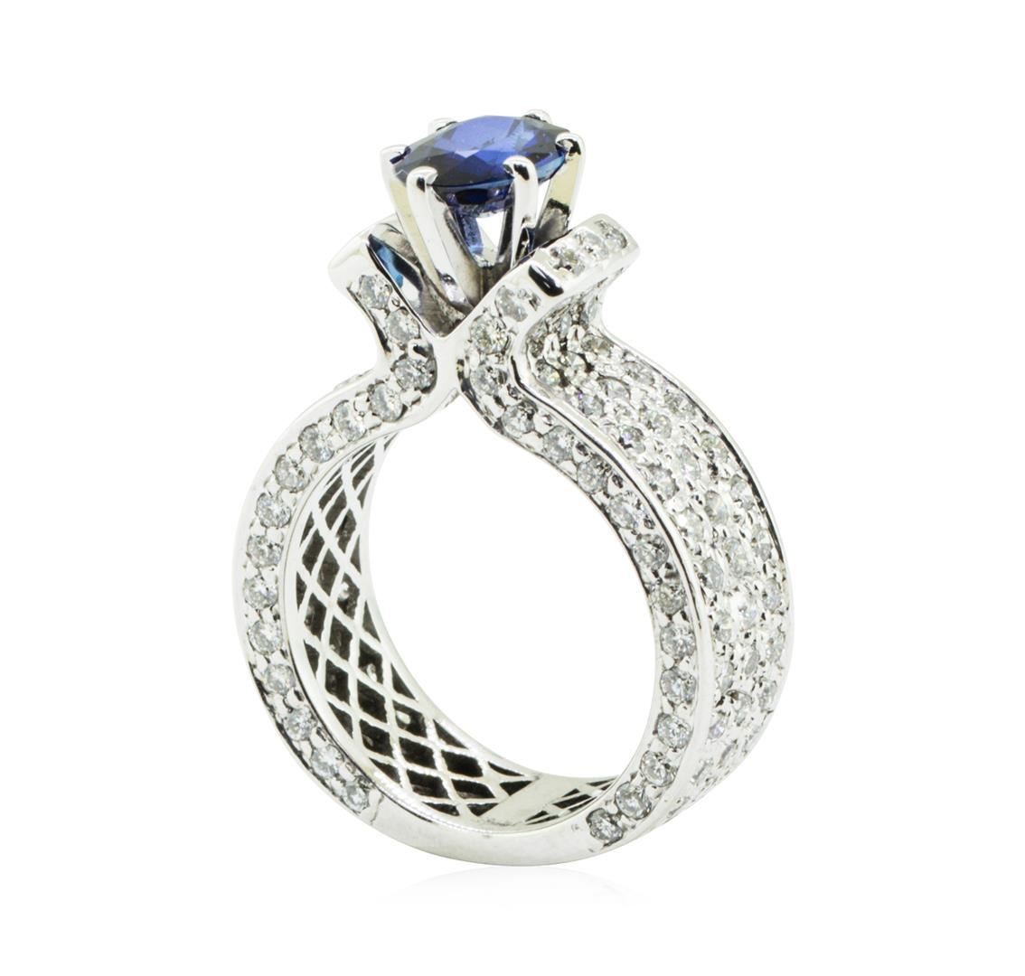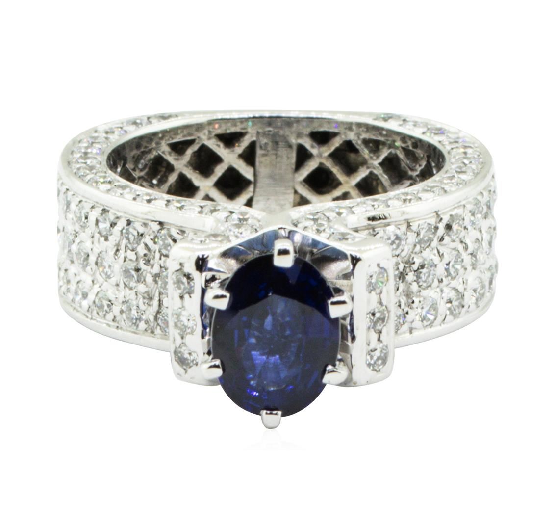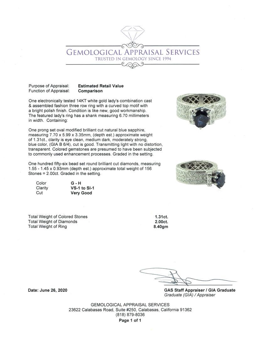 One electronically tested 14KT white gold lady's combination cast & assembled fashion three row ring with a curved top motif with a bright polish finish. The featured lady's ring has a shank measuring 6.70 millimeters in width. Condition is like new, good workmanship. Containing: One prong set oval modified brilliant cut natural blue sapphire, measuring 7.70 x 5.99 x 3.35mm, (depth est.) approximate weight of 1.31ct., clarity is eye clean, medium dark, moderately strong, blue color, (GIA B 6/4), cut is good. Transmitting light with no distortion, transparent. Colored gemstones are presumed to have been subjected to commonly used enhancement processes. Graded in the setting. One Hundred Fifty-Six bead set round brilliant cut diamonds, measuring 1.55 - 1.45 x 0.93mm (depth est.) approximate total weight of 156 Stones = 2.00ct. Graded in the setting. Color G - H Clarity VS-1 to SI-1 Cut Very Good. Total Weight of Colored Stones 1.31ct.. Total Weight of Diamonds 2.00ct.. Total Weight of Ring 8.40gm GAS Appraised at $9065.00. GAS Appraised.