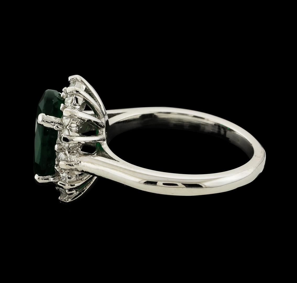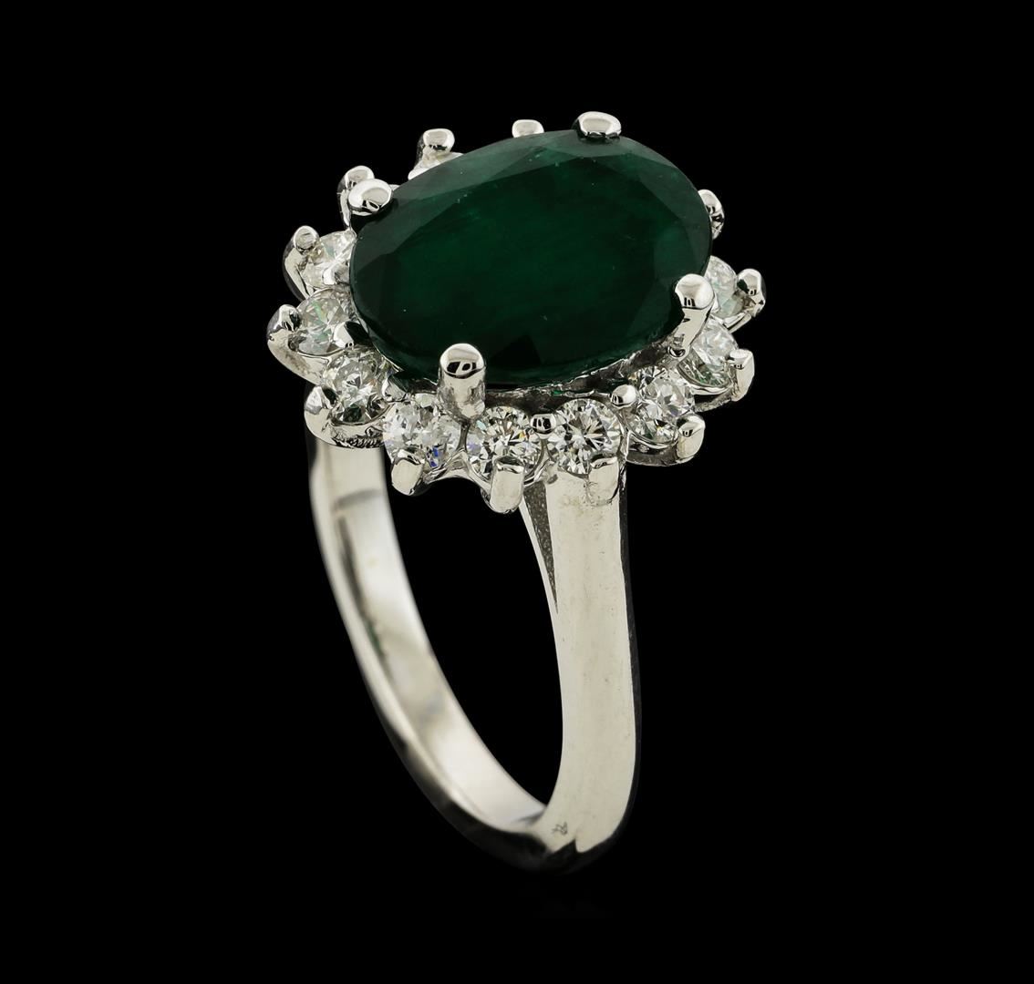 One electronically tested 14KT white gold lady's cast fashion ring with a cathedral shank with a basket halo with a bright polish finish. The featured lady's ring has a shank measuring 2.08 millimeters wide. Identified with markings of '14K'. Condition is new, good workmanship. Containing: One prong set oval modified mixed cut natural emerald, measuring 11.60 x 8.60 x 4.77mm, (depth est.) 15%. bulge factor, approximate weight of 3.32ct., clarity is heavily included, medium, moderately strong, green color, (GIA G 5/4), cut is good. Transmitting light somewhat diffusely, semi-transparent to translucent. Indications of oil residue. Naturally occurring internal & external characteristics are present. Colored gemstones are presumed to have been subjected to commonly used enhancement processes. Graded in the setting. Fourteen prong set round brilliant cut diamonds, measuring 2.40 - 2.35 x 1.48mm (depth est.) approximate total weight of 14 Stones = 0.72ct. Graded in the setting. Clarity SI-1 to SI-3. Color: F - G Cut Good. Total Weight of Colored Stones 3.32ct.. Total Weight of Diamonds 0.72ct.. Total Weight of Ring 5.50gm. GAS Appraised.
