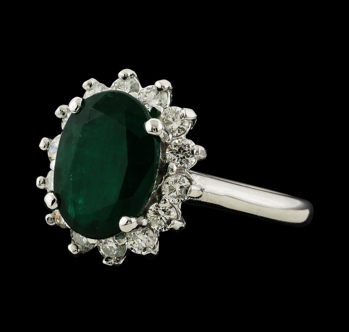 One electronically tested 14KT white gold lady's cast fashion ring with a cathedral shank with a basket halo with a bright polish finish. The featured lady's ring has a shank measuring 2.08 millimeters wide. Identified with markings of '14K'. Condition is new, good workmanship. Containing: One prong set oval modified mixed cut natural emerald, measuring 11.60 x 8.60 x 4.77mm, (depth est.) 15%. bulge factor, approximate weight of 3.32ct., clarity is heavily included, medium, moderately strong, green color, (GIA G 5/4), cut is good. Transmitting light somewhat diffusely, semi-transparent to translucent. Indications of oil residue. Naturally occurring internal & external characteristics are present. Colored gemstones are presumed to have been subjected to commonly used enhancement processes. Graded in the setting. Fourteen prong set round brilliant cut diamonds, measuring 2.40 - 2.35 x 1.48mm (depth est.) approximate total weight of 14 Stones = 0.72ct. Graded in the setting. Clarity SI-1 to SI-3. Color: F - G Cut Good. Total Weight of Colored Stones 3.32ct.. Total Weight of Diamonds 0.72ct.. Total Weight of Ring 5.50gm. GAS Appraised.