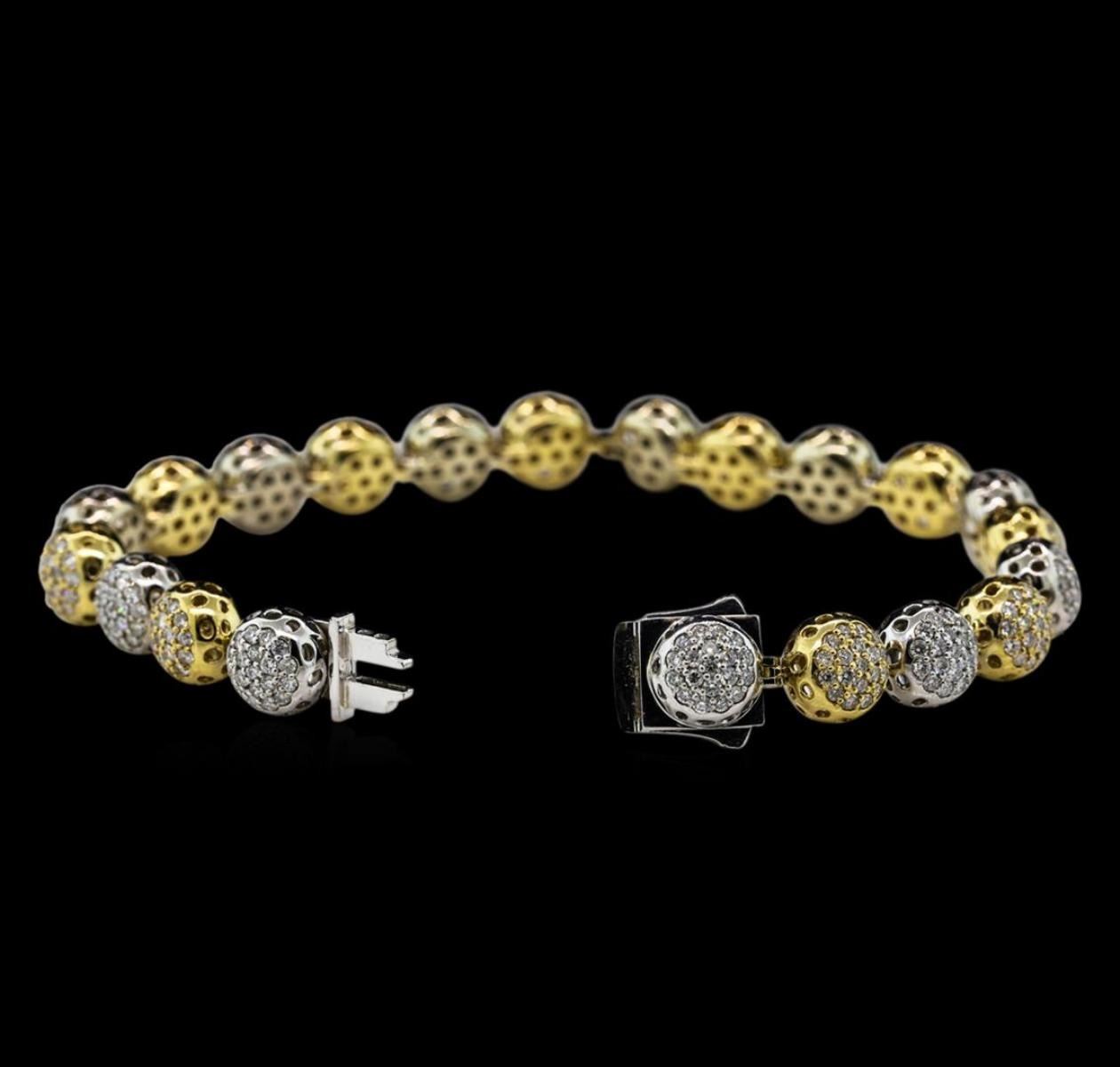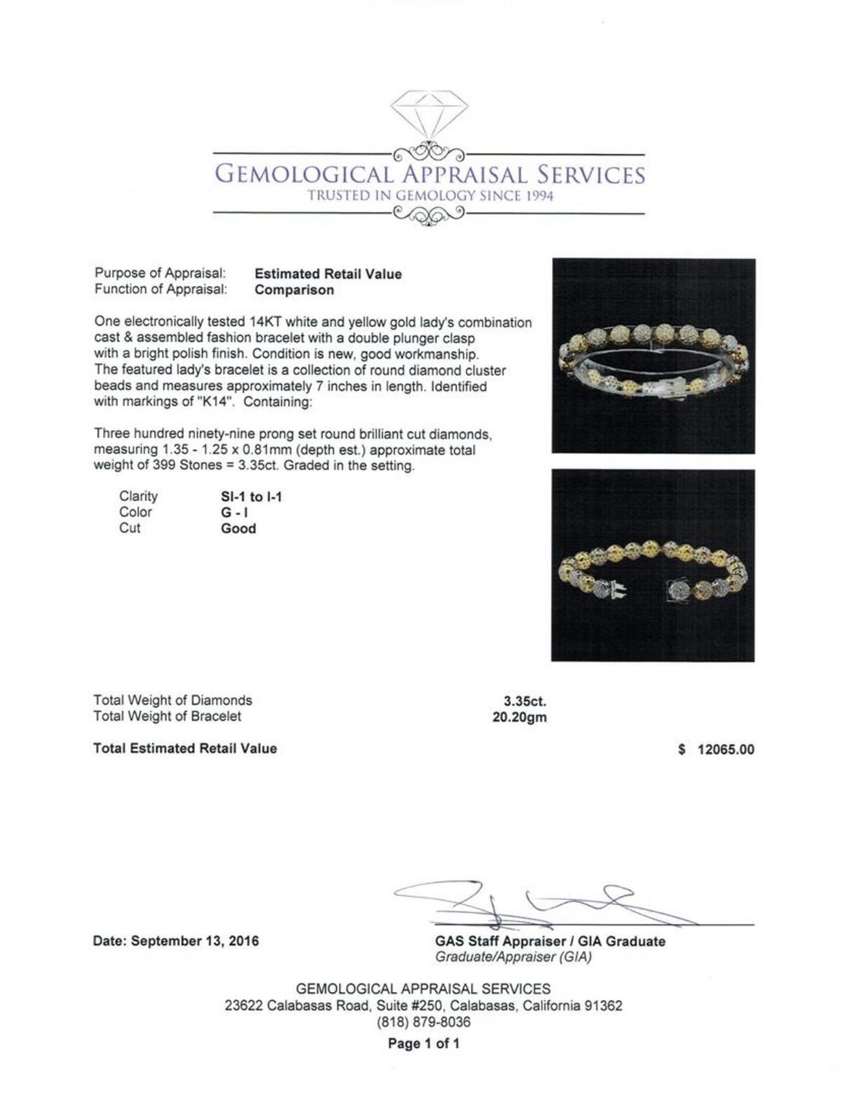 One electronically tested 14KT white and yellow gold lady's combination cast & assembled fashion bracelet with a double plunger clasp with a bright polish finish. The featured lady's bracelet is a collection of round diamond cluster beads and measures approximately 7 inches in length. Identified with markings of 'K14'. Condition is new, good workmanship. Containing: Three Hundred Ninety-Nine prong set round brilliant cut diamonds, measuring 1.35 - 1.25 x 0.81mm (depth est.) approximate total weight of 399 Stones = 3.35ct. Graded in the setting. Clarity SI-1 to I-1. Color: G - I Cut Good. Total Weight of Diamonds 3.35ct.. Total Weight of Bracelet 20.20gm GAS Appraised.