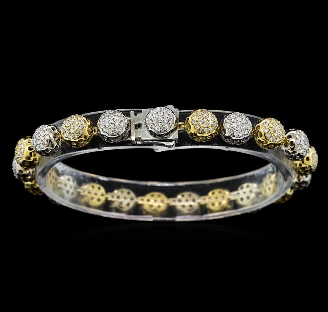 One electronically tested 14KT white and yellow gold lady's combination cast & assembled fashion bracelet with a double plunger clasp with a bright polish finish. The featured lady's bracelet is a collection of round diamond cluster beads and measures approximately 7 inches in length. Identified with markings of 'K14'. Condition is new, good workmanship. Containing: Three Hundred Ninety-Nine prong set round brilliant cut diamonds, measuring 1.35 - 1.25 x 0.81mm (depth est.) approximate total weight of 399 Stones = 3.35ct. Graded in the setting. Clarity SI-1 to I-1. Color: G - I Cut Good. Total Weight of Diamonds 3.35ct.. Total Weight of Bracelet 20.20gm GAS Appraised.