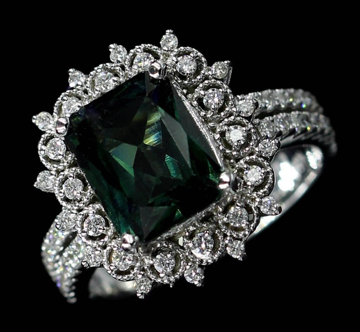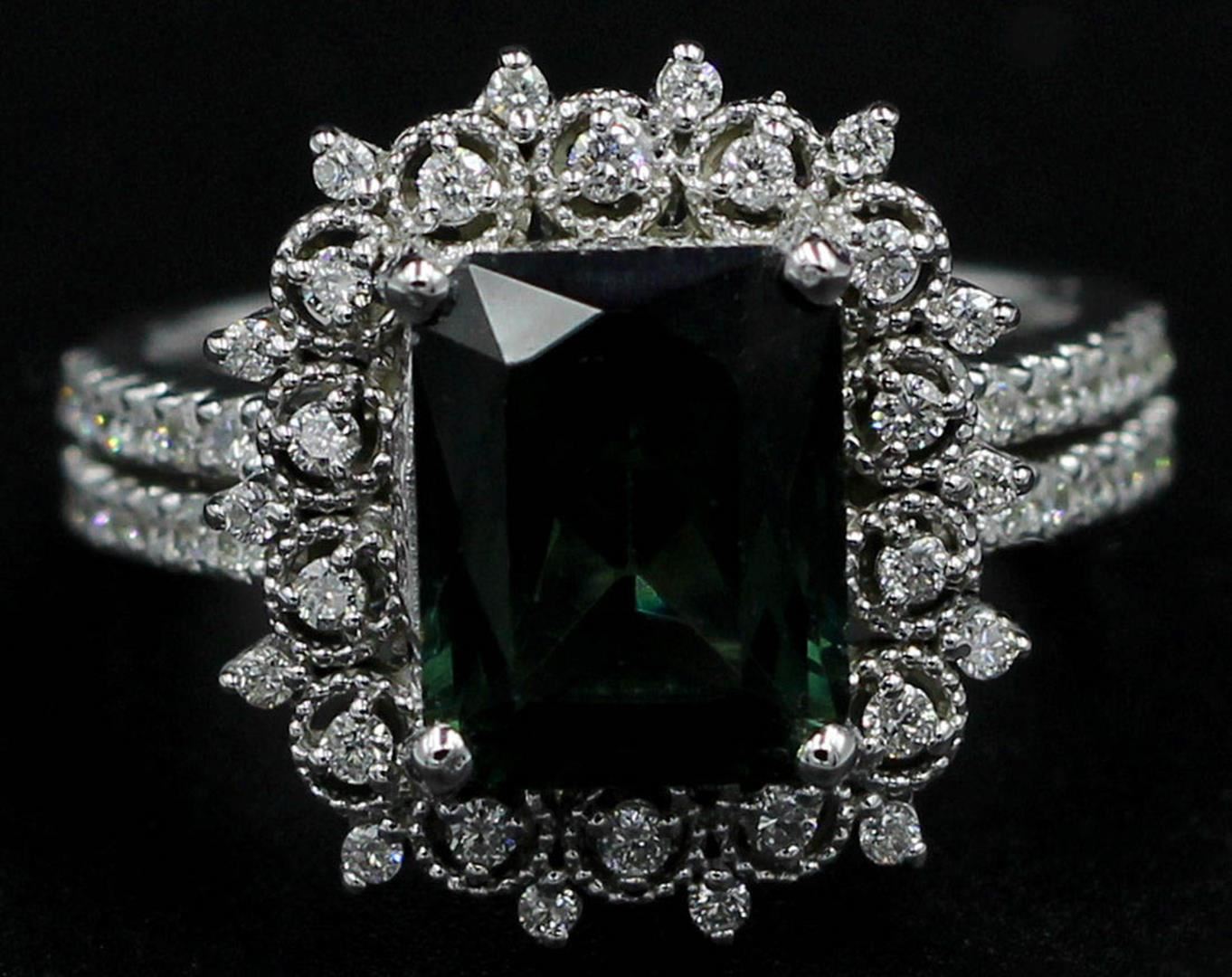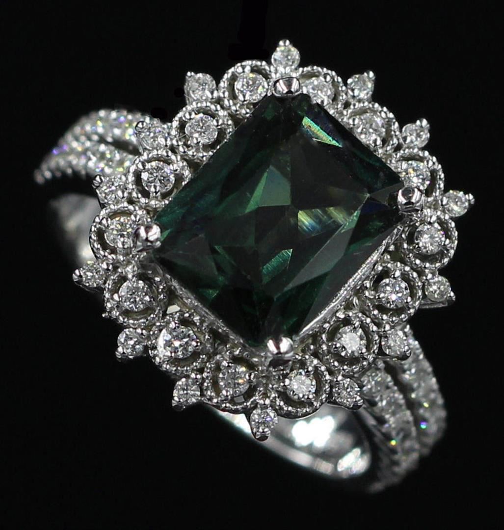 One ring featuring: 14KT white gold weighing 6.97 grams containing one green tourmaline weighing 3.35ct and 59 diamonds weighing 0.54ctw. The green tourmaline is emerald cut with fine clarity, fine dark green color and excellent cut. The diamonds are round brilliant cut and are natural, unenhanced stones with SI clarity, G color and excellent cut. The ring is a size 7 but is resizable.