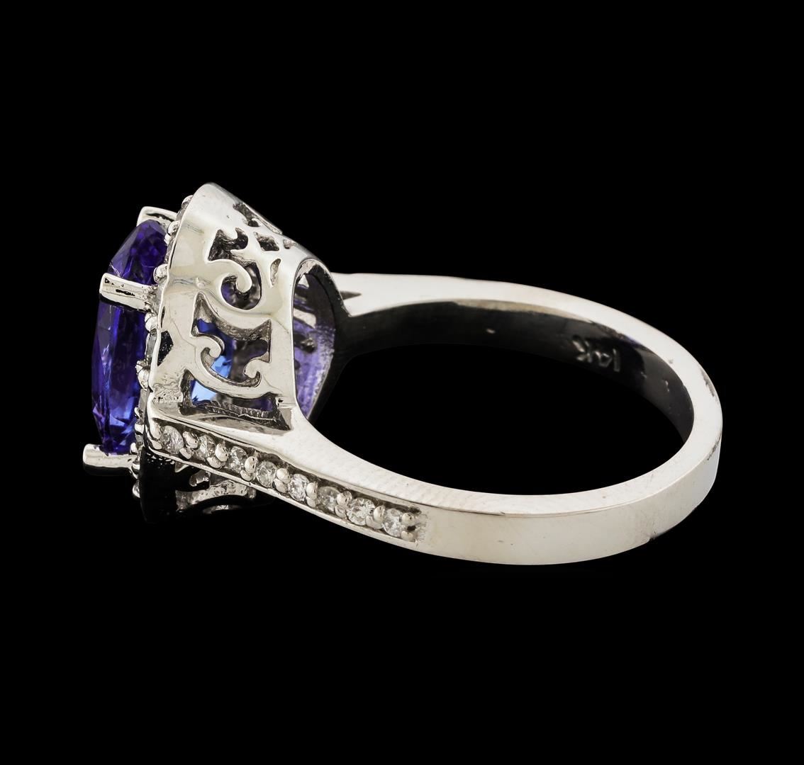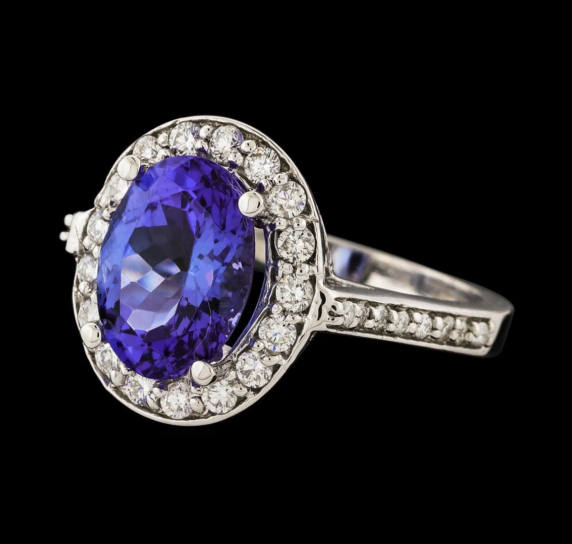 One electronically tested 14KT white gold lady's cast fashion ring with a cathedral shank with a halo with a bright polish finish. The featured lady's ring has a shank measuring 2.58 millimeters wide. Identified with markings of '14K'. Condition is new, good workmanship. Containing: One prong set oval modified brilliant cut natural tanzanite, measuring 11.00 x 8.25 x 5.51mm, (depth est.) approximate weight of 3.35ct., clarity is eye clean, medium, moderately strong, bluish violet color, (GIA bV 5/4), cut is very good. Transmitting light with no distortion, transparent. Colored gemstones are presumed to have been subjected to commonly used enhancement processes. Graded in the setting. Seventeen prong set round brilliant cut diamonds, measuring 1.95 - 1.85 x 1.18mm (depth est.) approximate total weight of 17 Stones = 0.45ct. Graded in the setting. Clarity VS-2 to SI-2. Color: G - H Cut Good Sixteen prong set round brilliant cut diamonds, measuring 1.40 - 1.30 x 0.81mm (depth est.) approximate total weight of 16 Stones = 0.14ct. Graded in the setting. Clarity SI-1 to SI-2. Color: G - H Cut Good. Total Weight of Colored Stones 3.35ct.. Total Weight of Diamonds 0.59ct.. Total Weight of Ring 6.50gm. GAS Appraised at $7,685.00.