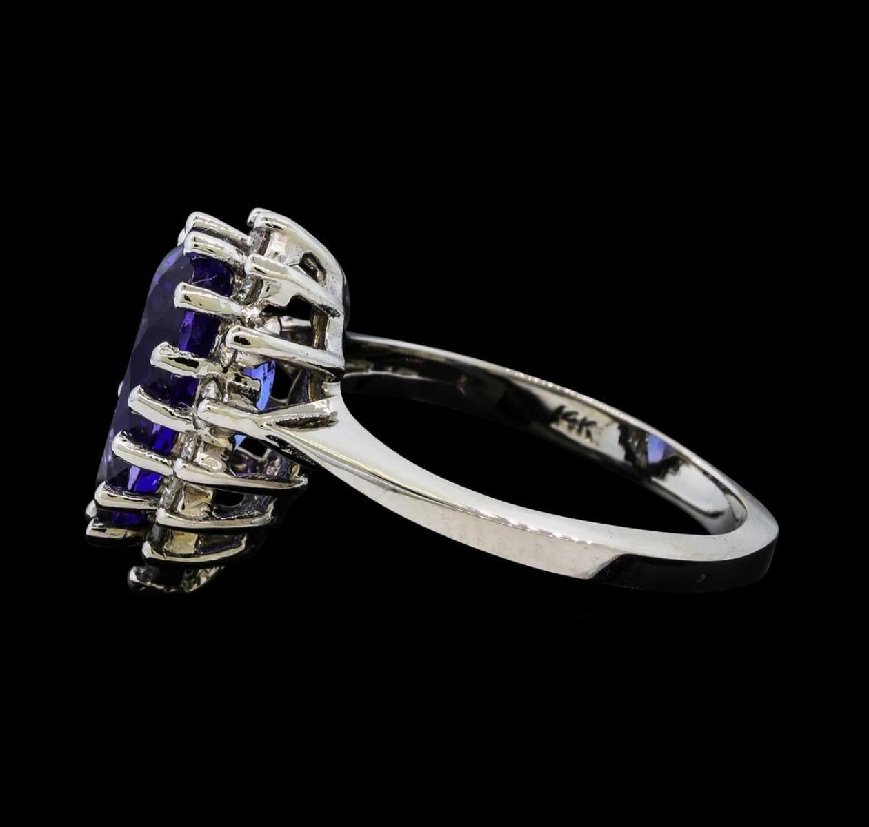 One electronically tested 14KT white gold lady's cast fashion ring with a basket halo with a bright polish finish. The featured lady's ring has a shank measuring 2.40 millimeters wide. Identified with markings of '14K'. Condition is new, good workmanship. Containing: One prong set pear modified brilliant cut natural tanzanite, measuring 13.00 x 8.10 x 5.50mm, (depth est.) approximate weight of 3.35ct., clarity is eye clean, medium dark, strong, violetish blue color, (GIA vB 6/5), cut is very good. Transmitting light with no distortion, transparent. Colored gemstones are presumed to have been subjected to commonly used enhancement processes. Graded in the setting. Fourteen prong set round brilliant cut diamonds, measuring 1.95 - 1.85 x 1.14mm (depth est.) approximate total weight of 14 Stones = 0.35ct. Graded in the setting. Clarity SI-1 to SI-2. Color: H - I Cut Good. Total Weight of Colored Stones 3.35ct.. Total Weight of Diamonds 0.35ct.. Total Weight of Ring 4.90gm.