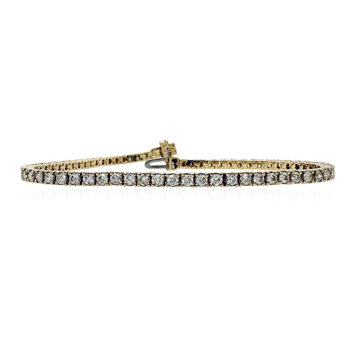 One electronically tested 14KT white gold lady's combination cast & assembled fashion straight line tennis bracelet with a tongue clasp with fold-under safety with a basket motif with a bright polish finish. Condition is new, good workmanship. The featured lady's bracelet measures approximately 7.00 inches in length. Identified with markings of 14K. Containing: 69 prong set round brilliant cut diamonds, approximate total weight of 69 stones = 3.36 ctw. Graded in the setting. Total weight of Diamonds: 3.36 ctw. Total estimated retail value: $9370