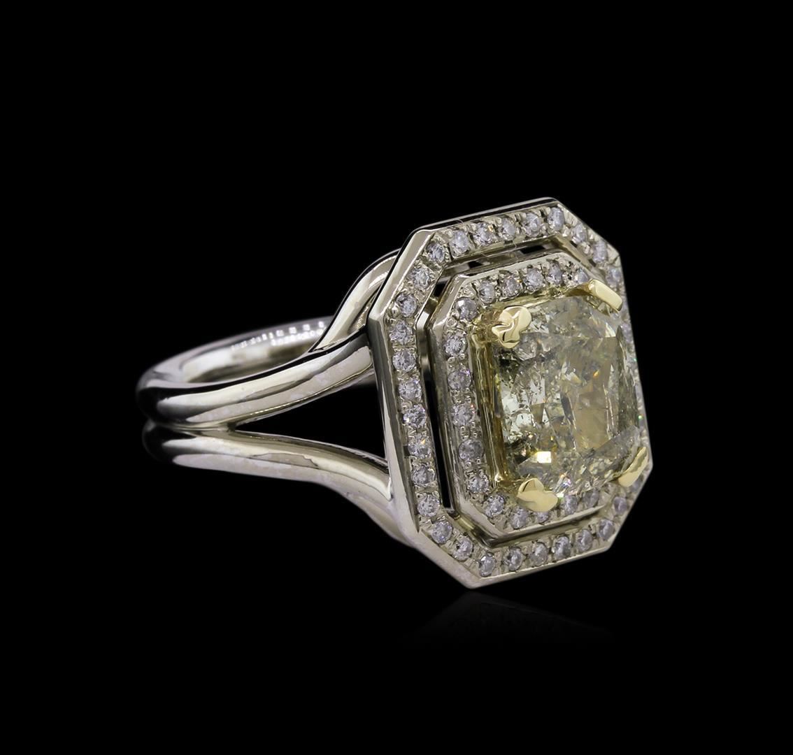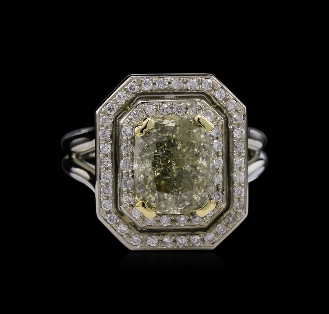 One electronically tested 14KT white and yellow gold lady's combination cast & assembled wedding ring with a double split shank with a bright polish finish. The featured lady's ring has a double shank measuring 4.18 millimeters wide. Identified with markings of "14K". Condition is new, good workmanship. Containing: One prong set cushion cut diamond, measuring 9.20 x 7.96 x 4.94mm (depth est.) approximate weight of 3.01ct. Graded in the setting. Clarity: I-1 Cut Very Good Fifty prong set round brilliant cut diamonds, measuring 1.25 - 1.20 x 0.77mm (depth est.) approximate total weight of 50 Stones = 0.35ct. Graded in the setting. Clarity: SI-1 to I-1. Color: H - I. Cut Good. Total Weight of Diamonds 3.36ct. Total Weight of Ring 12.40gm. GAS Appraised.