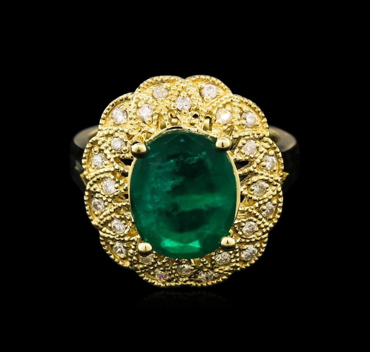One electronically tested 14KT yellow gold lady's cast fashion ring with a split shank with a bright polish with milgrain detailing finish. The featured lady's ring has a scalloped halo motif with a 2.70 millimeter wide shank. Identified with markings of "14K". Condition is new, good workmanship. Containing: One prong set oval modified brilliant cut natural emerald, measuring 11.36 x 9.30 x 5.41mm, approximate weight of 3.38ct., clarity is moderately included, type III, medium, very slightly grayish, very slightly bluish green color, (GIA vslbG 5/3), cut is good. Transmitting light somewhat diffusely, semi-transparent to translucent. Indications of oil residue. Naturally occurring internal & external characteristics are present. Graded in the setting. Twenty-Eight prong set round brilliant cut diamonds, measuring 1.40 - 1.30 x 0.88mm (depth est.) approximate total weight of 28 Stones = 0.28ct. Graded in the setting. Clarity: SI-2 to I-1. Color: H - I. Cut Good. Total Weight of Colored Stones 3.38ct. Total Weight of Diamonds 0.28ct. Total Weight of Ring 7.40gm. GAS Appraised.