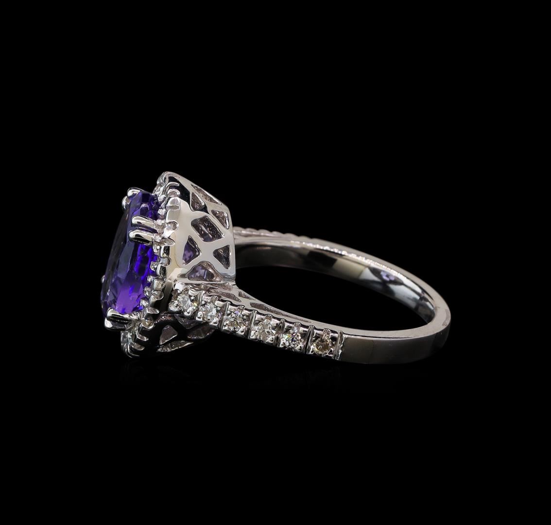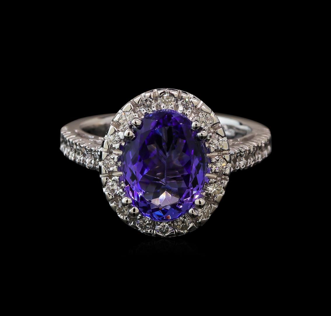 One electronically tested 14KT white gold lady's cast fashion ring with a basket halo with a bright polish finish. The featured lady's ring has a shank measuring 2.28 millimeters wide. Identified with markings of '14K'. Condition is new. Containing: One prong set oval modified brilliant cut natural tanzanite, measuring 11.13 x 8.34 x 4.71mm, (depth est.) 10%. bulge factor, approximate weight of 3.38ct., clarity is eye clean, medium light, moderately strong, violet color, (GIA V 4/4), cut is good. Transmitting light with no distortion, transparent. Colored gemstones are presumed to have been subjected to commonly used enhancement processes. Graded in the setting. Twenty-Eight prong set round brilliant cut diamonds, measuring 1.75 - 1.65 x 1.05mm (depth est.) approximate total weight of 28 Stones = 0.54ct. Graded in the setting. Clarity SI-1 to I-1. Color: H - I Cut Good. Total Weight of Colored Stones 3.38ct. Total Weight of Diamonds 0.54ct. Total Weight of Ring 6.50gm.