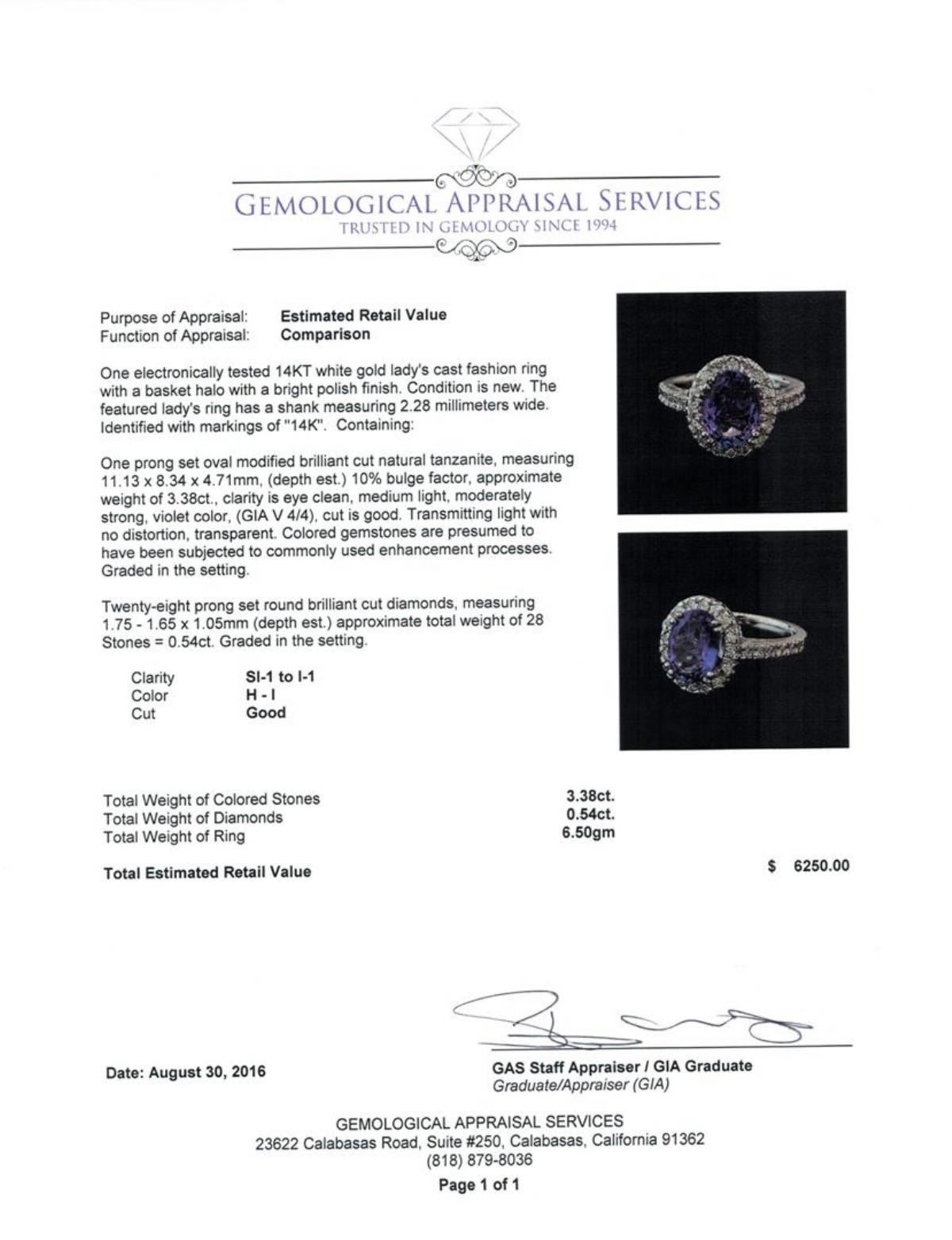One electronically tested 14KT white gold lady's cast fashion ring with a basket halo with a bright polish finish. The featured lady's ring has a shank measuring 2.28 millimeters wide. Identified with markings of '14K'. Condition is new. Containing: One prong set oval modified brilliant cut natural tanzanite, measuring 11.13 x 8.34 x 4.71mm, (depth est.) 10%. bulge factor, approximate weight of 3.38ct., clarity is eye clean, medium light, moderately strong, violet color, (GIA V 4/4), cut is good. Transmitting light with no distortion, transparent. Colored gemstones are presumed to have been subjected to commonly used enhancement processes. Graded in the setting. Twenty-Eight prong set round brilliant cut diamonds, measuring 1.75 - 1.65 x 1.05mm (depth est.) approximate total weight of 28 Stones = 0.54ct. Graded in the setting. Clarity SI-1 to I-1. Color: H - I Cut Good. Total Weight of Colored Stones 3.38ct. Total Weight of Diamonds 0.54ct. Total Weight of Ring 6.50gm.