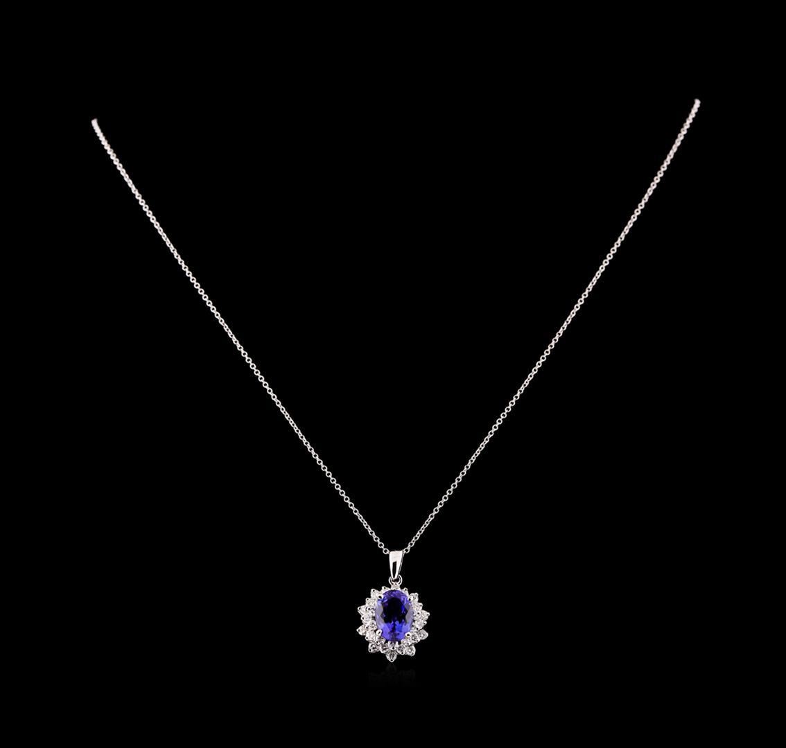 One electronically tested 14KT white gold lady's combination cast & assembled fashion pendant & chain 18.0' long, 1.3mm round cable link with a lobster claw clasp with a bright polish finish. The featured lady's pendant and chain has a drop measuring 25 millimeters in length. Identified with markings of '14K'. Condition is new, good workmanship. Containing: One prong set oval modified brilliant cut natural tanzanite, measuring 10.74 x 7.80 x 5.32mm, (depth est.) 5%. bulge factor, approximate weight of 3.40ct., clarity is eye clean, medium, moderately strong, bluish violet color, (GIA bV 5/4), cut is very good. Transmitting light with no distortion, transparent. Colored gemstones are presumed to have been subjected to commonly used enhancement processes. Graded in the setting. Thirty prong set round brilliant cut diamonds, measuring 2.05 - 2.00 x 1.26mm (depth est.) approximate total weight of 30 Stones = 0.95ct. Graded in the setting. Clarity SI-1 to SI-2. Color: H - I Cut Good. Total Weight of Colored Stones 3.40ct.. Total Weight of Diamonds 0.95ct.. Total Weight of Pendant & Chain 5.90gm. GAS Appraised.