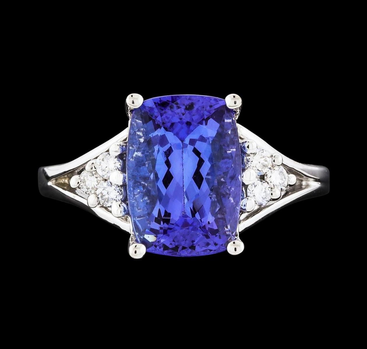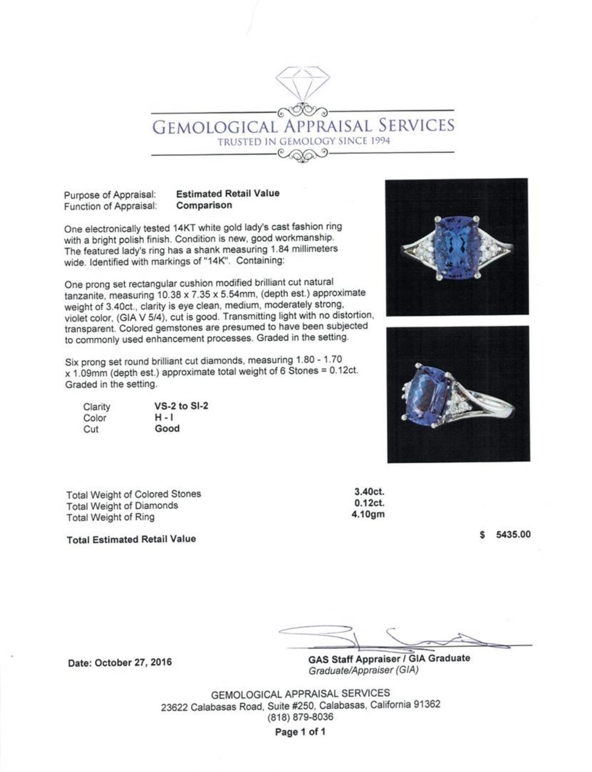One electronically tested 14KT white gold lady's cast fashion ring with a bright polish finish. The featured lady's ring has a shank measuring 1.84 millimeters wide. Identified with markings of '14K'. Condition is new, good workmanship. Containing: One prong set rectangular cushion modified brilliant cut natural tanzanite, measuring 10.38 x 7.35 x 5.54mm, (depth est.) approximate weight of 3.40ct., clarity is eye clean, medium, moderately strong, violet color, (GIA V 5/4), cut is good. Transmitting light with no distortion, transparent. Colored gemstones are presumed to have been subjected to commonly used enhancement processes. Graded in the setting. Six prong set round brilliant cut diamonds, measuring 1.80 - 1.70 x 1.09mm (depth est.) approximate total weight of 6 Stones = 0.12ct. Graded in the setting. Clarity VS-2 to SI-2. Color: H - I Cut Good. Total Weight of Colored Stones 3.40ct.. Total Weight of Diamonds 0.12ct.. Total Weight of Ring 4.10gm.
