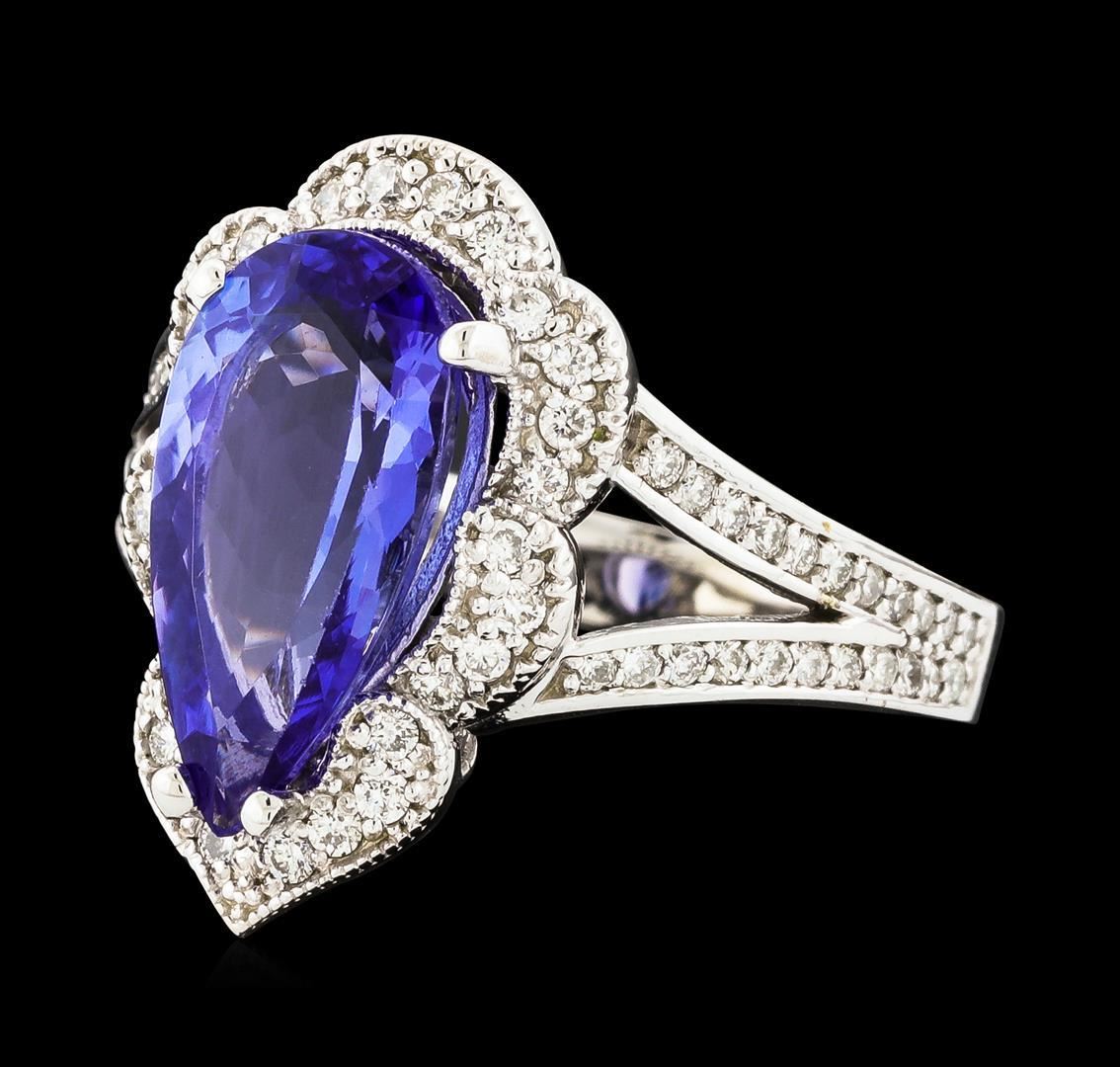 One electronically tested 14KT white gold lady's cast fashion ring with a split shank scalloped basket halo with a bright polish with milgrain detailing finish. The featured lady's ring has a shank measuring 2.93 millimeters wide. Identified with markings of 'K14'. Condition is new, good workmanship. Containing: One prong set pear modified brilliant cut natural tanzanite, measuring 14.47 x 7.47 x 4.81mm, (depth est.) approximate weight of 3.40ct., clarity is eye clean, medium, moderately strong, violetish blue color, (GIA vB 5/4), cut is good. Transmitting light with no distortion, transparent. Colored gemstones are presumed to have been subjected to commonly used enhancement processes. Graded in the setting. Twenty-Eight prong set round brilliant cut diamonds, measuring 1.40 - 1.35 x 0.86mm (depth est.) approximate total weight of 28 Stones = 0.28ct. Graded in the setting. Clarity SI-1 to SI-2. Color: H - I Cut Good Forty-Four prong set round brilliant cut diamonds, measuring 1.20 - 1.15 x 0.73mm (depth est.) approximate total weight of 44 Stones = 0.28ct. Graded in the setting. Clarity SI-1 to I-1. Color: H - I Cut Good. Total Weight of Colored Stones 3.40ct.. Total Weight of Diamonds 0.56ct.. Total Weight of Ring 7.10gm. GAS Appraised.