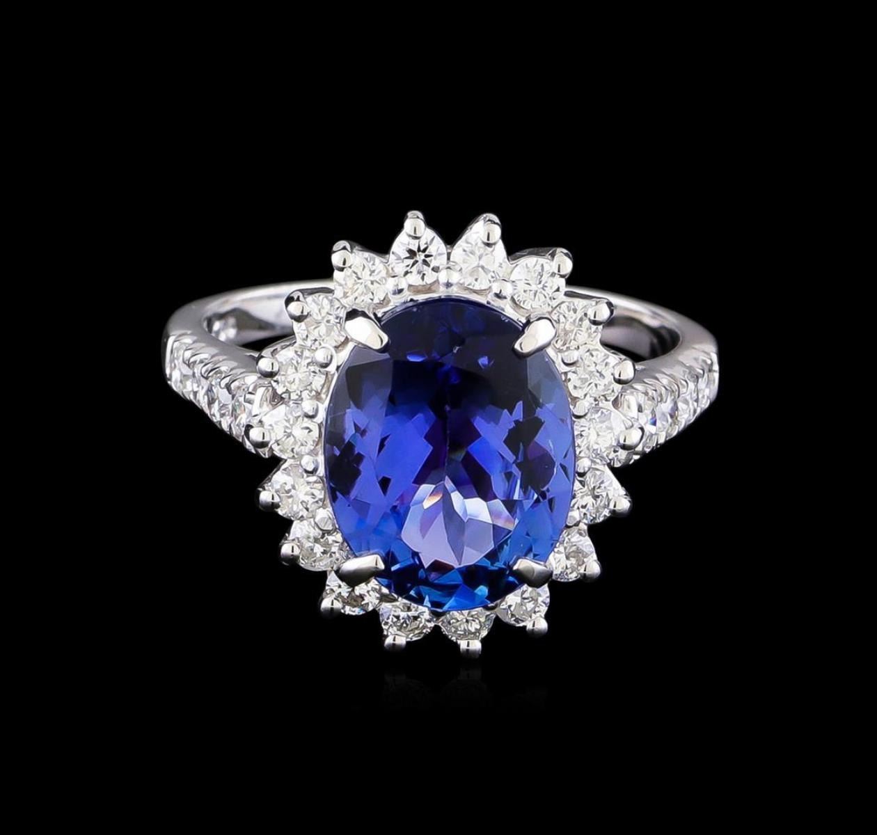 One electronically tested 14KT white gold lady's cast fashion ring with a basket halo with a bright polish finish. The featured lady's ring has a shank measuring 1.66 millimeters in width. Identified with markings of "K14". Condition is new, good workmanship. Containing: One prong set oval oval modified brilliant cut natural tanzanite, measuring 11.14 x 8.79 x 4.88mm, (depth est.) approximate weight of 3.40ct., clarity is eye clean, medium, moderately strong, violetish blue color, (GIA vB 5/4), cut is very good. Transmitting light with no distortion, transparent. Colored gemstones are presumed to have been subjected to commonly used enhancement processes. Graded in the setting. Twenty-Six prong set round brilliant cut diamonds, measuring 2.00 - 1.95 x 1.19mm (depth est.) approximate total weight of 26 Stones = 0.75ct. Graded in the setting. Clarity: SI-1 to SI-2. Color: G - Good. Total Weight of Colored Stones 3.40ct. Total Weight of Diamonds 0.75ct. Total Weight of Ring 4.70gm.