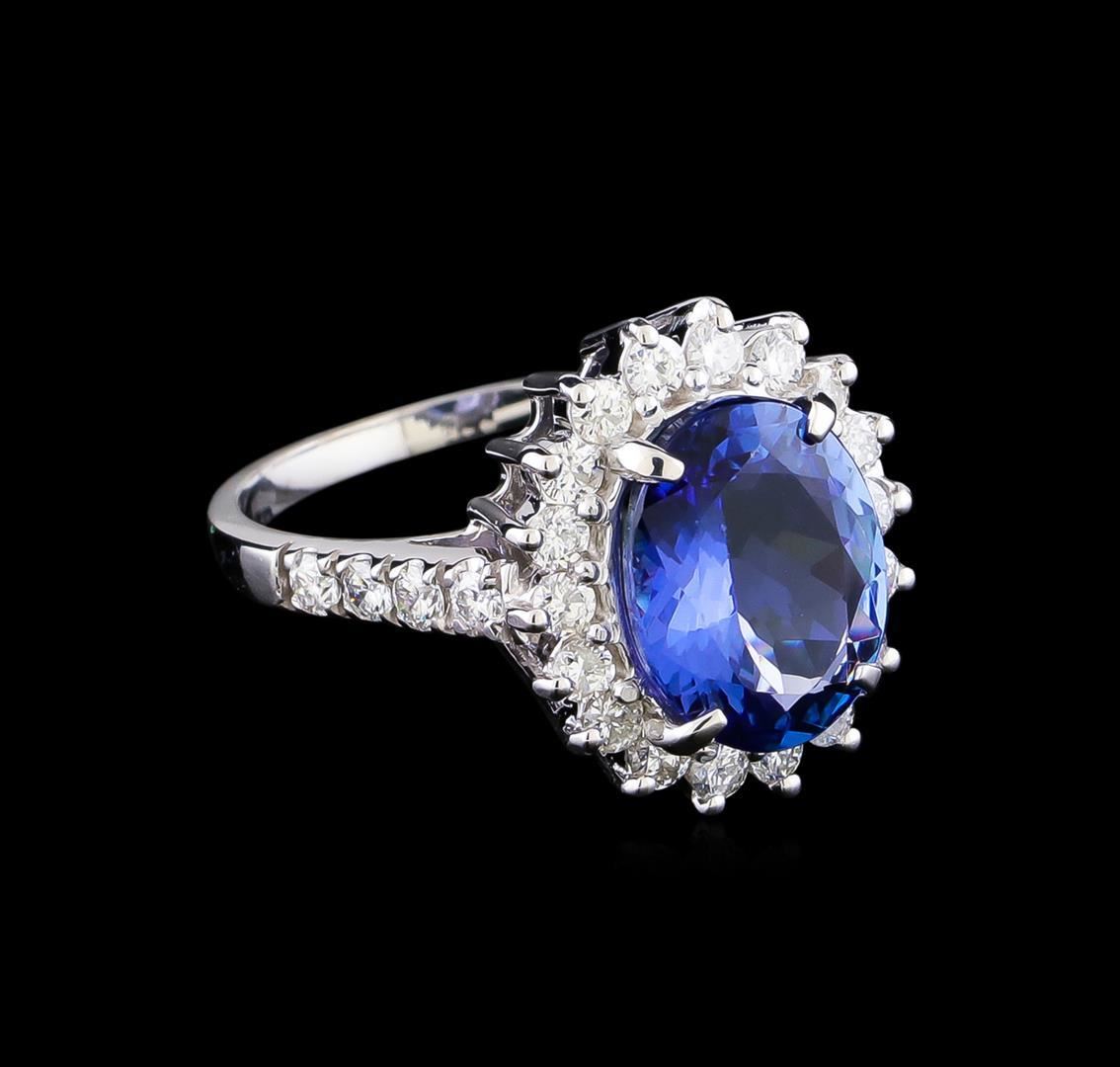 One electronically tested 14KT white gold lady's cast fashion ring with a basket halo with a bright polish finish. The featured lady's ring has a shank measuring 1.66 millimeters in width. Identified with markings of "K14". Condition is new, good workmanship. Containing: One prong set oval oval modified brilliant cut natural tanzanite, measuring 11.14 x 8.79 x 4.88mm, (depth est.) approximate weight of 3.40 ct., clarity is eye clean, medium, moderately strong, violetish blue color, (GIA vB 5/4), cut is very good. Transmitting light with no distortion, transparent. Colored gemstones are presumed to have been subjected to commonly used enhancement processes. Graded in the setting. Twenty-Six prong set round brilliant cut diamonds, measuring 2.00 - 1.95 x 1.19mm (depth est.) approximate total weight of 26 Stones = 0.75ct. Graded in the setting. Clarity: SI-1 to SI-2. Color: G - Good. Total Weight of Colored Stones 3.40 ct. Total Weight of Diamonds 0.75ct. Total Weight of Ring 4.70gm.