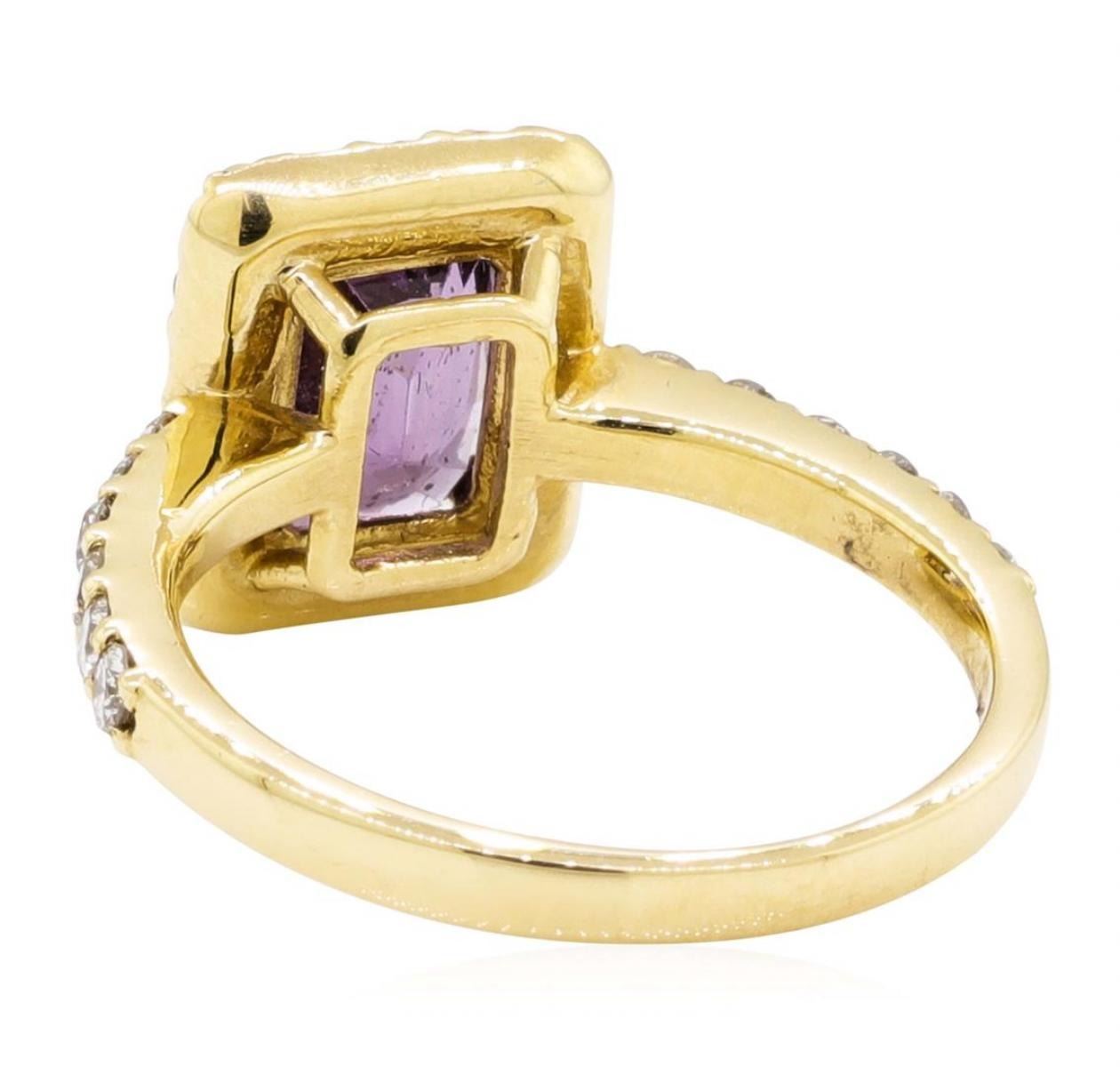 One electronically tested 14KT yellow gold lady's cast fashion ring with a cushion halo with a bright polish finish. The featured lady's ring has a shank measuring 2.00 millimeters wide. Identified with markings of '14K'. Condition is new, good workmanship. Containing: One prong set rectangular cushion modified brilliant cut natural lavender spinel, measuring 9.40 x 6.85 x 4.65mm, (depth est.) 5%. bulge factor, approximate weight of 2.77ct., clarity is slightly included, medium, moderately strong, reddish purple color, (GIA rP 5/4), cut is very good. Transmitting light with no distortion, transparent. Colored gemstones are presumed to have been subjected to commonly used enhancement processes. Graded in the setting. Thirty prong set round brilliant cut diamonds, measuring 1.80 - 1.75 x 1.10mm (depth est.) approximate total weight of 30 Stones = 0.65ct. Graded in the setting. Color H - I Clarity SI-1 to SI-2 Cut Very Good. Total Weight of Colored Stones 2.77ct.. Total Weight of Diamonds 0.65ct.. Total Weight of Ring 4.20gm GAS Appraised at $5630.00. GAS Appraised.