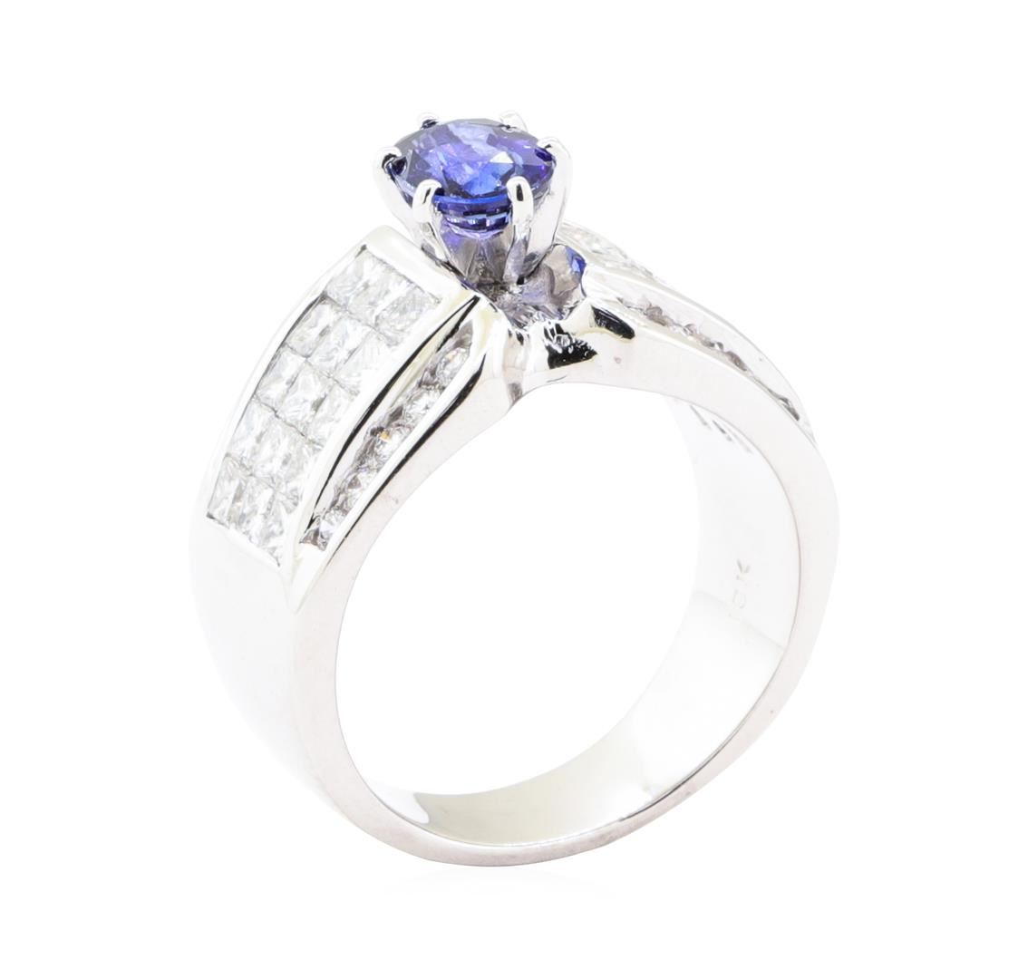 One electronically tested 18KT white gold lady's combination cast & assembled fashion ring with a tapered wide band with a bright polish finish. The featured lady's ring has a shank measuring 5.95 millimeters wide. Identified with markings of '18K'. Condition is Good. Containing: One prong set oval modified mixed cut natural blue sapphire, measuring 7.10 x 5.15 x 3.35mm, (depth est.) 5%. bulge factor, approximate weight of 1.08ct., clarity is eye clean, medium dark, moderately strong, blue color, (GIA B 6/4), cut is good. Transmitting light with no distortion, transparent. Colored gemstones are presumed to have been subjected to commonly used enhancement processes. Graded in the setting. Thirty invisible set princess cut diamonds, measuring 2.30 x 2.20 x 1.65mm (depth est.) approximate total weight of 30 Stones = 2.05ct. Graded in the setting. Color H - I Clarity VS-2 to SI-2 Cut Very Good Twenty channel set round brilliant cut diamonds, measuring 1.65 - 1.60 x 1.01mm (depth est.) approximate total weight of 20 Stones = 0.30ct. Graded in the setting. Color H - I Clarity VS-2 to SI-1 Cut Good. Total Weight of Colored Stones 1.08ct.. Total Weight of Diamonds 2.35ct.. Total Weight of Ring 13.60gm GAS Appraised at $8930.00. GAS Appraised.