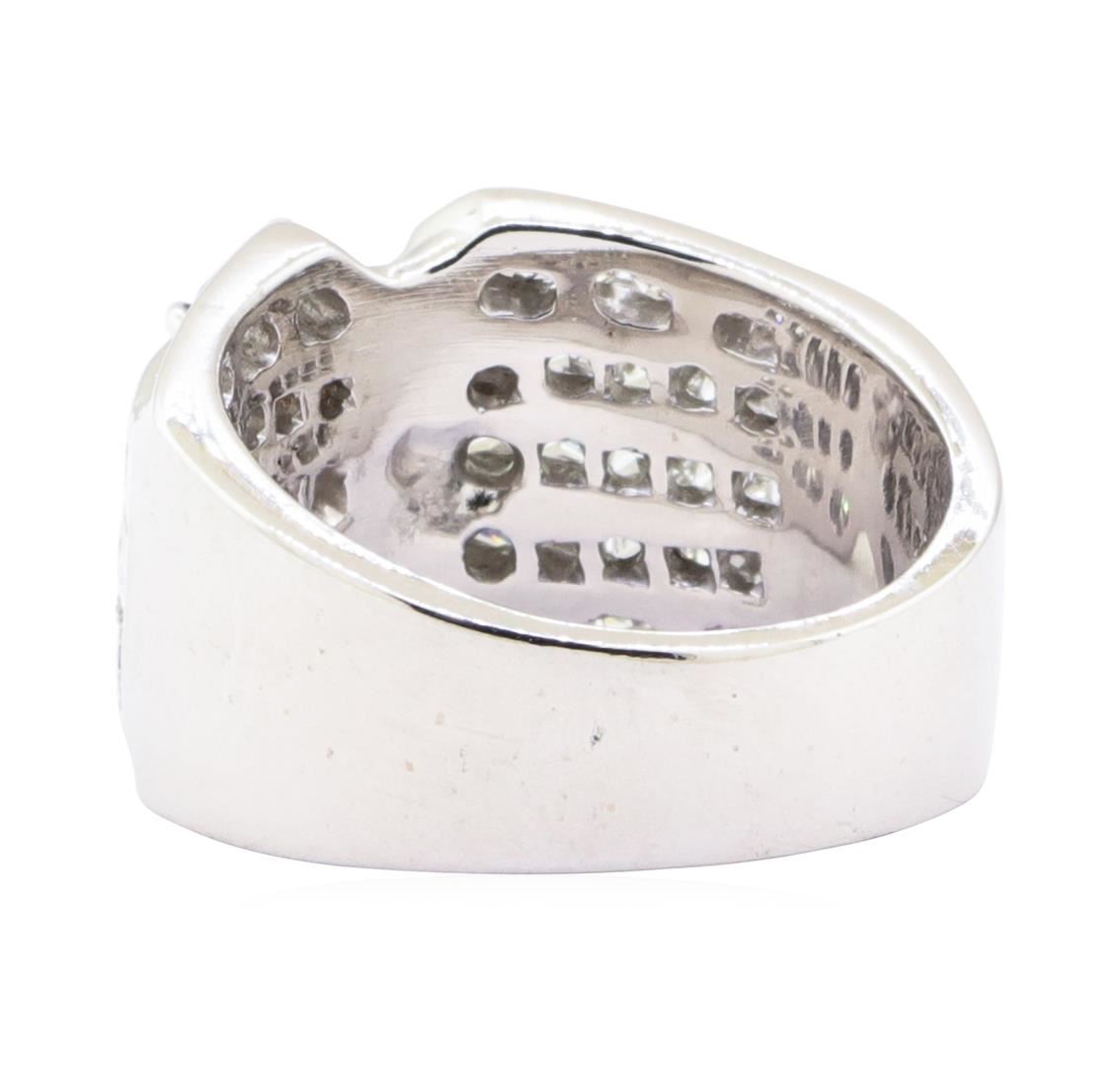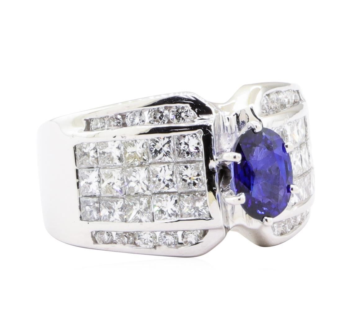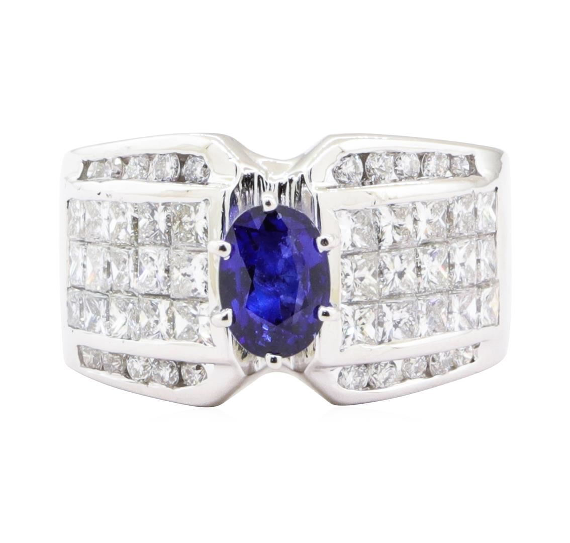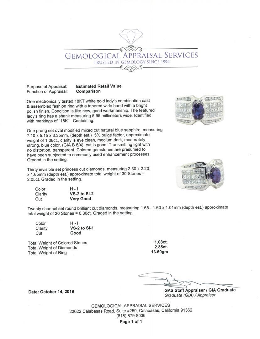 One electronically tested 18KT white gold lady's combination cast & assembled fashion ring with a tapered wide band with a bright polish finish. The featured lady's ring has a shank measuring 5.95 millimeters wide. Identified with markings of '18K'. Condition is Good. Containing: One prong set oval modified mixed cut natural blue sapphire, measuring 7.10 x 5.15 x 3.35mm, (depth est.) 5%. bulge factor, approximate weight of 1.08ct., clarity is eye clean, medium dark, moderately strong, blue color, (GIA B 6/4), cut is good. Transmitting light with no distortion, transparent. Colored gemstones are presumed to have been subjected to commonly used enhancement processes. Graded in the setting. Thirty invisible set princess cut diamonds, measuring 2.30 x 2.20 x 1.65mm (depth est.) approximate total weight of 30 Stones = 2.05ct. Graded in the setting. Color H - I Clarity VS-2 to SI-2 Cut Very Good Twenty channel set round brilliant cut diamonds, measuring 1.65 - 1.60 x 1.01mm (depth est.) approximate total weight of 20 Stones = 0.30ct. Graded in the setting. Color H - I Clarity VS-2 to SI-1 Cut Good. Total Weight of Colored Stones 1.08ct.. Total Weight of Diamonds 2.35ct.. Total Weight of Ring 13.60gm GAS Appraised at $8930.00. GAS Appraised.