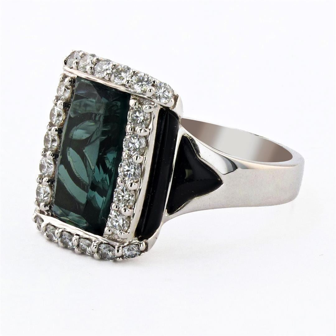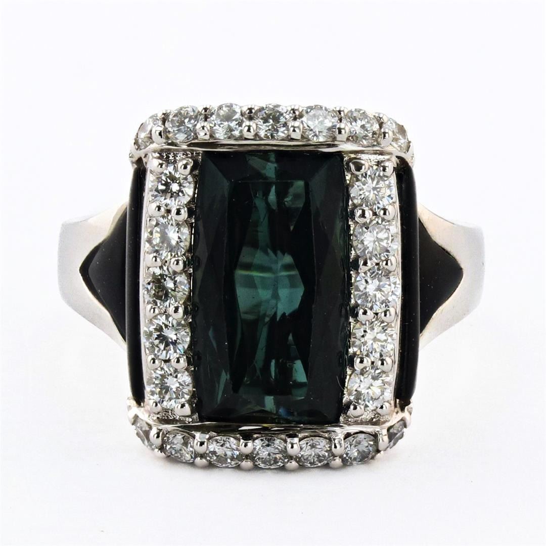 3.43ct Tourmaline and 0.72ctw Diamond 18K White Gold Ring. DESCRIPTION: ONE 18K WHITE GOLD CUSTOM MADE LADY'S DIAMOND and GREEN TOURMALINE RING . 8.60 GR TW 1 - MAIN CENTER GEMSTONE(S): IDENTITY: ONE CENTER NATURAL GREEN TOURMALINE SET IN BEZEL SETTING STYLE CARAT WEIGHT: 3.43 CTS SHAPE and MEASUREMEMT: ELONGATED CUSHION CUT QUALITY: DARK BLUE/GREEN 2 - ADJACENT GEMSTONES: IDENTITY: NATURAL DIAMONDS SHAPE: ROUND BRILLIANT CUT CARAT WEIGHT: 0.72 CTS QUALITY: F/G COLOR RANGE, VS CLARITY ADDITIONAL CUSTOM CUT BLACK ONYX TW: 0.95 CT