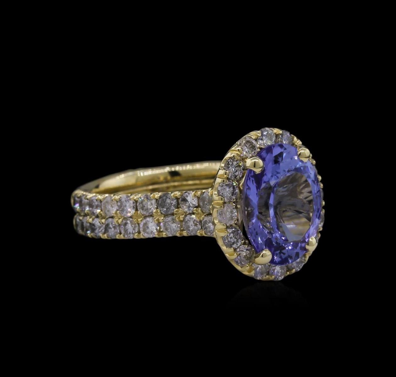 One electronically tested 14KT yellow gold lady's cast fashion ring with a cathedral shank with a halo with a bright polish finish. The featured lady's ring has a double shank measuring 4.24 millimeters wide. Identified with markings of "14K". Condition is new, good workmanship. Containing: One prong set oval modified brilliant cut natural tanzanite, measuring 10.96 x 8.90 x 5.10mm, approximate weight of 3.44ct., clarity is eye clean, type I, medium light, very slightly grayish, bluish violet color, (GIA bV 4/3), cut is good. Transmitting light with no distortion, transparent. Colored gemstones are presumed to have been subjected to commonly used enhancement processes. Graded in the setting. Fifty-Two prong set round brilliant cut diamonds, measuring 2.10 - 2.00 x 1.25mm (depth est.) approximate total weight of 52 Stones = 1.67ct. Graded in the setting. Clarity: SI-1 to I-1. Color: H - I. Cut Good. Total Weight of Colored Stones 3.44ct. Total Weight of Diamonds 1.67ct. Total Weight of Ring 6.20gm. GAS Appraised at $7,600.00.