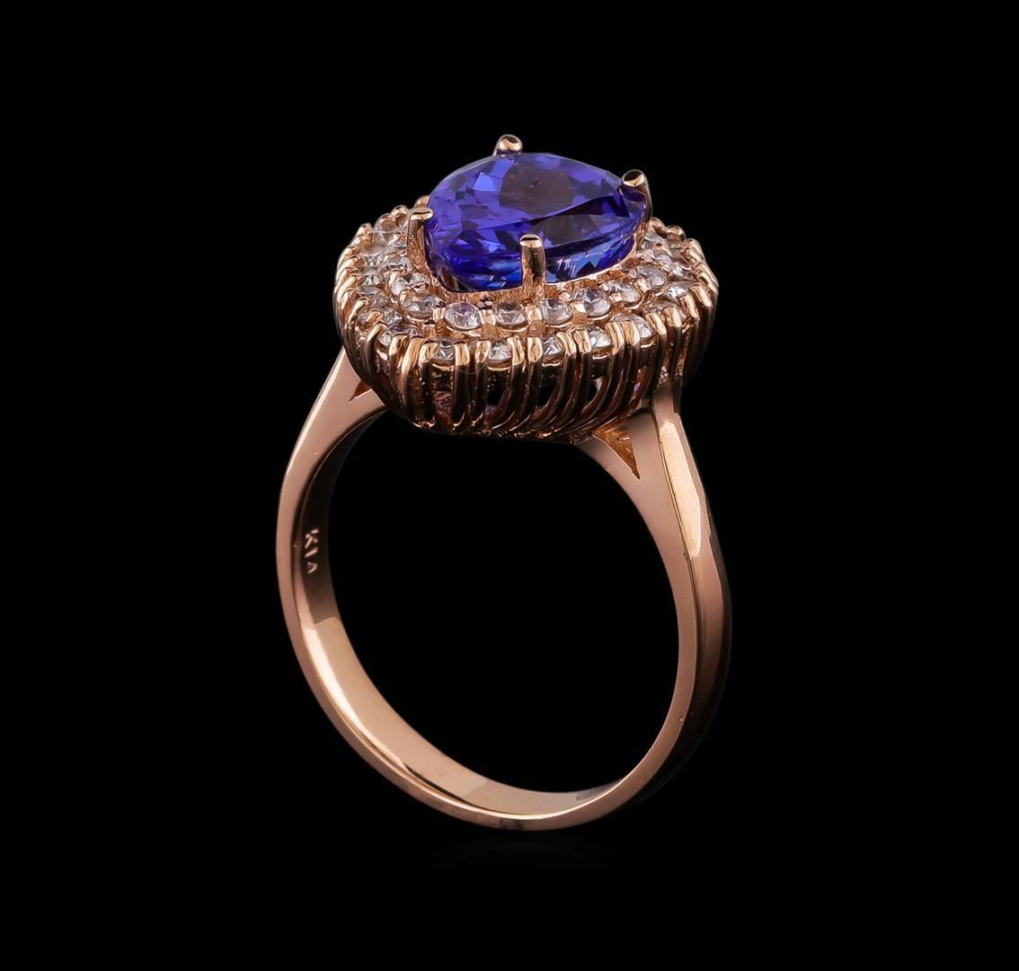 One electronically tested 14KT rose gold lady's cast fashion ring with a double basket halo with a bright polish finish. The featured lady's has a shank measuring 2.85 millimeters in width. Identified with markings of "K14". Condition is new, good workmanship. Containing: One prong set pear modified brilliant cut natural tanzanite, measuring 10.80 x 8.24 x 5.99mm, (depth est.) approximate weight of 3.45ct., clarity is eye clean, medium dark, moderately strong, bluish violet color, (GIA bV 6/4), cut is very good. Transmitting light with no distortion, transparent. Colored gemstones are presumed to have been subjected to commonly used enhancement processes. Graded in the setting. Twenty prong set round brilliant cut diamonds, measuring 1.90 - 1.85 x 1.17mm (depth est.) approximate total weight of 20 Stones = 0.50ct. Graded in the setting. Clarity: SI-1 to I-1. Color: H - I. Cut Good Nineteen prong set round brilliant cut diamonds, measuring 1.70 - 1.65 x 1.04mm (depth est.) approximate total weight of 19 Stones = 0.35ct. Graded in the setting. Clarity: SI-1 to SI-2. Color: H - I. Cut Good. Total Weight of Colored Stones 3.45ct. Total Weight of Diamonds 0.85ct. Total Weight of Ring 6.60gm.